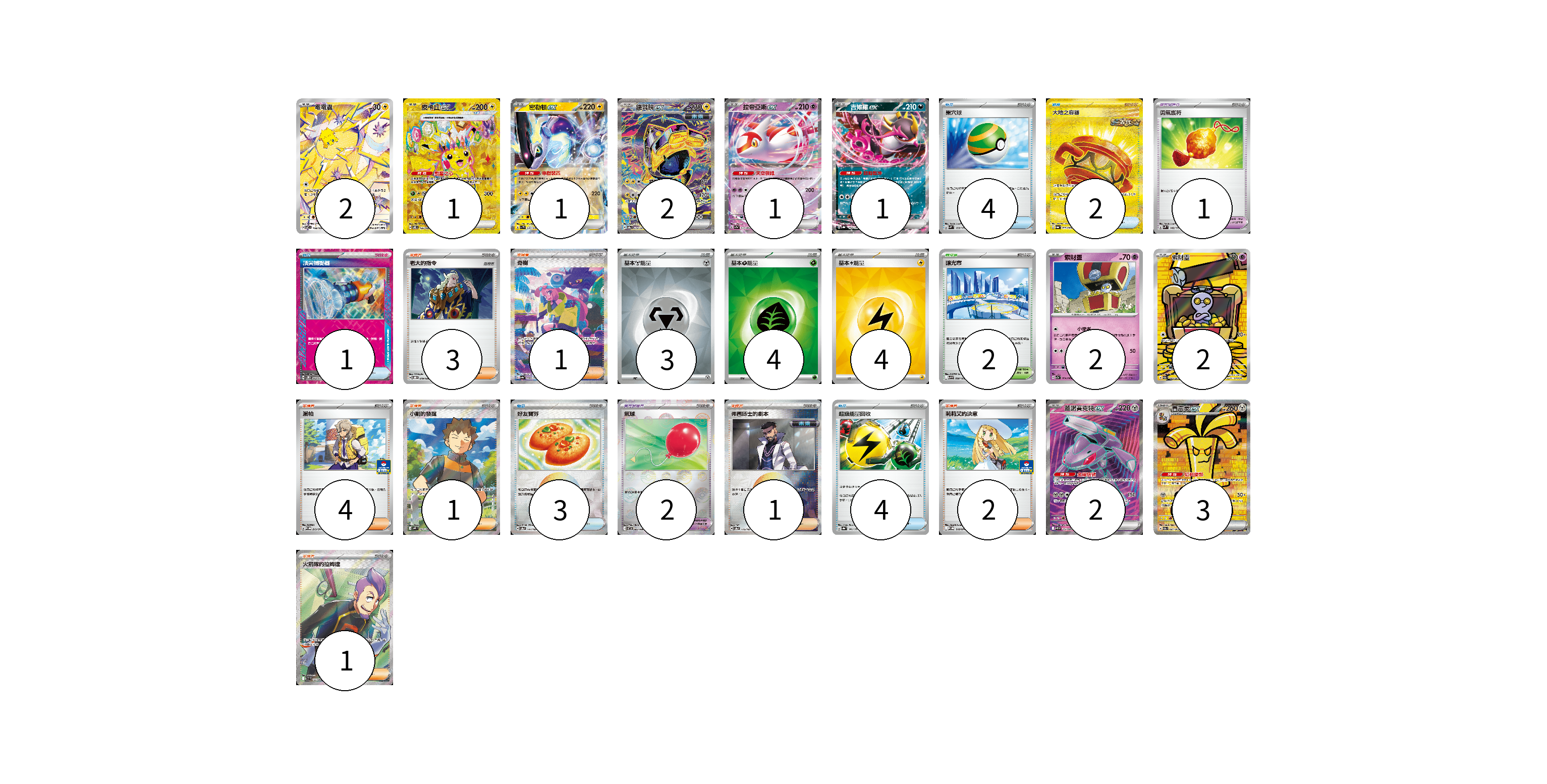 牌組構築方案 以此牌組為基礎新構築牌組 顯示卡面 顯示列表 寶可夢卡(17) 2 1 1 2 1 1 2 2 2 3 寶可夢道具(3) 1 2 物品卡(14) 4 2 1 3 4 支援者卡(13) 3 1 4 1 1 2 1 競技場卡(2) 2 能量卡(11) 3 4 4 寶可夢卡(17) 卡牌名稱 張數 卡牌名稱 張數 電電蟲 SV7 108/102 02 皮卡丘ex SV8 136/106 01 密勒頓ex SV1V 037/078 01 鐵臂膀ex SV8a 210/187 02 拉帝亞斯ex SV7a 019/064 01 吉雉雞ex SV8a 104/187 01 索財靈 SV7a 024/064 02 索財靈 SV3a 068/062 02 蓋諾賽克特ex SV11B 164/086 02 賽富豪ex SV3a 087/062 03 寶可夢道具(3) 卡牌名稱 張數 卡牌名稱 張數 勇氣護符 SVM 142/175 01 氣球 SV11B 082/086 02 物品卡(14) 卡牌名稱 張數 卡牌名稱 張數 巢穴球 SVM 133/175 04 大地之容器 SV6a 093/064 02 頂尖捕捉器 SV5M 062/071 01 好友寶芬 SV8a 147/187 03 超級能量回收 SV8a 141/187 04 支援者卡(13) 卡牌名稱 張數 卡牌名稱 張數 老大的指令 SVOD 019/020 03 奇樹 SV4a 350/190 01 派帕 SV-P 213/SV-P 04 小剛的發掘 SV9 123/100 01 弗圖博士的劇本 SV8a 175/187 01 莉莉艾的決意 M-P 018/M-P 02 火箭隊的拉姆達 SV10 122/098 01 競技場卡(2) 卡牌名稱 張數 卡牌名稱 張數 釀光市 SV9 098/100 02 能量卡(11) 卡牌名稱 張數 卡牌名稱 張數 基本【鋼】能量 SVOD MET 03 基本【草】能量 SVM GRA 04 基本【雷】能量 SVM LIG 04 以此牌組為基礎新構築牌組 牌組編碼 Swkrkx-hSWLMr-HqDyHf copy 列印牌組單 牌組編碼已複製 分享至SNS