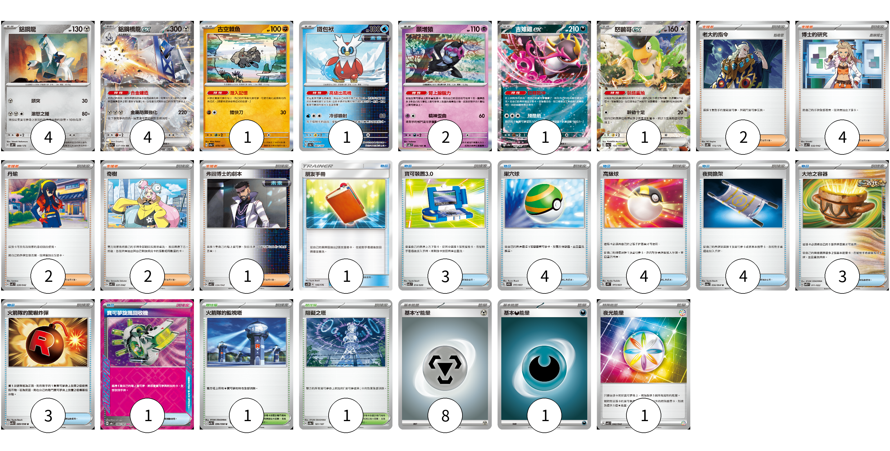 牌組構築方案 以此牌組為基礎新構築牌組 顯示卡面 顯示列表 寶可夢卡(14) 4 4 1 1 2 1 1 物品卡(23) 1 3 4 4 4 3 3 1 支援者卡(11) 2 4 2 2 1 競技場卡(2) 1 1 能量卡(10) 8 1 1 寶可夢卡(14) 卡牌名稱 張數 卡牌名稱 張數 鋁鋼龍 SVM 088/175 04 鋁鋼橋龍ex SV7a 037/064 04 古空棘魚 SV8a 079/187 01 鐵包袱 SV8a 047/187 01 願增猿 SV6 055/101 02 吉雉雞ex SV8a 104/187 01 怒鸚哥ex SV4a 154/190 01 物品卡(23) 卡牌名稱 張數 卡牌名稱 張數 朋友手冊 AC2D 145/176 01 寶可裝置3.0 SVEL 014/020 03 巢穴球 SVHM 012/022 04 高級球 SVHK 013/022 04 夜間擔架 SV6a 056/064 04 大地之容器 SVTS 011/022 03 火箭隊的驚嚇炸彈 SV10 089/098 03 寶可夢旋風回收機 SV6 093/101 01 支援者卡(11) 卡牌名稱 張數 卡牌名稱 張數 老大的指令 SVM 172/175 02 博士的研究 SVK 032/042 04 丹瑜 SVK 030/042 02 奇樹 SVK 031/042 02 弗圖博士的劇本 SVK 034/042 01 競技場卡(2) 卡牌名稱 張數 卡牌名稱 張數 火箭隊的監視塔 SV10 096/098 01 阻礙之塔 SV8a 181/187 01 能量卡(10) 卡牌名稱 張數 卡牌名稱 張數 基本鋼能量 sv-p MET 08 基本惡能量 sv-p DAR 01 夜光能量 SVK 042/042 01 以此牌組為基礎新構築牌組 牌組編碼 SzPSGx-wJgksr-UyKCCy copy 列印牌組單 牌組編碼已複製 分享至SNS