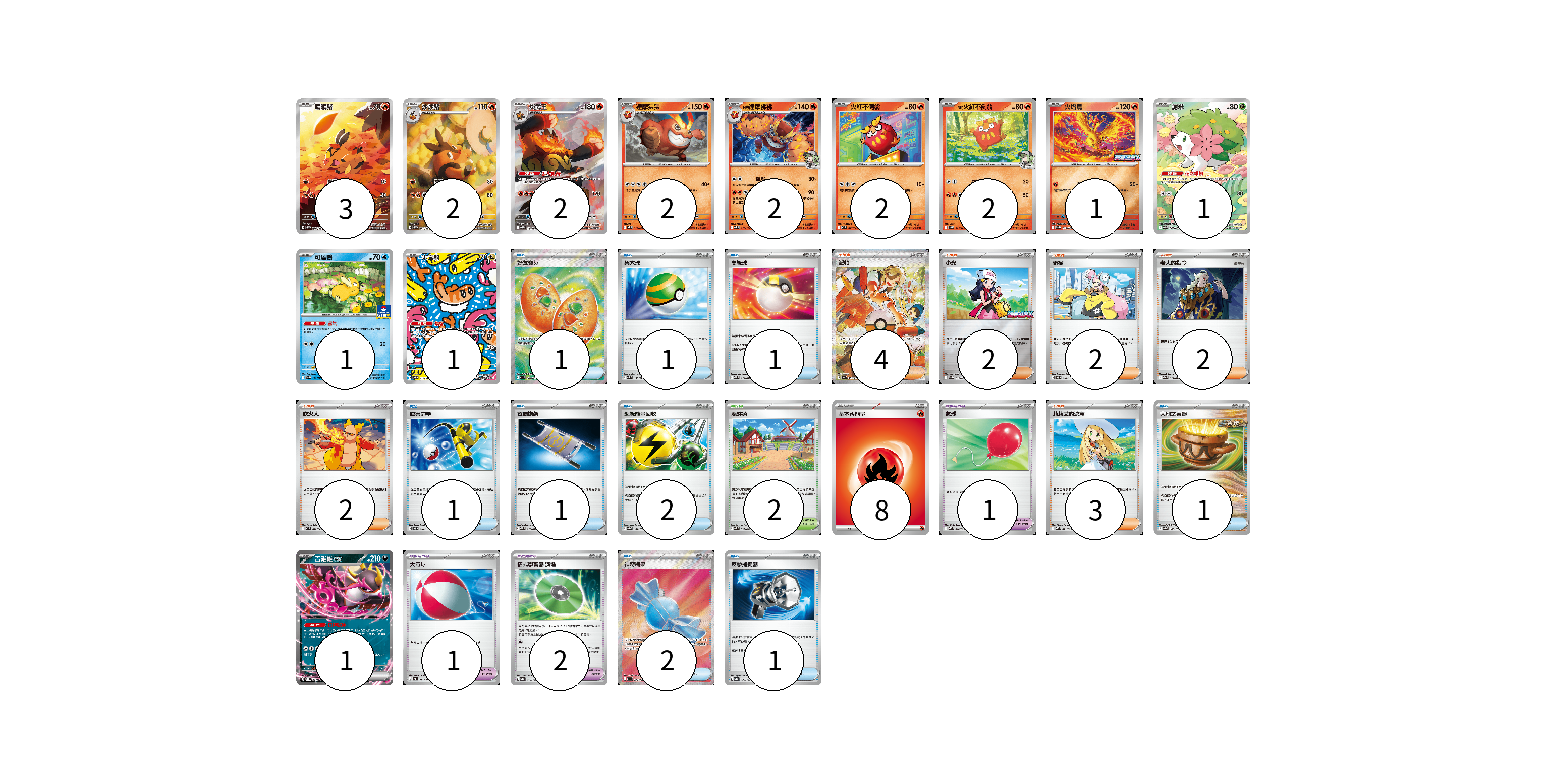 牌組構築方案 以此牌組為基礎新構築牌組 顯示卡面 顯示列表 寶可夢卡(20) 3 2 2 2 2 2 2 1 1 1 1 1 寶可夢道具(4) 1 1 2 物品卡(11) 1 1 1 1 1 2 1 2 1 支援者卡(15) 4 2 2 2 2 3 競技場卡(2) 2 能量卡(8) 8 寶可夢卡(20) 卡牌名稱 張數 卡牌名稱 張數 暖暖豬 SV11W 096/086 03 炒炒豬 SV11W 097/086 02 炎武王 SV11W 098/086 02 達摩狒狒 M2 016/080 02 N的達摩狒狒 SV9 016/100 02 火紅不倒翁 M2 015/080 02 N的火紅不倒翁 SV9 015/100 02 火焰鳥 M-P 022/M-P 01 謝米 SV9a 066/063 01 可達鴨 SV-P 220/SV-P 01 米立龍 SV6 112/101 01 吉雉雞ex SVOD 004/020 01 寶可夢道具(4) 卡牌名稱 張數 卡牌名稱 張數 氣球 MBD 018/022 01 大氣球 SV4a 165/190 01 招式學習器 演進 SV8a 160/187 02 物品卡(11) 卡牌名稱 張數 卡牌名稱 張數 好友寶芬 M1S 081/063 01 巢穴球 SVM 133/175 01 高級球 MBD 014/022 01 厲害釣竿 SVOD 010/020 01 夜間擔架 MBD 016/022 01 超級能量回收 SV8a 141/187 02 大地之容器 SV8a 143/187 01 神奇糖果 M1S 082/063 02 反擊捕捉器 SV8a 139/187 01 支援者卡(15) 卡牌名稱 張數 卡牌名稱 張數 派帕 SV4a 353/190 04 小光 M-P 028/M-P 02 奇樹 SVOD 016/020 02 老大的指令 MBG 021/022 02 吹火人 M2 078/080 02 莉莉艾的決意 MBD 021/022 03 競技場卡(2) 卡牌名稱 張數 卡牌名稱 張數 深缽鎮 SVK 039/042 02 能量卡(8) 卡牌名稱 張數 卡牌名稱 張數 基本火能量 sv-p FIR 08 以此牌組為基礎新構築牌組 牌組編碼 TALiUq-bLoglx-XvKayb copy 列印牌組單 牌組編碼已複製 分享至SNS