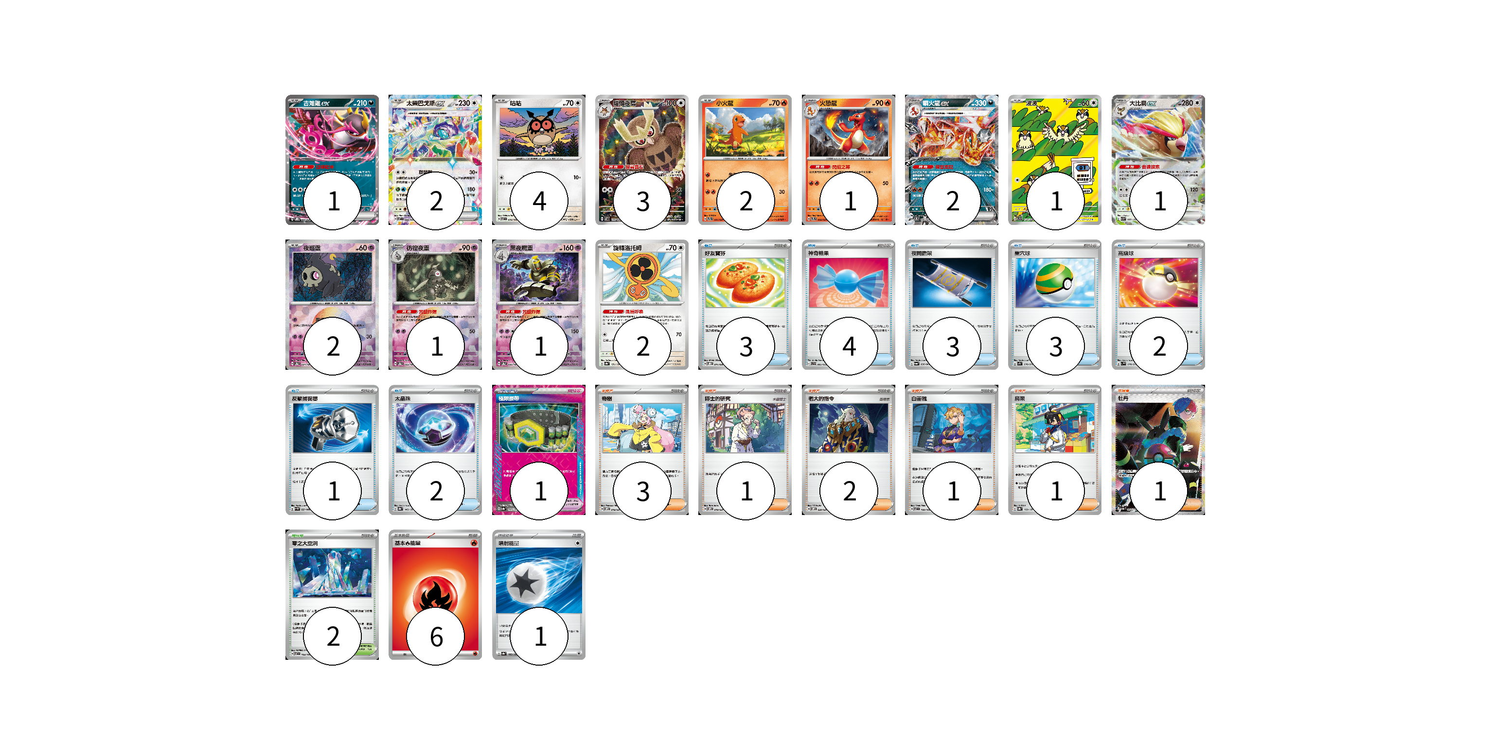 牌組構築方案 以此牌組為基礎新構築牌組 顯示卡面 顯示列表 寶可夢卡(23) 1 2 4 3 2 1 2 1 1 2 1 1 2 寶可夢道具(1) 1 物品卡(18) 3 4 3 3 2 1 2 支援者卡(9) 3 1 2 1 1 1 競技場卡(2) 2 能量卡(7) 6 1 寶可夢卡(23) 卡牌名稱 張數 卡牌名稱 張數 吉雉雞ex SVOD 004/020 01 太樂巴戈斯ex SV7 088/102 02 咕咕 SV7 076/102 04 貓頭夜鷹 SV7 114/102 03 小火龍 SVTL 001/021 02 火恐龍 SVTL 002/021 01 噴火龍ex SVTL 006/021 02 波波 SV3 118/108 01 大比鳥ex SV3 089/108 01 夜巡靈 SV8a 064/187 02 彷徨夜靈 SV8a 065/187 01 黑夜魔靈 SV8a 066/187 01 旋轉洛托姆 SV8a 131/187 02 寶可夢道具(1) 卡牌名稱 張數 卡牌名稱 張數 極限腰帶 SV8a 159/187 01 物品卡(18) 卡牌名稱 張數 卡牌名稱 張數 好友寶芬 SVOD 011/020 03 神奇糖果 SVB 003/028 04 夜間擔架 SV6a 056/064 03 巢穴球 SV1S 070/078 03 高級球 SV1V 070/078 02 反擊捕捉器 SV4M 059/066 01 太晶珠 SV8a 145/187 02 支援者卡(9) 卡牌名稱 張數 卡牌名稱 張數 奇樹 SVOM 018/021 03 博士的研究 SVOM 019/021 01 老大的指令 SVOM 020/021 02 白蕾雅 SV7 100/102 01 烏栗 SV8a 169/187 01 牡丹 SV4a 354/190 01 競技場卡(2) 卡牌名稱 張數 卡牌名稱 張數 零之大空洞 SV7 102/102 02 能量卡(7) 卡牌名稱 張數 卡牌名稱 張數 基本【火】能量 SVEL FIR 06 噴射能量 SV8a 185/187 01 以此牌組為基礎新構築牌組 牌組編碼 TDKkni-WWWQwB-oFwjUD copy 列印牌組單 牌組編碼已複製 分享至SNS