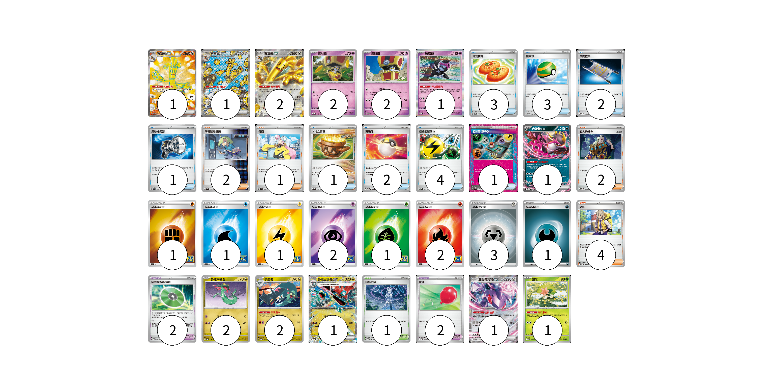 牌組構築方案 以此牌組為基礎新構築牌組 顯示卡面 顯示列表 寶可夢卡(17) 1 1 2 2 2 1 1 2 2 1 1 1 寶可夢道具(4) 2 2 物品卡(17) 3 3 2 1 1 2 4 1 支援者卡(9) 2 1 2 4 競技場卡(1) 1 能量卡(12) 1 1 1 2 1 2 3 1 寶可夢卡(17) 卡牌名稱 張數 卡牌名稱 張數 賽富豪ex SV3a 079/062 01 賽富豪ex SV8a 220/187 01 賽富豪ex SV8a 117/187 02 索財靈 SV8a 073/187 02 索財靈 SV7a 024/064 02 願增猿 SV8a 075/187 01 吉雉雞ex SVOD 004/020 01 多龍梅西亞 SV8a 118/187 02 多龍奇 SV8a 119/187 02 多龍巴魯托ex SV8a 120/187 01 蓋諾賽克特ex SV11B 069/086 01 謝米 SV9a 006/063 01 寶可夢道具(4) 卡牌名稱 張數 卡牌名稱 張數 招式學習器 演進 SV8a 160/187 02 氣球 SV11B 082/086 02 物品卡(17) 卡牌名稱 張數 卡牌名稱 張數 好友寶芬 SV8a 147/187 03 巢穴球 SVTS 013/022 03 夜間擔架 SVOM 016/021 02 反擊捕捉器 SV8a 139/187 01 大地之容器 SV8a 143/187 01 高級球 SVOD 012/020 02 超級能量回收 SV8a 141/187 04 能量輸送PRO SV7a 052/064 01 支援者卡(9) 卡牌名稱 張數 卡牌名稱 張數 暗碼迷的解讀 SV8a 165/187 02 奇樹 SVM 160/175 01 老大的指令 SVOD 019/020 02 派帕 SVOD 018/020 04 競技場卡(1) 卡牌名稱 張數 卡牌名稱 張數 阻礙之塔 SV8a 181/187 01 能量卡(12) 卡牌名稱 張數 卡牌名稱 張數 基本鬥能量 S8a FIG 01 基本水能量 S8a WAT 01 基本雷能量 S8a LIG 01 基本超能量 S8a PSY 02 基本草能量 S8a GRA 01 基本火能量 S8a FIR 02 基本【鋼】能量 SI MET 03 基本惡能量 sv-p DAR 01 以此牌組為基礎新構築牌組 牌組編碼 TDVFwo-BGWGbr-thVBMU copy 列印牌組單 牌組編碼已複製 分享至SNS