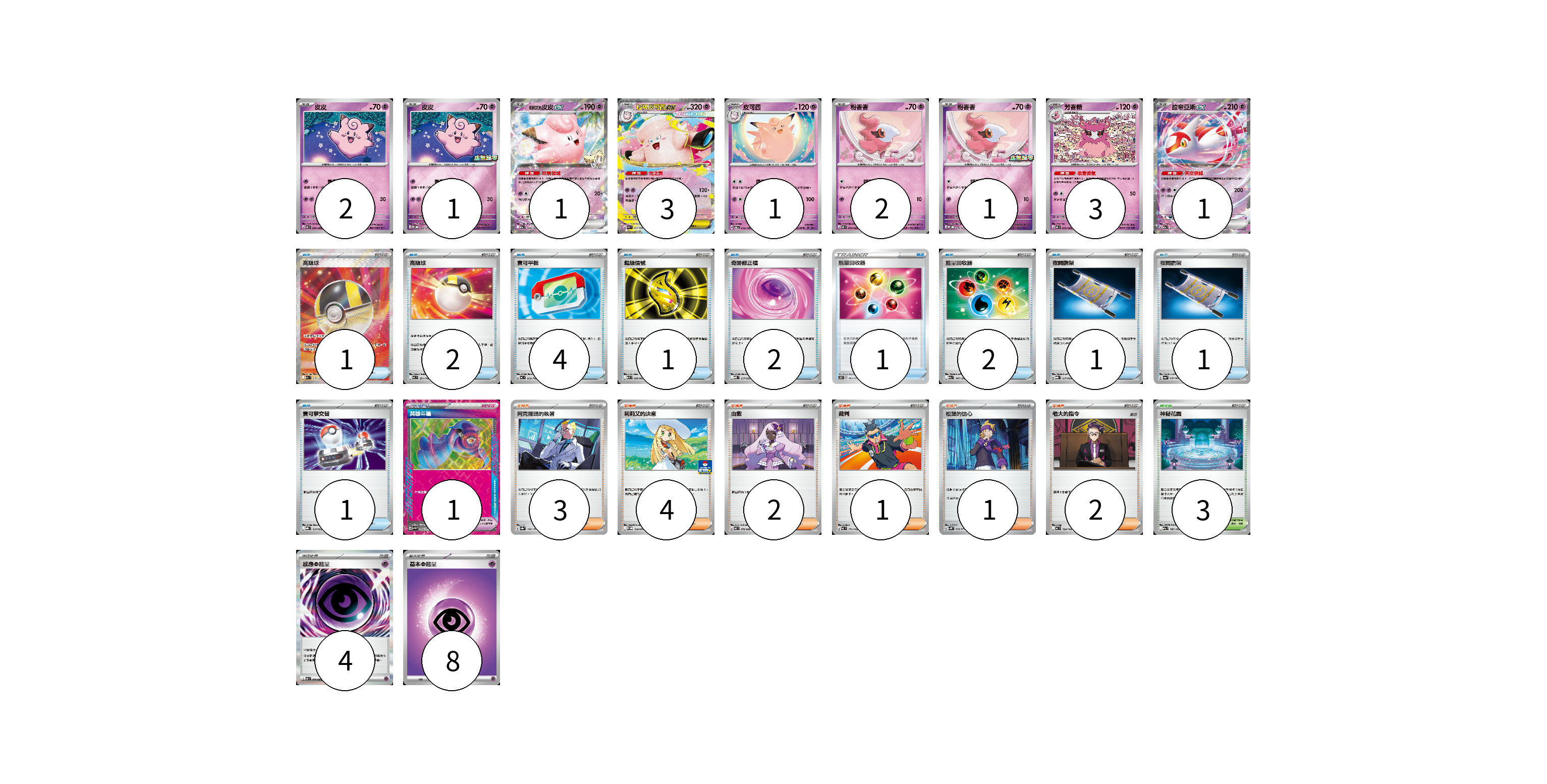 牌組構築方案 以此牌組為基礎新構築牌組 顯示卡面 顯示列表 寶可夢卡(15) 2 1 1 3 1 2 1 3 1 寶可夢道具(1) 1 物品卡(16) 1 2 4 1 2 1 2 1 1 1 支援者卡(13) 3 4 2 1 1 2 競技場卡(3) 3 能量卡(12) 4 8 寶可夢卡(15) 卡牌名稱 張數 卡牌名稱 張數 皮皮 M3 029/080 02 皮皮 M-P 068/M-P 01 莉莉艾的皮皮ex M2a 060/193 01 超級皮可西ex M3 030/080 03 皮可西 SV6 046/101 01 粉香香 M3 034/080 02 粉香香 M-P 070/M-P 01 芳香精 M3 035/080 03 拉帝亞斯ex M2a 075/193 01 寶可夢道具(1) 卡牌名稱 張數 卡牌名稱 張數 英雄斗篷 SV5M 064/071 01 物品卡(16) 卡牌名稱 張數 卡牌名稱 張數 高級球 M2a 216/193 01 高級球 MC 651/742 02 寶可平板 MC 662/742 04 超級信號 M1S 058/063 01 奇跡修正檔 MBD 017/022 02 能量回收器 S5R 062/070 01 能量回收器 M2a 147/193 02 夜間擔架 MBG 017/022 01 夜間擔架 SV6a 056/064 01 寶可夢交替 MBG 015/022 01 支援者卡(13) 卡牌名稱 張數 卡牌名稱 張數 阿克羅瑪的執著 SV8a 164/187 03 莉莉艾的決意 M-P 018/M-P 04 由紫 M3 076/080 02 裁判 MC 711/742 01 松葉的信心 SV5K 069/071 01 老大的指令 MC 724/742 02 競技場卡(3) 卡牌名稱 張數 卡牌名稱 張數 神秘花園 M2a 187/193 03 能量卡(12) 卡牌名稱 張數 卡牌名稱 張數 感應【超】能量 M3 079/080 04 基本【超】能量 MC PSY 08 以此牌組為基礎新構築牌組 牌組編碼 TFCtlN-kIlkjd-lFxjuP copy 列印牌組單 牌組編碼已複製 分享至SNS