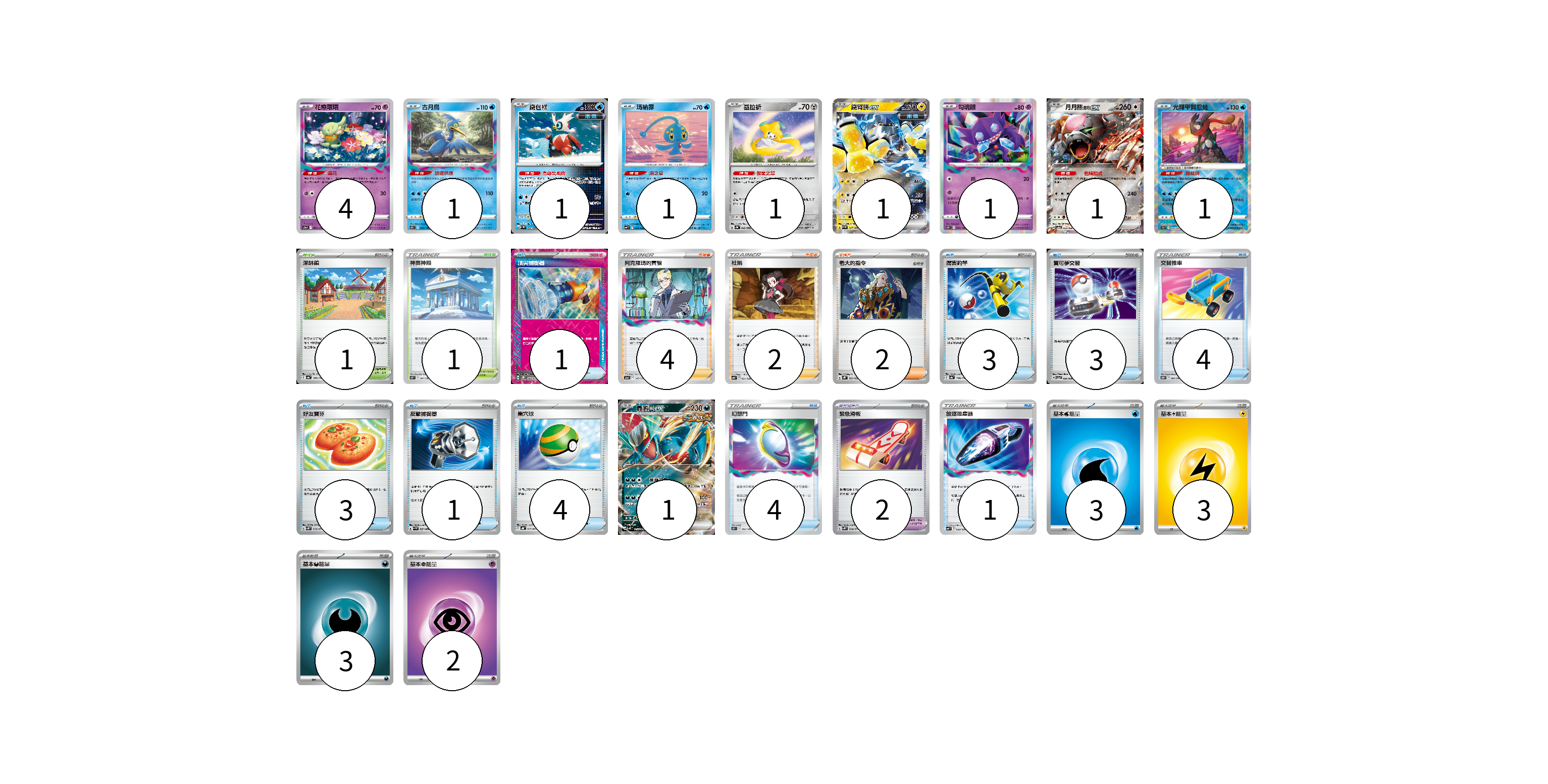 牌組構築方案 以此牌組為基礎新構築牌組 顯示卡面 顯示列表 寶可夢卡(13) 4 1 1 1 1 1 1 1 1 1 寶可夢道具(2) 2 物品卡(24) 1 3 3 4 3 1 4 4 1 支援者卡(8) 4 2 2 競技場卡(2) 1 1 能量卡(11) 3 3 3 2 寶可夢卡(13) 卡牌名稱 張數 卡牌名稱 張數 花療環環 S12a 064/172 04 古月鳥 S11 033/100 01 鐵包袱 SV4M 020/066 01 瑪納霏 SVF 003/038 01 基拉祈 SV3a 042/062 01 鐵臂膀ex SV4M 027/066 01 勾魂眼 S11 044/100 01 月月熊 赫月 ex SV5a 052/066 01 光輝甲賀忍蛙 S9a 026/067 01 轟鳴月ex SV4K 054/066 01 寶可夢道具(2) 卡牌名稱 張數 卡牌名稱 張數 緊急滑板 SV5K 064/071 02 物品卡(24) 卡牌名稱 張數 卡牌名稱 張數 頂尖捕捉器 SV5M 062/071 01 厲害釣竿 SV4a 158/190 03 寶可夢交替 SV5a 056/066 03 交替推車 S10D 060/067 04 好友寶芬 SV5K 063/071 03 反擊捕捉器 SV4M 059/066 01 巢穴球 SVHK 012/022 04 幻想門 S11 092/100 04 放逐吸塵器 SVF 023/038 01 支援者卡(8) 卡牌名稱 張數 卡牌名稱 張數 阿克羅瑪的實驗 S12a 148/172 04 杜娟 SVB 021/028 02 老大的指令 SVHK 022/022 02 競技場卡(2) 卡牌名稱 張數 卡牌名稱 張數 深缽鎮 SV4a 185/190 01 神奧神殿 S10P 067/067 01 能量卡(11) 卡牌名稱 張數 卡牌名稱 張數 基本水能量 sv-p WAT 03 基本【雷】能量 SVHM LIG 03 基本【惡】能量 SVF DAR 03 基本【超】能量 SVHM PSY 02 以此牌組為基礎新構築牌組 牌組編碼 TFfUiR-diYZfA-hvMDMd copy 列印牌組單 牌組編碼已複製 分享至SNS