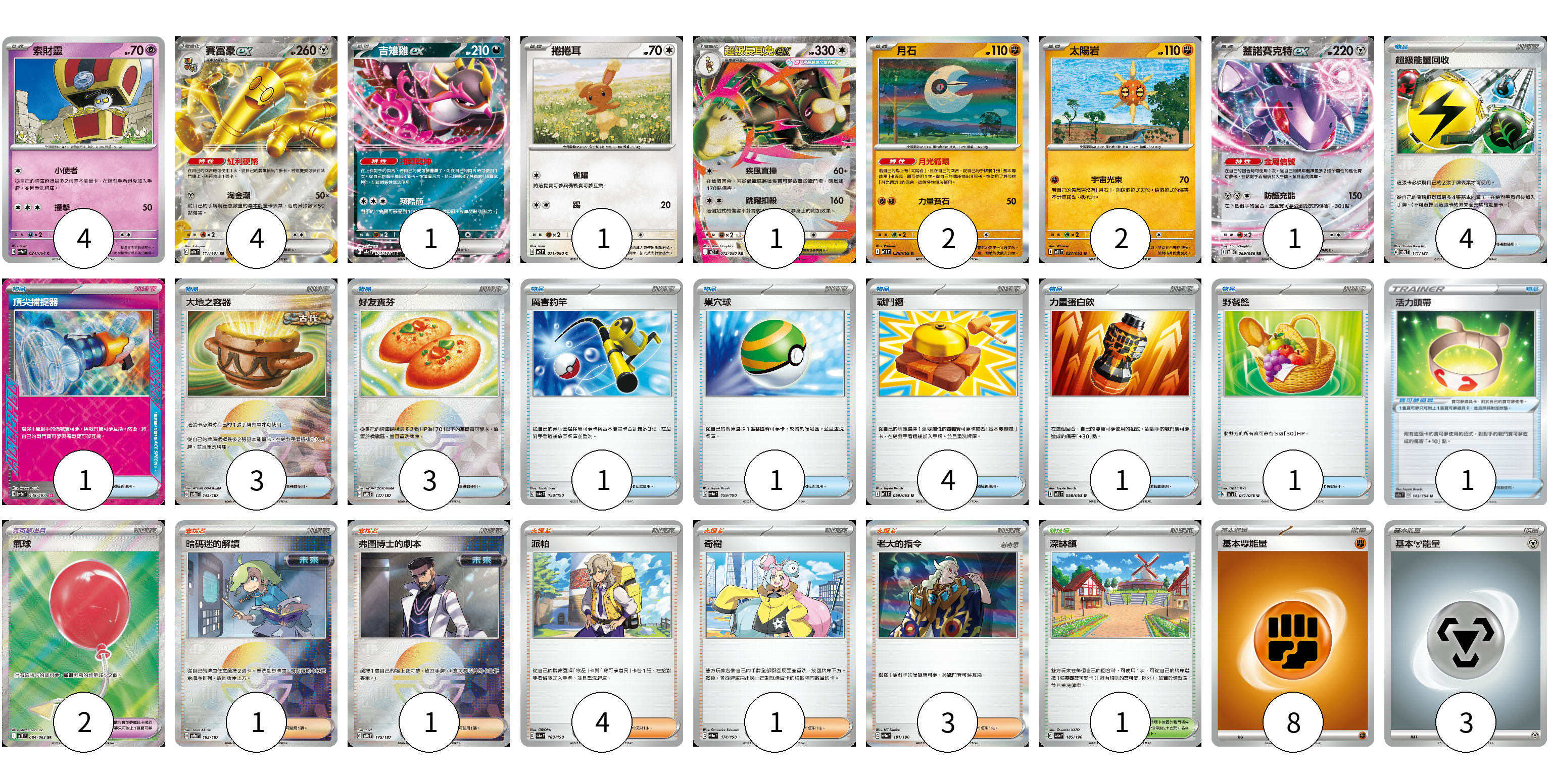牌組構築方案 以此牌組為基礎新構築牌組 顯示卡面 顯示列表 寶可夢卡(16) 4 4 1 1 1 2 2 1 寶可夢道具(3) 1 2 物品卡(19) 4 1 3 3 1 1 4 1 1 支援者卡(10) 1 1 4 1 3 競技場卡(1) 1 能量卡(11) 8 3 寶可夢卡(16) 卡牌名稱 張數 卡牌名稱 張數 索財靈 SV7a 024/064 04 賽富豪ex SV8a 117/187 04 吉雉雞ex SV8a 104/187 01 捲捲耳 M2 071/080 01 超級長耳兔ex M2 072/080 01 月石 M1L 026/063 02 太陽岩 M1L 027/063 02 蓋諾賽克特ex SV11B 069/086 01 寶可夢道具(3) 卡牌名稱 張數 卡牌名稱 張數 活力頭帶 SC1a 143/154 01 氣球 M1L 084/063 02 物品卡(19) 卡牌名稱 張數 卡牌名稱 張數 超級能量回收 SV8a 141/187 04 頂尖捕捉器 SV8a 148/187 01 大地之容器 SV8a 143/187 03 好友寶芬 SV8a 147/187 03 厲害釣竿 SV4a 158/190 01 巢穴球 SV4a 159/190 01 戰鬥鑼 M1L 059/063 04 力量蛋白飲 M1L 058/063 01 野餐籃 SV1V 071/078 01 支援者卡(10) 卡牌名稱 張數 卡牌名稱 張數 暗碼迷的解讀 SV8a 165/187 01 弗圖博士的劇本 SV8a 175/187 01 派帕 SV4a 180/190 04 奇樹 SV4a 174/190 01 老大的指令 SV4a 181/190 03 競技場卡(1) 卡牌名稱 張數 卡牌名稱 張數 深缽鎮 SV4a 185/190 01 能量卡(11) 卡牌名稱 張數 卡牌名稱 張數 基本【鬥】能量 SVAM FIG 08 基本鋼能量 sv-p MET 03 以此牌組為基礎新構築牌組 牌組編碼 TGlhFf-RAaRHr-dEXUFd copy 列印牌組單 牌組編碼已複製 分享至SNS