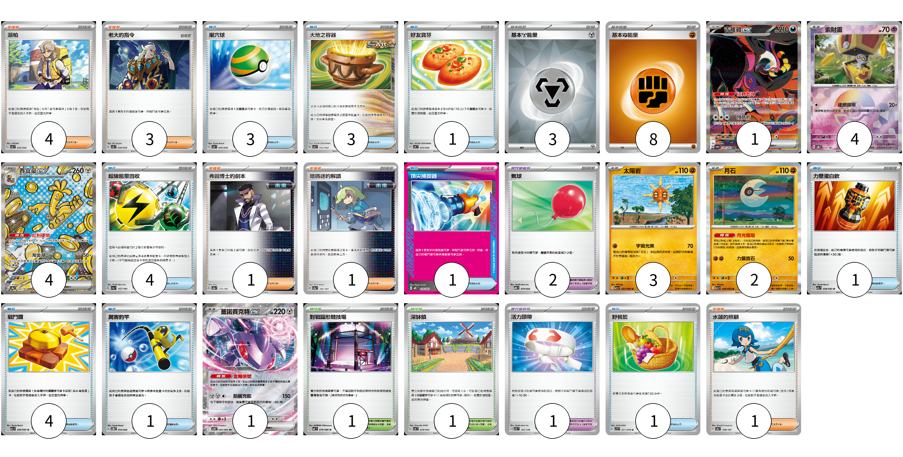 牌組構築方案 以此牌組為基礎新構築牌組 顯示卡面 顯示列表 寶可夢卡(15) 1 4 4 3 2 1 寶可夢道具(3) 2 1 物品卡(19) 3 3 1 4 1 1 4 1 1 支援者卡(10) 4 3 1 1 1 競技場卡(2) 1 1 能量卡(11) 3 8 寶可夢卡(15) 卡牌名稱 張數 卡牌名稱 張數 吉雉雞ex SV6a 089/064 01 索財靈 SV8a 073/187 04 賽富豪ex SV8a 220/187 04 太陽岩 M1L 027/063 03 月石 M1L 026/063 02 蓋諾賽克特ex SV11B 069/086 01 寶可夢道具(3) 卡牌名稱 張數 卡牌名稱 張數 氣球 MBG 019/022 02 活力頭帶 SVD 125/139 01 物品卡(19) 卡牌名稱 張數 卡牌名稱 張數 巢穴球 SVK 016/042 03 大地之容器 SVK 012/042 03 好友寶芬 SVK 015/042 01 超級能量回收 SV4a 157/190 04 頂尖捕捉器 MBG 014/022 01 力量蛋白飲 M1L 058/063 01 戰鬥鑼 M1L 059/063 04 厲害釣竿 SVOD 010/020 01 野餐籃 SV1V 071/078 01 支援者卡(10) 卡牌名稱 張數 卡牌名稱 張數 派帕 SVK 035/042 04 老大的指令 SVK 036/042 03 弗圖博士的劇本 SV8a 175/187 01 暗碼迷的解讀 SV8a 165/187 01 水蓮的照顧 SV8a 168/187 01 競技場卡(2) 卡牌名稱 張數 卡牌名稱 張數 對戰圓形競技場 M2 079/080 01 深缽鎮 SVK 039/042 01 能量卡(11) 卡牌名稱 張數 卡牌名稱 張數 基本【鋼】能量 SVOD MET 03 基本【鬥】能量 SVHK FIG 08 以此牌組為基礎新構築牌組 牌組編碼 THAbnT-CQKzub-icAeMZ copy 列印牌組單 牌組編碼已複製 分享至SNS