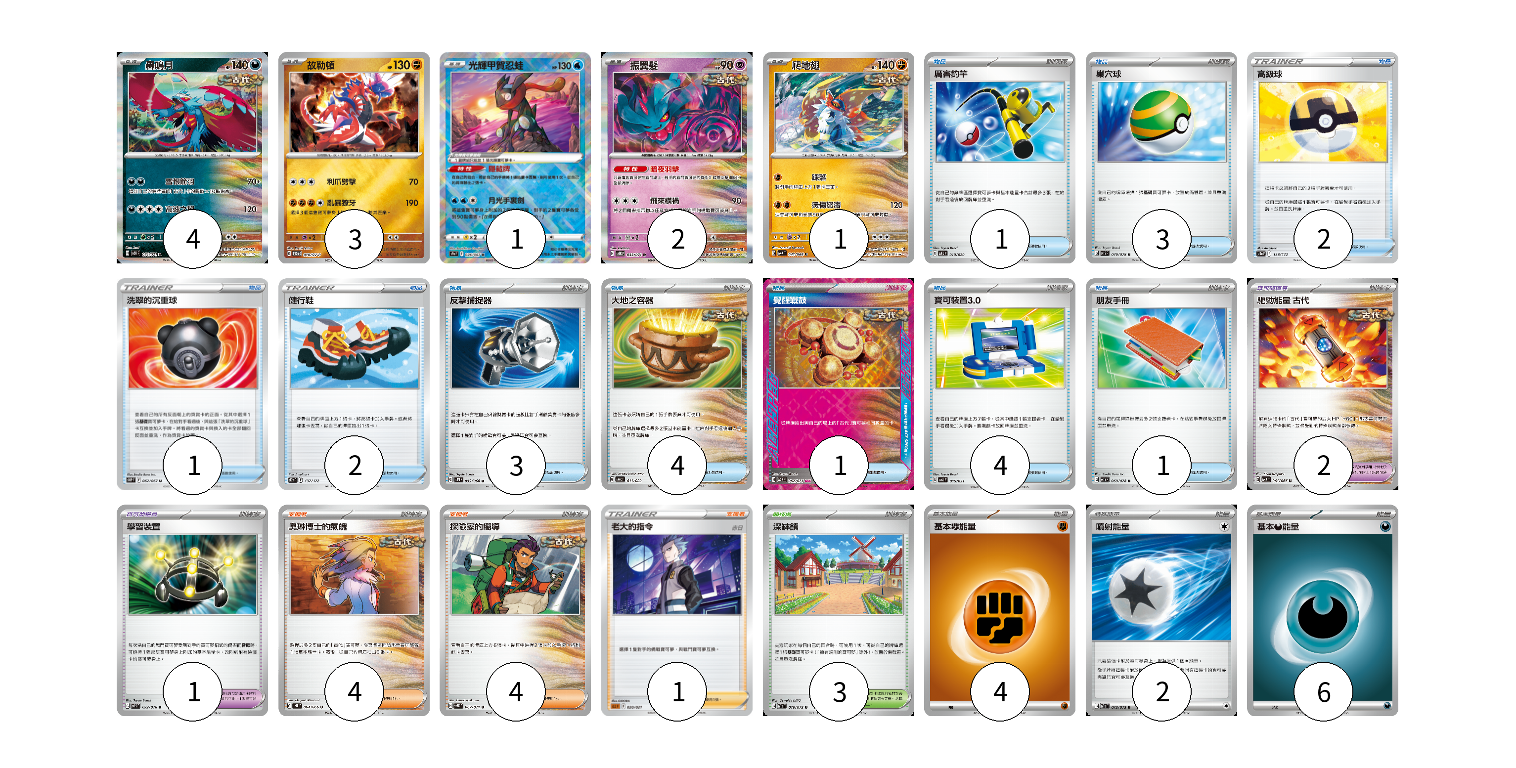 牌組構築方案 以此牌組為基礎新構築牌組 顯示卡面 顯示列表 寶可夢卡(12) 4 3 1 2 1 1 寶可夢道具(3) 2 1 物品卡(21) 3 2 1 2 3 4 1 4 1 支援者卡(9) 4 4 1 競技場卡(3) 3 能量卡(12) 4 2 6 寶可夢卡(12) 卡牌名稱 張數 卡牌名稱 張數 轟鳴月 SV5K 051/071 04 故勒頓 SV-P 010/SV-P 03 光輝甲賀忍蛙 S9a 026/067 01 振翼髮 SV5K 033/071 02 爬地翅 SV4K 041/066 01 厲害釣竿 SVEL 010/020 01 寶可夢道具(3) 卡牌名稱 張數 卡牌名稱 張數 驅勁能量 古代 SV4K 061/066 02 學習裝置 SV1S 072/078 01 物品卡(21) 卡牌名稱 張數 卡牌名稱 張數 巢穴球 SV1S 070/078 03 高級球 S12a 138/172 02 洗翠的沉重球 S10P 062/067 01 健行鞋 S12a 137/172 02 反擊捕捉器 SV4M 059/066 03 大地之容器 SVHK 011/022 04 覺醒戰鼓 SV5K 062/071 01 寶可裝置3.0 SVAL 015/021 04 朋友手冊 SV1S 069/078 01 支援者卡(9) 卡牌名稱 張數 卡牌名稱 張數 奧琳博士的氣魄 SV4K 064/066 04 探險家的嚮導 SV5K 067/071 04 老大的指令(赤日) SLL 020/021 01 競技場卡(3) 卡牌名稱 張數 卡牌名稱 張數 深缽鎮 SV1a 070/073 03 能量卡(12) 卡牌名稱 張數 卡牌名稱 張數 基本【鬥】能量 SVAM FIG 04 噴射能量 SV1a 072/073 02 基本惡能量 sv-p DAR 06 以此牌組為基礎新構築牌組 牌組編碼 THsEuU-QeKVNq-ZaFRXG copy 列印牌組單 牌組編碼已複製 分享至SNS
