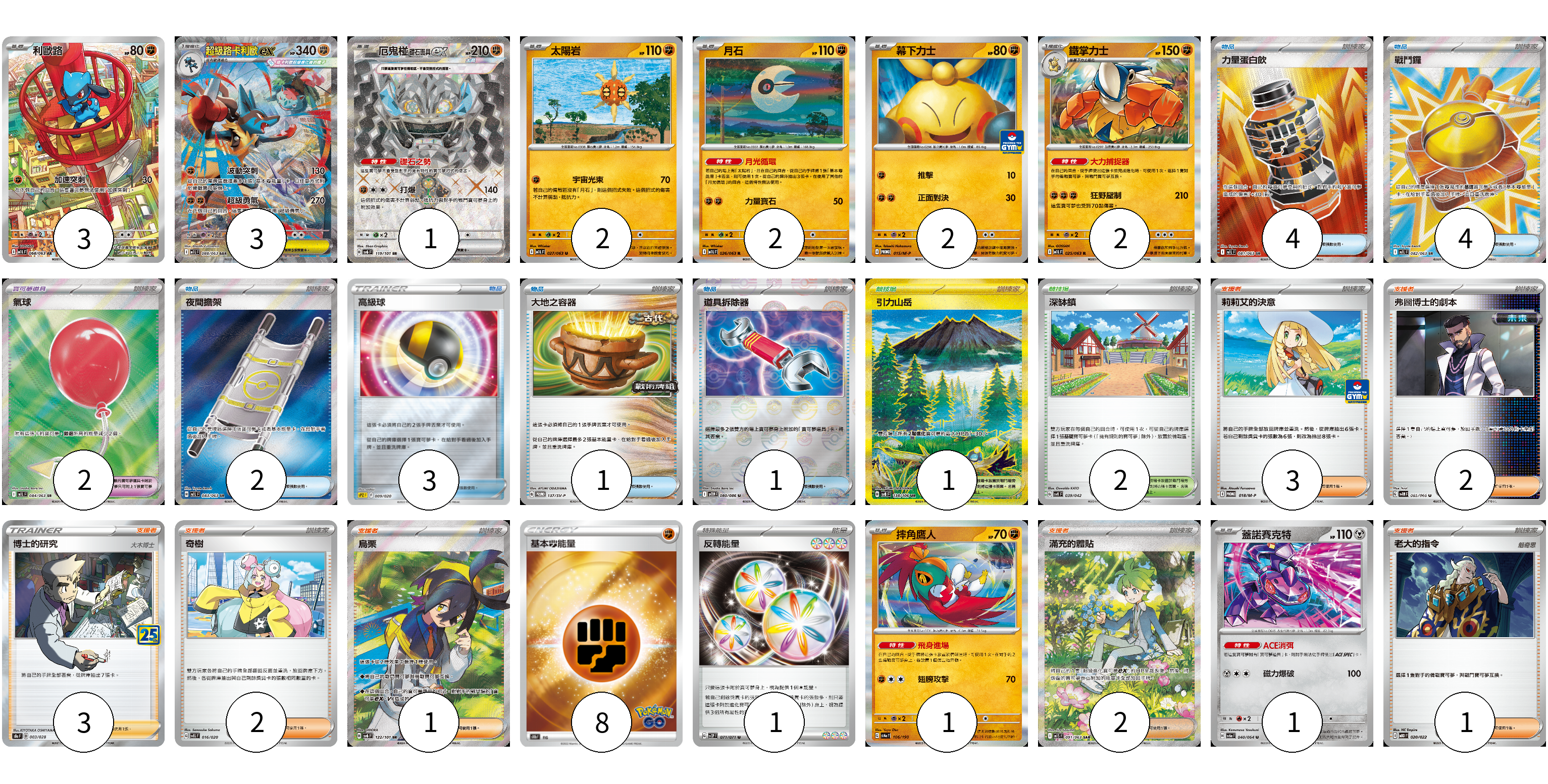 牌組構築方案 以此牌組為基礎新構築牌組 顯示卡面 顯示列表 寶可夢卡(17) 3 3 1 2 2 2 2 1 1 寶可夢道具(2) 2 物品卡(15) 4 4 2 3 1 1 支援者卡(14) 3 2 3 2 1 2 1 競技場卡(3) 1 2 能量卡(9) 8 1 寶可夢卡(17) 卡牌名稱 張數 卡牌名稱 張數 利歐路 M1L 068/063 03 超級路卡利歐ex M1L 088/063 03 厄鬼椪 礎石面具ex SV6 119/101 01 太陽岩 M1L 027/063 02 月石 M1L 026/063 02 幕下力士 M-P 015/M-P 02 鐵掌力士 M1L 025/063 02 摔角鷹人 SV4a 106/190 01 蓋諾賽克特 SV6a 040/064 01 寶可夢道具(2) 卡牌名稱 張數 卡牌名稱 張數 氣球 M1L 084/063 02 物品卡(15) 卡牌名稱 張數 卡牌名稱 張數 力量蛋白飲 M1L 081/063 04 戰鬥鑼 M1L 082/063 04 夜間擔架 M1L 083/063 02 高級球 SPZ 009/020 03 大地之容器 SV-P 137/SV-P 01 道具拆除器 SV11W 080/086 01 支援者卡(14) 卡牌名稱 張數 卡牌名稱 張數 莉莉艾的決意 M-P 018/M-P 03 弗圖博士的劇本 SV4M 065/066 02 博士的研究(大木博士) S8a 003/028 03 奇樹 SVEL 016/020 02 烏栗 SV6 122/101 01 滿充的體貼 M1S 091/063 02 老大的指令 MBD 020/022 01 競技場卡(3) 卡牌名稱 張數 卡牌名稱 張數 引力山岳 SV8 138/106 01 深缽鎮 SVK 039/042 02 能量卡(9) 卡牌名稱 張數 卡牌名稱 張數 基本鬥能量 S10b FIG 08 反轉能量 SV2P 071/071 01 以此牌組為基礎新構築牌組 牌組編碼 TMOKDd-GOJTHb-qFVRbM copy 列印牌組單 牌組編碼已複製 分享至SNS