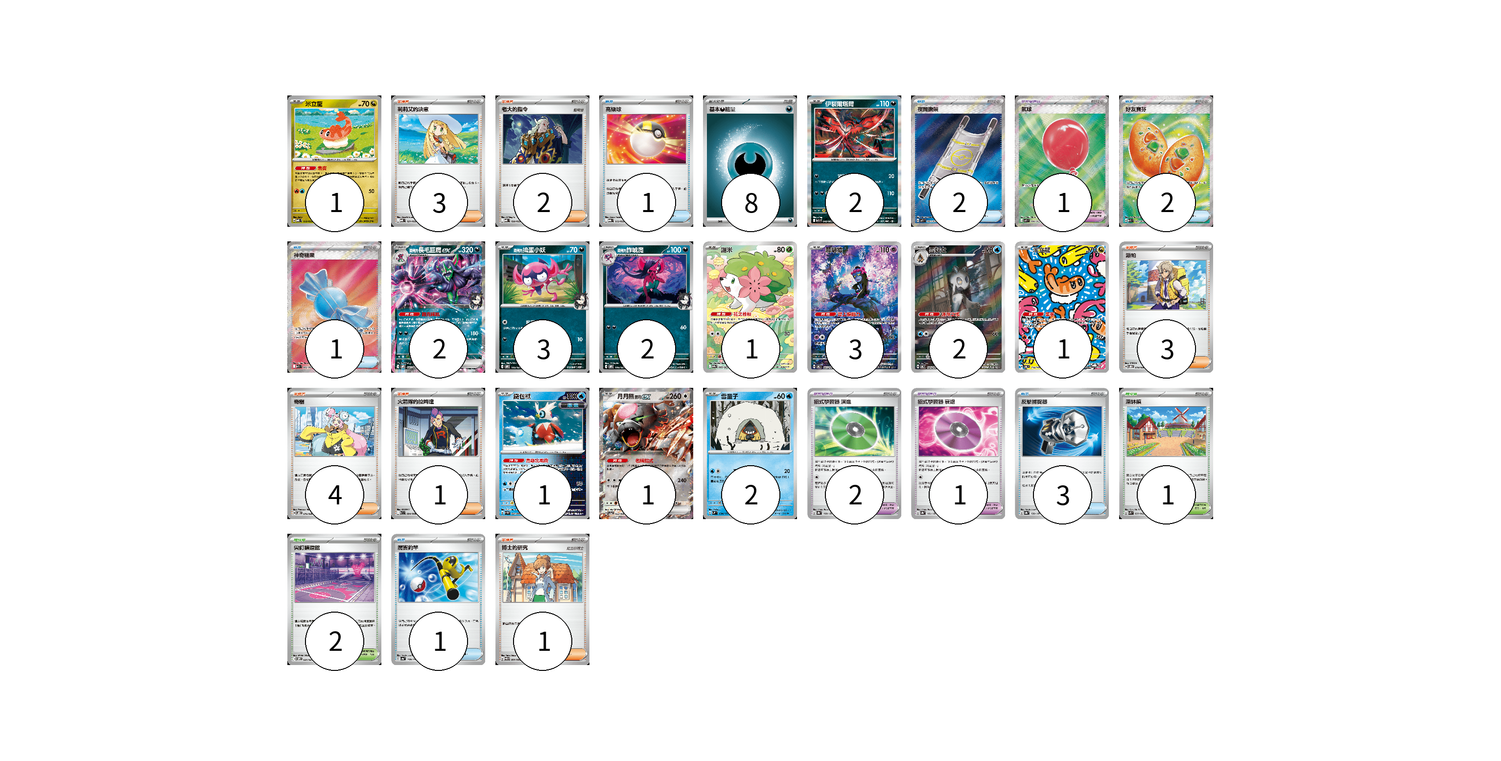 牌組構築方案 以此牌組為基礎新構築牌組 顯示卡面 顯示列表 寶可夢卡(21) 1 2 2 3 2 1 3 2 1 1 1 2 寶可夢道具(4) 1 2 1 物品卡(10) 1 2 2 1 3 1 支援者卡(14) 3 2 3 4 1 1 競技場卡(3) 1 2 能量卡(8) 8 寶可夢卡(21) 卡牌名稱 張數 卡牌名稱 張數 米立龍 MBD 010/022 01 伊裴爾塔爾 M1L 040/063 02 <瑪俐的>長毛巨魔ex SVOM 007/021 02 <瑪俐的>搗蛋小妖 SVOM 005/021 03 <瑪俐的>詐唬魔 SVOM 006/021 02 謝米 SV9a 066/063 01 願增猿 SV6 107/101 03 雪妖女 SV6 104/101 02 米立龍 SV6 112/101 01 鐵包袱 SV4M 020/066 01 月月熊 赫月 ex SV5a 052/066 01 雪童子 SVM 034/175 02 寶可夢道具(4) 卡牌名稱 張數 卡牌名稱 張數 氣球 M1L 084/063 01 招式學習器 演進 SV8a 160/187 02 招式學習器 衰退 SV8a 161/187 01 物品卡(10) 卡牌名稱 張數 卡牌名稱 張數 高級球 MBG 012/022 01 夜間擔架 M1L 083/063 02 好友寶芬 M1S 081/063 02 神奇糖果 M1S 082/063 01 反擊捕捉器 SV8a 139/187 03 厲害釣竿 SV4a 158/190 01 支援者卡(14) 卡牌名稱 張數 卡牌名稱 張數 莉莉艾的決意 MBD 021/022 03 老大的指令 MBD 020/022 02 派帕 SVOD 018/020 03 奇樹 SVOD 016/020 04 火箭隊的拉姆達 SV10 094/098 01 博士的研究 SV11B 084/086 01 競技場卡(3) 卡牌名稱 張數 卡牌名稱 張數 深缽鎮 SVK 039/042 01 尖釘鎮道館 SVOM 021/021 02 能量卡(8) 卡牌名稱 張數 卡牌名稱 張數 基本【惡】能量 MBG DAR 08 以此牌組為基礎新構築牌組 牌組編碼 TNDELY-sHhRKV-QbeTGy copy 列印牌組單 牌組編碼已複製 分享至SNS