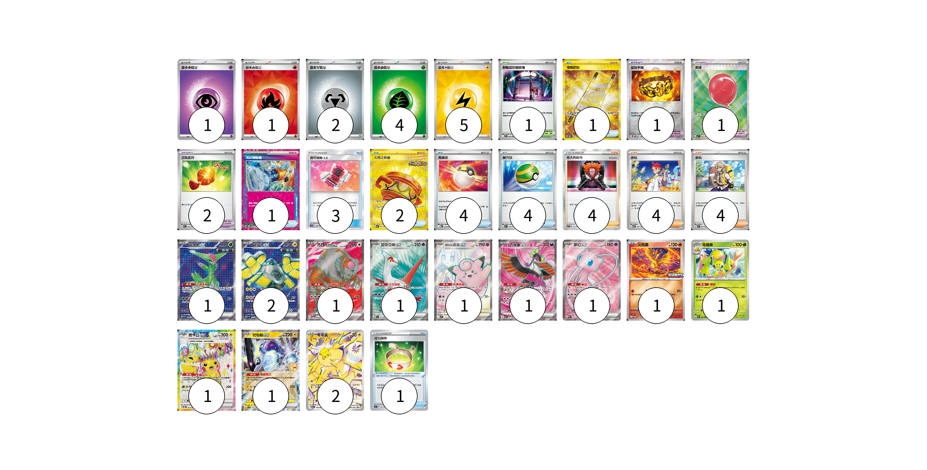 牌組構築方案 以此牌組為基礎新構築牌組 顯示卡面 顯示列表 寶可夢卡(14) 1 2 1 1 1 1 1 1 1 1 1 2 寶可夢道具(5) 1 1 2 1 物品卡(15) 1 1 3 2 4 4 支援者卡(12) 4 4 4 競技場卡(1) 1 能量卡(13) 1 1 2 4 5 寶可夢卡(14) 卡牌名稱 張數 卡牌名稱 張數 鐵斑葉ex SV5M 084/071 01 鐵臂膀ex SV4M 079/066 02 月月熊 赫月 ex SV5a 084/066 01 拉帝亞斯ex SV7a 078/064 01 莉莉艾的皮皮ex SV9 115/100 01 吉雉雞ex SV6a 081/064 01 夢幻ex SV2a 195/165 01 火焰鳥 M-P 022/M-P 01 電蜘蛛 SV6a 002/064 01 皮卡丘ex SV8 122/106 01 密勒頓ex SV-P 164/SV-P 01 電電蟲 SV7 108/102 02 寶可夢道具(5) 卡牌名稱 張數 卡牌名稱 張數 猛攻手鐲 SV11W 082/086 01 氣球 M1L 084/063 01 勇氣護符 SVK 024/042 02 活力頭帶 SC1a 143/154 01 物品卡(15) 卡牌名稱 張數 卡牌名稱 張數 夜間擔架 SV8 137/106 01 頂尖捕捉器 SV5M 062/071 01 寶可齒輪3.0 AS6b 190/194 03 大地之容器 SV6a 093/064 02 高級球 MBD 014/022 04 巢穴球 SVM 133/175 04 支援者卡(12) 卡牌名稱 張數 卡牌名稱 張數 老大的指令(弗拉達利) S8b 158/184 04 赤松 SV8a 163/187 04 派帕 SVK 035/042 04 競技場卡(1) 卡牌名稱 張數 卡牌名稱 張數 對戰圓形競技場 M2 079/080 01 能量卡(13) 卡牌名稱 張數 卡牌名稱 張數 基本【超】能量 M-P PSY 01 基本【火】能量 SVQL FIR 01 基本【鋼】能量 M-P MET 02 基本【草】能量 M-P GRA 04 基本【雷】能量 SVQP LIG 05 以此牌組為基礎新構築牌組 牌組編碼 TOsgCh-dwJkUP-VWExZr copy 列印牌組單 牌組編碼已複製 分享至SNS