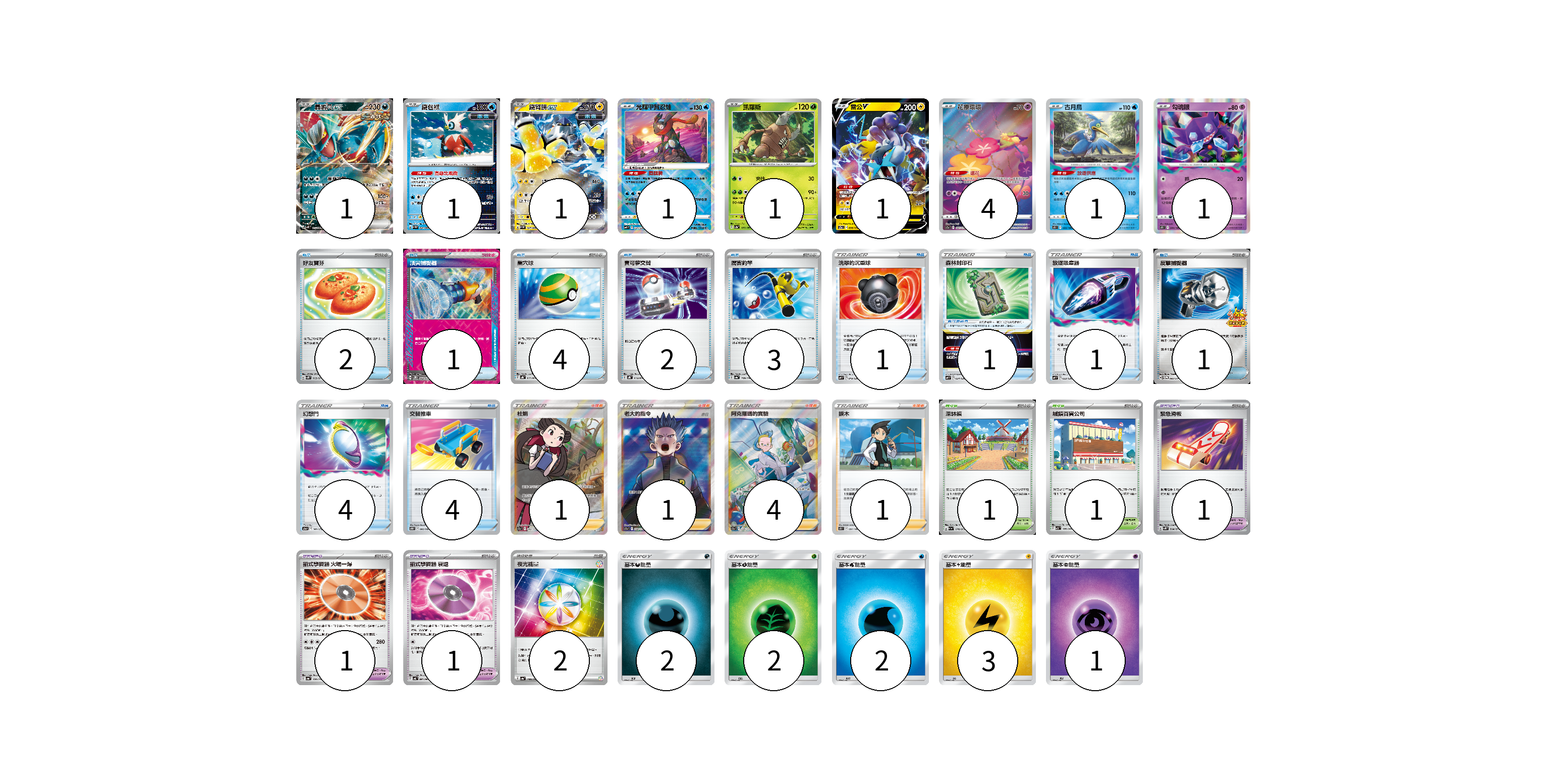 牌組構築方案 以此牌組為基礎新構築牌組 顯示卡面 顯示列表 寶可夢卡(12) 1 1 1 1 1 1 4 1 1 寶可夢道具(3) 1 1 1 物品卡(24) 2 1 4 2 3 1 1 1 1 4 4 支援者卡(7) 1 1 4 1 競技場卡(2) 1 1 能量卡(12) 2 2 2 2 3 1 寶可夢卡(12) 卡牌名稱 張數 卡牌名稱 張數 轟鳴月ex SV4K 054/066 01 鐵包袱 SV4M 020/066 01 鐵臂膀ex SV4M 027/066 01 光輝甲賀忍蛙 SVF 004/038 01 凱羅斯 SV2a 127/165 01 雷公V S12a 038/172 01 花療環環 S12a 187/172 04 古月鳥 S11 033/100 01 勾魂眼 S11 044/100 01 寶可夢道具(3) 卡牌名稱 張數 卡牌名稱 張數 緊急滑板 SV5K 064/071 01 招式學習器 火場一爆 SV4a 170/190 01 招式學習器 衰退 SV4K 063/066 01 物品卡(24) 卡牌名稱 張數 卡牌名稱 張數 好友寶芬 SV5K 063/071 02 頂尖捕捉器 SV5M 062/071 01 巢穴球 SVHK 012/022 04 寶可夢交替 SVHK 014/022 02 厲害釣竿 SV4a 158/190 03 洗翠的沉重球 SVF 019/038 01 森林封印石 SVF 024/038 01 放逐吸塵器 SVF 023/038 01 反擊捕捉器 SV-P 083/SV-P 01 幻想門 S12a 141/172 04 交替推車 S10D 060/067 04 支援者卡(7) 卡牌名稱 張數 卡牌名稱 張數 杜娟 S12a 242/172 01 老大的指令(赤日) S12a 250/172 01 阿克羅瑪的實驗 S12a 235/172 04 捩木 S11 097/100 01 競技場卡(2) 卡牌名稱 張數 卡牌名稱 張數 深缽鎮 SV1a 070/073 01 城鎮百貨公司 SV3 107/108 01 能量卡(12) 卡牌名稱 張數 卡牌名稱 張數 夜光能量 SV4a 190/190 02 基本惡能量 AS6D DAR 02 基本草能量 AS6D GRA 02 基本水能量 AS6D WAT 02 基本雷能量 AS6D LIG 03 基本超能量 AS6D PSY 01 以此牌組為基礎新構築牌組 牌組編碼 TQAGVp-WfNuIr-rljfjA copy 列印牌組單 牌組編碼已複製 分享至SNS