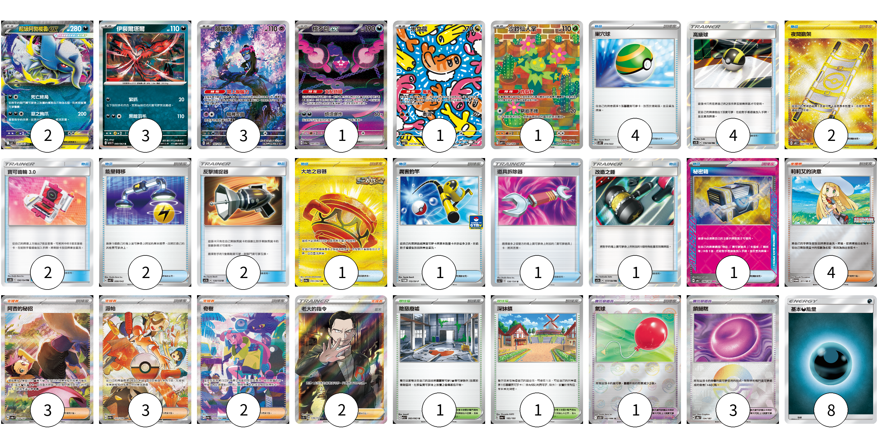 牌組構築方案 以此牌組為基礎新構築牌組 顯示卡面 顯示列表 寶可夢卡(11) 2 3 3 1 1 1 寶可夢道具(4) 1 3 物品卡(21) 4 4 2 2 2 2 1 1 1 1 1 支援者卡(14) 4 3 3 2 2 競技場卡(2) 1 1 能量卡(8) 8 寶可夢卡(11) 卡牌名稱 張數 卡牌名稱 張數 超級阿勃梭魯ex M1L 038/063 02 伊裴爾塔爾 M1L 040/063 03 願增猿 SV6 107/101 03 桃歹郎ex SV6a 090/064 01 米立龍 SV6 112/101 01 沙鈴仙人掌 SV9 101/100 01 寶可夢道具(4) 卡牌名稱 張數 卡牌名稱 張數 氣球 SV11B 082/086 01 鎖鏈糬 SV8a 154/187 03 物品卡(21) 卡牌名稱 張數 卡牌名稱 張數 巢穴球 SVAW 014/023 04 高級球 AS5b 178/186 04 夜間擔架 SV8 137/106 02 寶可齒輪3.0 AS6b 190/194 02 能量轉移 SVK 008/042 02 反擊捕捉器 AC1a 130/158 02 大地之容器 SV6a 093/064 01 厲害釣竿 SV-P 112/SV-P 01 道具拆除器 SC1a 138/154 01 改造之錘 AS5a 177/184 01 秘密箱 SV6 092/101 01 支援者卡(14) 卡牌名稱 張數 卡牌名稱 張數 莉莉艾的決意 M-P 011/M-P 04 阿杏的秘招 SV8a 228/187 03 派帕 SV4a 353/190 03 奇樹 SV4a 350/190 02 老大的指令(坂木) SC1b 170/153 02 競技場卡(2) 卡牌名稱 張數 卡牌名稱 張數 險惡廢墟 M1L 063/063 01 深缽鎮 SV4a 185/190 01 能量卡(8) 卡牌名稱 張數 卡牌名稱 張數 基本惡能量 AS6D DAR 08 以此牌組為基礎新構築牌組 牌組編碼 TSwBjs-plBKmt-tuhulE copy 列印牌組單 牌組編碼已複製 分享至SNS