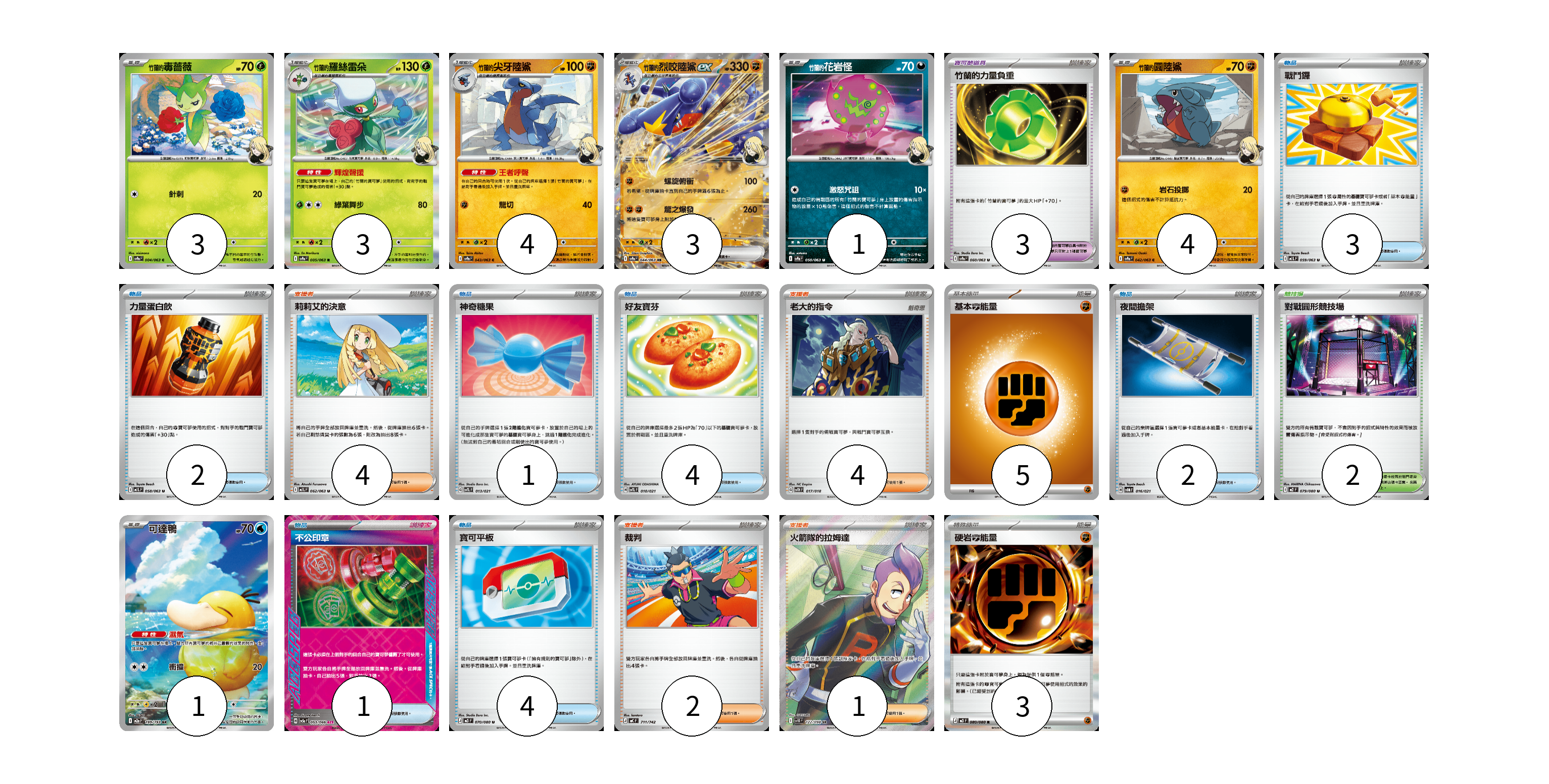 牌組構築方案 以此牌組為基礎新構築牌組 顯示卡面 顯示列表 寶可夢卡(19) 3 3 4 3 1 4 1 寶可夢道具(3) 3 物品卡(17) 3 2 1 4 2 1 4 支援者卡(11) 4 4 2 1 競技場卡(2) 2 能量卡(8) 5 3 寶可夢卡(19) 卡牌名稱 張數 卡牌名稱 張數 <竹蘭的>毒薔薇 SV9a 004/063 03 <竹蘭的>羅絲雷朵 SV9a 005/063 03 <竹蘭的>尖牙陸鯊 SV9a 043/063 04 <竹蘭的>烈咬陸鯊ex SV9a 044/063 03 <竹蘭的>花岩怪 SV9a 050/063 01 <竹蘭的>圓陸鯊 SV9a 042/063 04 可達鴨 M2a 199/193 01 寶可夢道具(3) 卡牌名稱 張數 卡牌名稱 張數 竹蘭的力量負重 SV9a 060/063 03 物品卡(17) 卡牌名稱 張數 卡牌名稱 張數 戰鬥鑼 M1L 059/063 03 力量蛋白飲 M1L 058/063 02 神奇糖果 SVTL 013/021 01 好友寶芬 SVTL 010/021 04 夜間擔架 SVOM 016/021 02 不公印章 SV5a 053/066 01 寶可平板 M3 070/080 04 支援者卡(11) 卡牌名稱 張數 卡牌名稱 張數 莉莉艾的決意 M1L 062/063 04 老大的指令 SVTH 017/018 04 裁判 MC 711/742 02 火箭隊的拉姆達 SV10 122/098 01 競技場卡(2) 卡牌名稱 張數 卡牌名稱 張數 對戰圓形競技場 M2 079/080 02 能量卡(8) 卡牌名稱 張數 卡牌名稱 張數 基本【鬥】能量 M-P FIG 05 硬岩【鬥】能量 M3 080/080 03 以此牌組為基礎新構築牌組 牌組編碼 TTMvtK-hLrqaQ-HvGtoL copy 列印牌組單 牌組編碼已複製 分享至SNS