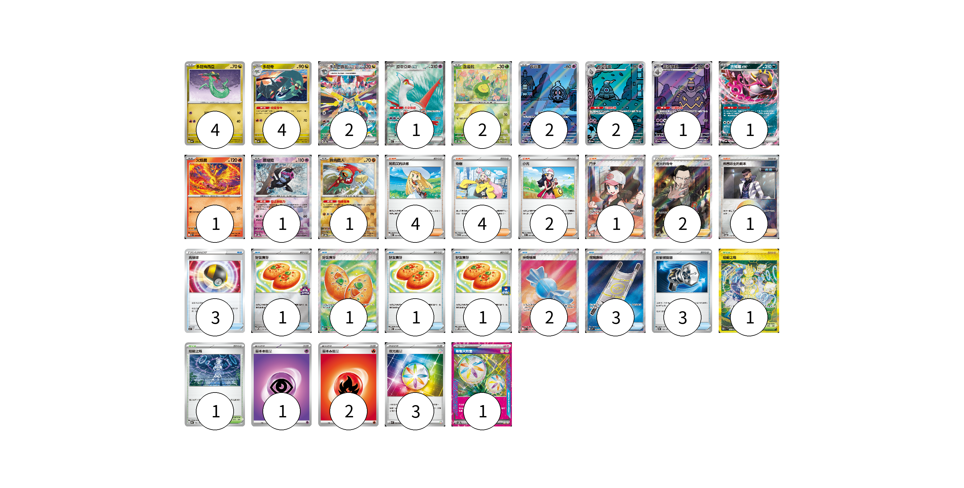 牌組構築方案 以此牌組為基礎新構築牌組 顯示卡面 顯示列表 寶可夢卡(22) 4 4 2 1 2 2 2 1 1 1 1 1 物品卡(15) 3 1 1 1 1 2 3 3 支援者卡(14) 4 4 2 1 2 1 競技場卡(2) 1 1 能量卡(7) 1 2 3 1 寶可夢卡(22) 卡牌名稱 張數 卡牌名稱 張數 多龍梅西亞 SV8a 118/187 04 多龍奇 SV8a 119/187 04 多龍巴魯托ex SV8a 221/187 02 拉帝亞斯ex SV7a 078/064 01 含羞苞 SV8a 001/187 02 夜巡靈 SV6a 068/064 02 彷徨夜靈 SV6a 069/064 02 黑夜魔靈 SV6a 070/064 01 吉雉雞ex SV8a 104/187 01 火焰鳥 M2 014/080 01 願增猿 SV8a 075/187 01 摔角鷹人 SV8a 084/187 01 物品卡(15) 卡牌名稱 張數 卡牌名稱 張數 高級球 SK 015/030 03 好友寶芬 SV-P 230/SV-P 01 好友寶芬 M1S 081/063 01 好友寶芬 MBD 013/022 01 好友寶芬 SV-P 212/SV-P 01 神奇糖果 M1S 082/063 02 夜間擔架 M1L 083/063 03 反擊捕捉器 SV8a 139/187 03 支援者卡(14) 卡牌名稱 張數 卡牌名稱 張數 莉莉艾的決意 MBD 021/022 04 奇樹 SVTR 017/021 04 小光 M2 077/080 02 鬥子 SV11W 166/086 01 老大的指令(坂木) SC1b 170/153 02 弗圖博士的劇本 SV8a 175/187 01 競技場卡(2) 卡牌名稱 張數 卡牌名稱 張數 阻礙之塔 SV10 132/098 01 阻礙之塔 SV8a 181/187 01 能量卡(7) 卡牌名稱 張數 卡牌名稱 張數 基本超能量 sv-p PSY 01 基本火能量 sv-p FIR 02 夜光能量 SVK 042/042 03 新衝天能量 SV5K 071/071 01 以此牌組為基礎新構築牌組 牌組編碼 TVECHe-qJmcpS-YjvPXo copy 列印牌組單 牌組編碼已複製 分享至SNS