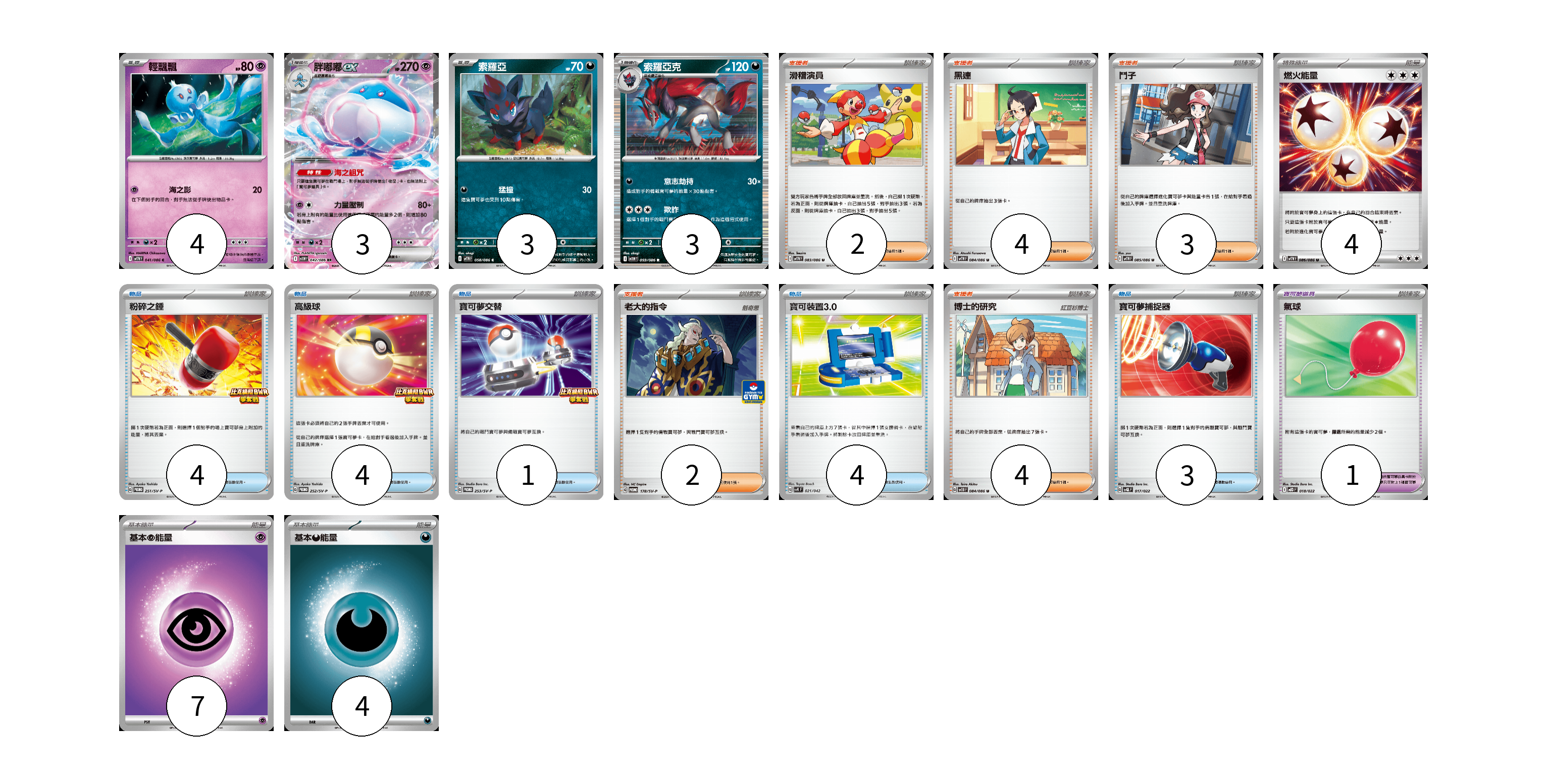 牌組構築方案 以此牌組為基礎新構築牌組 顯示卡面 顯示列表 寶可夢卡(13) 4 3 3 3 寶可夢道具(1) 1 物品卡(16) 4 4 1 4 3 支援者卡(15) 2 4 3 2 4 能量卡(15) 4 7 4 寶可夢卡(13) 卡牌名稱 張數 卡牌名稱 張數 輕飄飄 SV11W 041/086 04 胖嘟嘟ex SV11W 042/086 03 索羅亞 SV11W 058/086 03 索羅亞克 SV11W 059/086 03 寶可夢道具(1) 卡牌名稱 張數 卡牌名稱 張數 氣球 MBD 018/022 01 物品卡(16) 卡牌名稱 張數 卡牌名稱 張數 粉碎之錘 SV-P 251/SV-P 04 高級球 SV-P 252/SV-P 04 寶可夢交替 SV-P 253/SV-P 01 寶可裝置3.0 SVK 021/042 04 寶可夢捕捉器 SVQL 017/022 03 支援者卡(15) 卡牌名稱 張數 卡牌名稱 張數 滑稽演員 SV11W 083/086 02 黑連 SV11W 084/086 04 鬥子 SV11W 085/086 03 老大的指令 SV-P 178/SV-P 02 博士的研究 SV11B 084/086 04 能量卡(15) 卡牌名稱 張數 卡牌名稱 張數 燃火能量 SV11W 086/086 04 基本【超】能量 MBD PSY 07 基本【惡】能量 MBG DAR 04 以此牌組為基礎新構築牌組 牌組編碼 TWHIAm-iOaDdp-DZJoIr copy 列印牌組單 牌組編碼已複製 分享至SNS