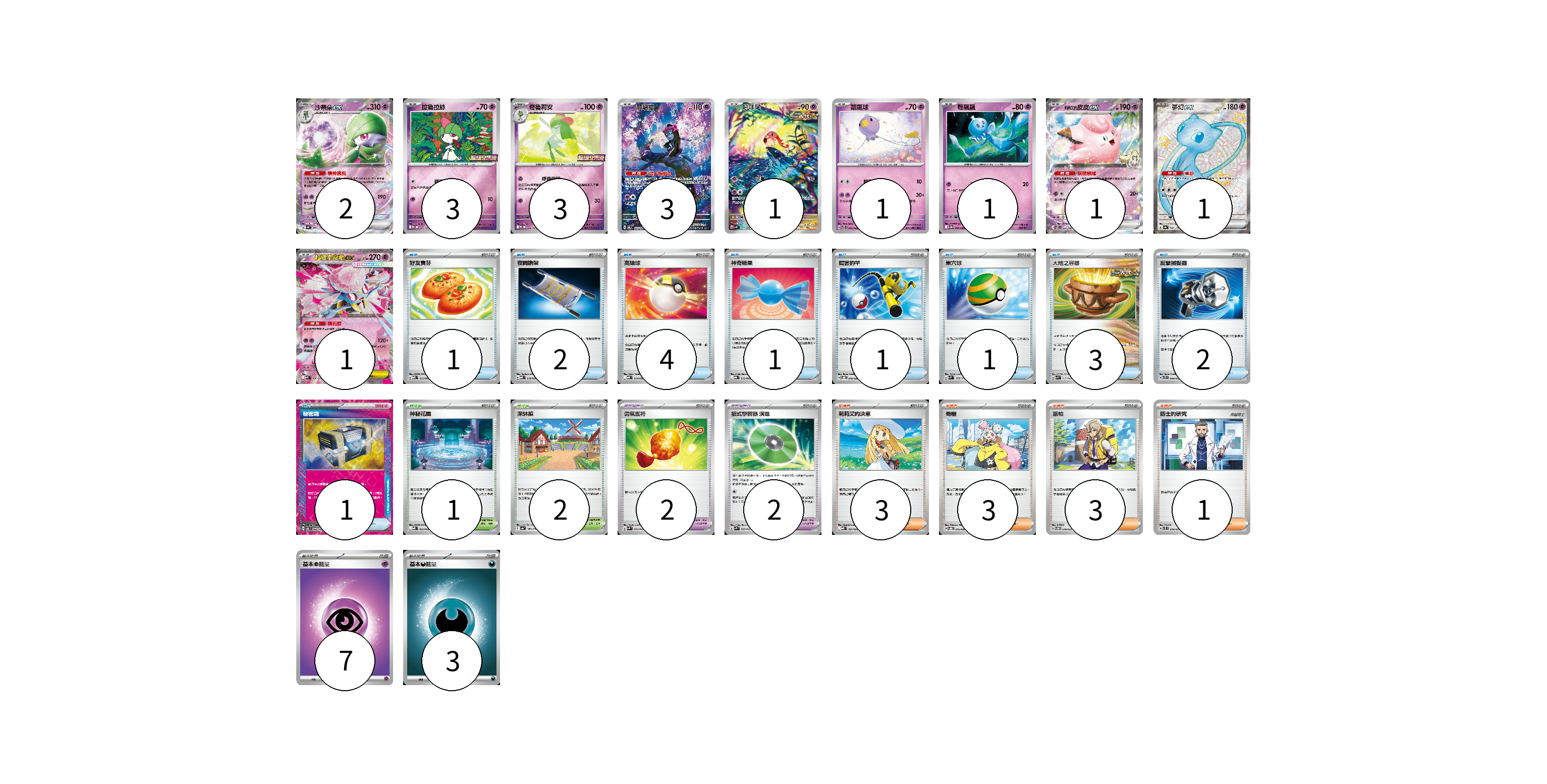 牌組構築方案 以此牌組為基礎新構築牌組 顯示卡面 顯示列表 寶可夢卡(17) 2 3 3 3 1 1 1 1 1 1 寶可夢道具(4) 2 2 物品卡(16) 1 2 4 1 1 1 3 2 1 支援者卡(10) 3 3 3 1 競技場卡(3) 1 2 能量卡(10) 7 3 寶可夢卡(17) 卡牌名稱 張數 卡牌名稱 張數 沙奈朵ex SV4a 082/190 02 拉魯拉絲 M-P 005/M-P 03 奇魯莉安 M-P 006/M-P 03 願增猿 SV6 107/101 03 吼叫尾 SV4K 071/066 01 飄飄球 SVTS 005/022 01 輕飄飄 SV11W 041/086 01 莉莉艾的皮皮ex SV9 033/100 01 夢幻ex SV4a 327/190 01 超級蒂安希ex MBD 006/022 01 寶可夢道具(4) 卡牌名稱 張數 卡牌名稱 張數 勇氣護符 SVK 024/042 02 招式學習器 演進 SVK 025/042 02 物品卡(16) 卡牌名稱 張數 卡牌名稱 張數 好友寶芬 MBD 013/022 01 夜間擔架 MBD 016/022 02 高級球 MBD 014/022 04 神奇糖果 MBG 013/022 01 厲害釣竿 SVOD 010/020 01 巢穴球 SVM 133/175 01 大地之容器 SVK 012/042 03 反擊捕捉器 SVTS 009/022 02 秘密箱 SV6 092/101 01 支援者卡(10) 卡牌名稱 張數 卡牌名稱 張數 莉莉艾的決意 MBD 021/022 03 奇樹 SVOD 016/020 03 派帕 SVTM 019/022 03 博士的研究 SVTL 019/021 01 競技場卡(3) 卡牌名稱 張數 卡牌名稱 張數 神秘花園 MBD 022/022 01 深缽鎮 SV4a 185/190 02 能量卡(10) 卡牌名稱 張數 卡牌名稱 張數 基本【超】能量 M-P PSY 07 基本【惡】能量 M-P DAR 03 以此牌組為基礎新構築牌組 牌組編碼 TXDRzX-DifEVw-KMoCiS copy 列印牌組單 牌組編碼已複製 分享至SNS