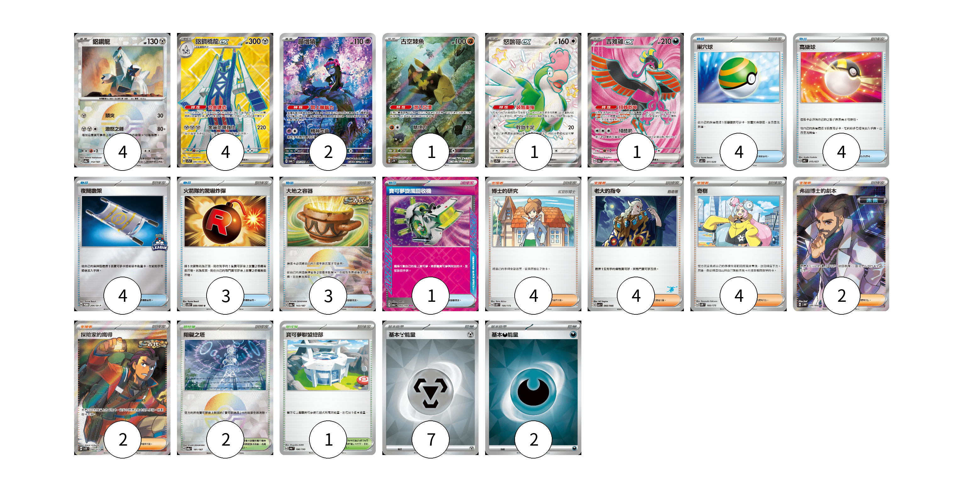 牌組構築方案 以此牌組為基礎新構築牌組 顯示卡面 顯示列表 寶可夢卡(13) 4 4 2 1 1 1 物品卡(19) 4 4 4 3 3 1 支援者卡(16) 4 4 4 2 2 競技場卡(3) 2 1 能量卡(9) 7 2 寶可夢卡(13) 卡牌名稱 張數 卡牌名稱 張數 鋁鋼龍 SV8a 112/187 04 鋁鋼橋龍ex SV7a 080/064 04 願增猿 SV6 107/101 02 古空棘魚 SV5K 077/071 01 怒鸚哥ex SV4a 337/190 01 吉雉雞ex SV6a 081/064 01 物品卡(19) 卡牌名稱 張數 卡牌名稱 張數 巢穴球 SVEL 011/020 04 高級球 SVHK 013/022 04 夜間擔架 SV-P 204/SV-P 04 火箭隊的驚嚇炸彈 SV10 089/098 03 大地之容器 SV8a 143/187 03 寶可夢旋風回收機 SV6 093/101 01 支援者卡(16) 卡牌名稱 張數 卡牌名稱 張數 博士的研究 SVM 166/175 04 老大的指令 SVI 066/066 04 奇樹 SVM 160/175 04 弗圖博士的劇本 SV4M 086/066 02 探險家的嚮導 SV5K 090/071 02 競技場卡(3) 卡牌名稱 張數 卡牌名稱 張數 阻礙之塔 SV8a 181/187 02 寶可夢聯盟總部 SV4a 186/190 01 能量卡(9) 卡牌名稱 張數 卡牌名稱 張數 基本【鋼】能量 SVOD MET 07 基本【惡】能量 SVOM DAR 02 以此牌組為基礎新構築牌組 牌組編碼 TXFvGb-DTKDQM-UCbEaD copy 列印牌組單 牌組編碼已複製 分享至SNS