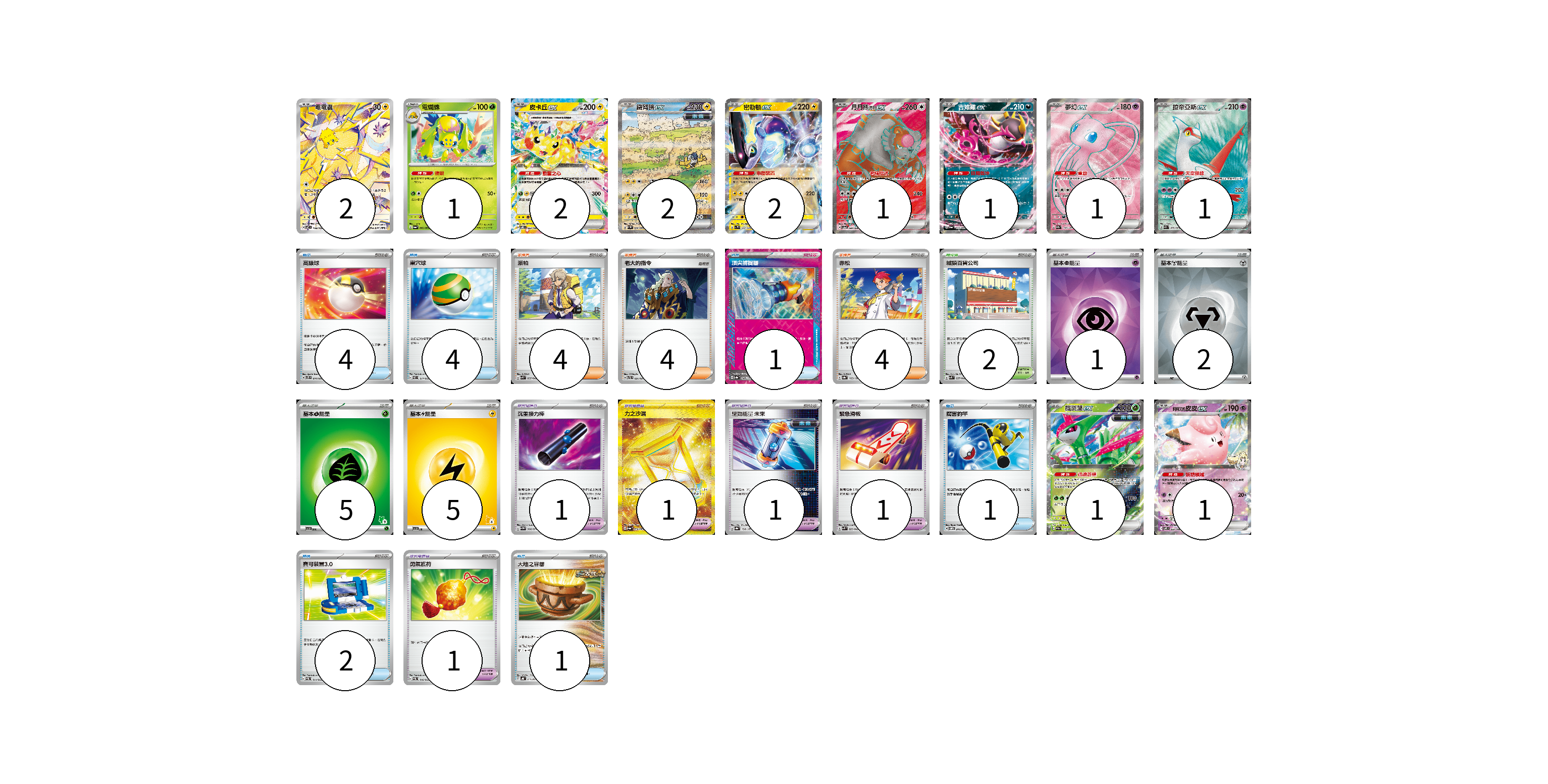 牌組構築方案 以此牌組為基礎新構築牌組 顯示卡面 顯示列表 寶可夢卡(15) 2 1 2 2 2 1 1 1 1 1 1 寶可夢道具(5) 1 1 1 1 1 物品卡(13) 4 4 1 1 2 1 支援者卡(12) 4 4 4 競技場卡(2) 2 能量卡(13) 1 2 5 5 寶可夢卡(15) 卡牌名稱 張數 卡牌名稱 張數 電電蟲 SV7 108/102 02 電蜘蛛 SV6a 002/064 01 皮卡丘ex SV8 033/106 02 鐵臂膀ex SV4M 088/066 02 密勒頓ex SV1V 037/078 02 月月熊 赫月 ex SV5a 084/066 01 吉雉雞ex SV6a 038/064 01 夢幻ex SV2a 195/165 01 拉帝亞斯ex SV7a 078/064 01 鐵斑葉ex SV5M 016/071 01 莉莉艾的皮皮ex SV9 033/100 01 寶可夢道具(5) 卡牌名稱 張數 卡牌名稱 張數 沉重接力棒 SV5M 066/071 01 力之沙漏 SV6a 094/064 01 驅勁能量 未來 SV8a 158/187 01 緊急滑板 SVK 023/042 01 勇氣護符 SVEM 016/020 01 物品卡(13) 卡牌名稱 張數 卡牌名稱 張數 高級球 SVTS 014/022 04 巢穴球 SVEL 011/020 04 頂尖捕捉器 SV8a 148/187 01 厲害釣竿 SVOM 011/021 01 寶可裝置3.0 SVEM 014/020 02 大地之容器 SVHK 011/022 01 支援者卡(12) 卡牌名稱 張數 卡牌名稱 張數 派帕 SVK 035/042 04 老大的指令 SVTL 021/021 04 赤松 SV8a 163/187 04 競技場卡(2) 卡牌名稱 張數 卡牌名稱 張數 城鎮百貨公司 SVK 037/042 02 能量卡(13) 卡牌名稱 張數 卡牌名稱 張數 基本【超】能量 SVOD PSY 01 基本【鋼】能量 SVOD MET 02 基本【草】能量 SVI GRA 05 基本【雷】能量 SVI LIG 05 以此牌組為基礎新構築牌組 牌組編碼 TZHmdI-rcdIpE-sdcsDJ copy 列印牌組單 牌組編碼已複製 分享至SNS