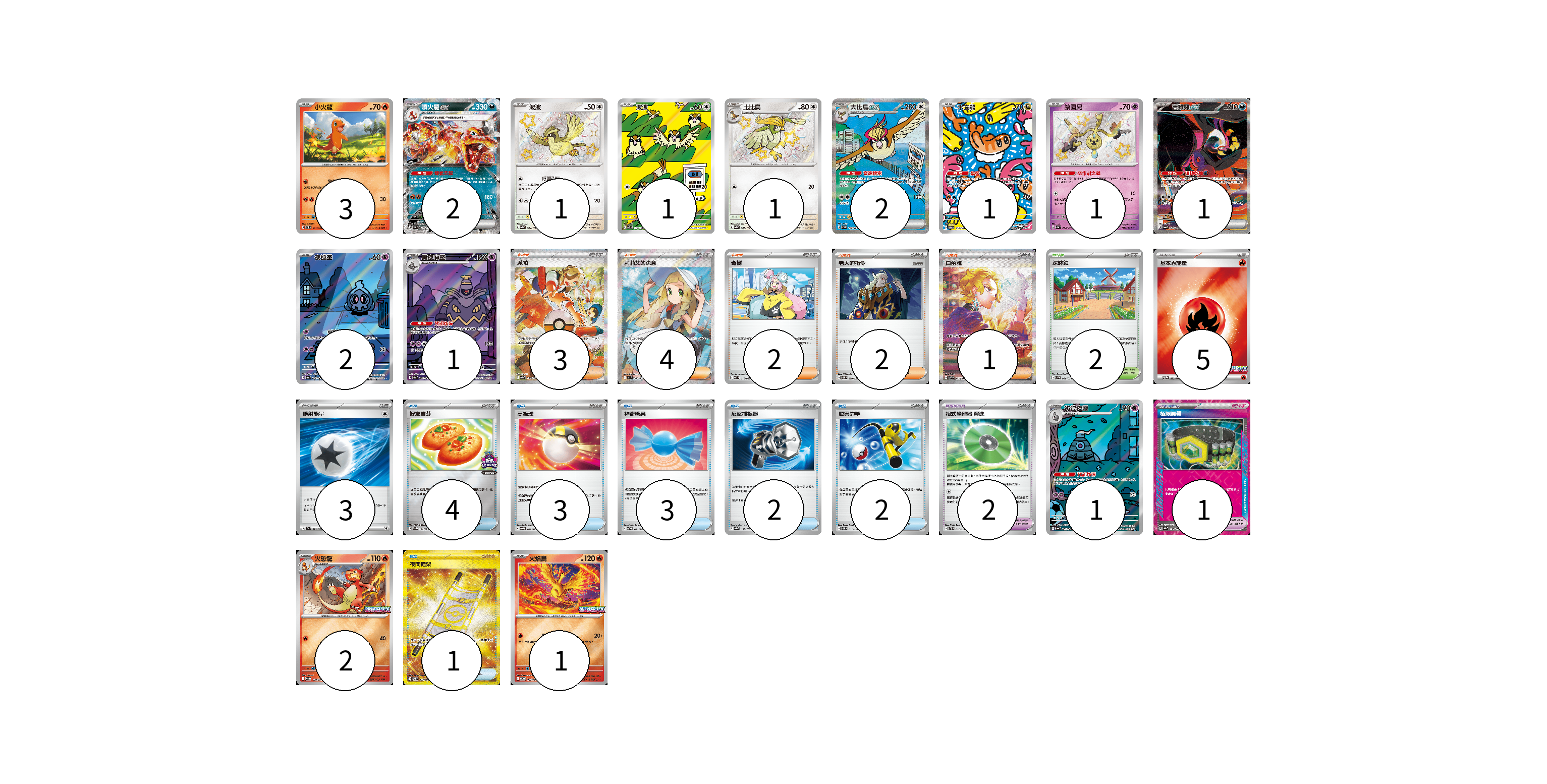 牌組構築方案 以此牌組為基礎新構築牌組 顯示卡面 顯示列表 寶可夢卡(20) 3 2 1 1 1 2 1 1 1 2 1 1 2 1 寶可夢道具(3) 2 1 物品卡(15) 4 3 3 2 2 1 支援者卡(12) 3 4 2 2 1 競技場卡(2) 2 能量卡(8) 5 3 寶可夢卡(20) 卡牌名稱 張數 卡牌名稱 張數 小火龍 SVTL 001/021 03 噴火龍ex SV4a 115/190 02 波波 SV4a 304/190 01 波波 SV3 118/108 01 比比鳥 SV4a 305/190 01 大比鳥ex SV3 136/108 02 米立龍 SV6 112/101 01 鑰圈兒 SV4a 264/190 01 吉雉雞ex SV6a 089/064 01 夜巡靈 SV6a 068/064 02 黑夜魔靈 SV6a 070/064 01 彷徨夜靈 SV6a 069/064 01 火恐龍 M-P 021/M-P 02 火焰鳥 M-P 022/M-P 01 寶可夢道具(3) 卡牌名稱 張數 卡牌名稱 張數 招式學習器 演進 SVTL 017/021 02 極限腰帶 SV8a 159/187 01 物品卡(15) 卡牌名稱 張數 卡牌名稱 張數 好友寶芬 SV-P 230/SV-P 04 高級球 SVOM 013/021 03 神奇糖果 SVTG 014/019 03 反擊捕捉器 SV8a 139/187 02 厲害釣竿 SVOM 011/021 02 夜間擔架 SV8 137/106 01 支援者卡(12) 卡牌名稱 張數 卡牌名稱 張數 派帕 SV4a 353/190 03 莉莉艾的決意 M1L 086/063 04 奇樹 SVEL 016/020 02 老大的指令 SVOM 020/021 02 白蕾雅 SV7 132/102 01 競技場卡(2) 卡牌名稱 張數 卡牌名稱 張數 深缽鎮 SVF 036/038 02 能量卡(8) 卡牌名稱 張數 卡牌名稱 張數 基本【火】能量 M-P 032/M-P 05 噴射能量 SV1a 072/073 03 以此牌組為基礎新構築牌組 牌組編碼 TahhVe-xkpGCV-QfanAp copy 列印牌組單 牌組編碼已複製 分享至SNS