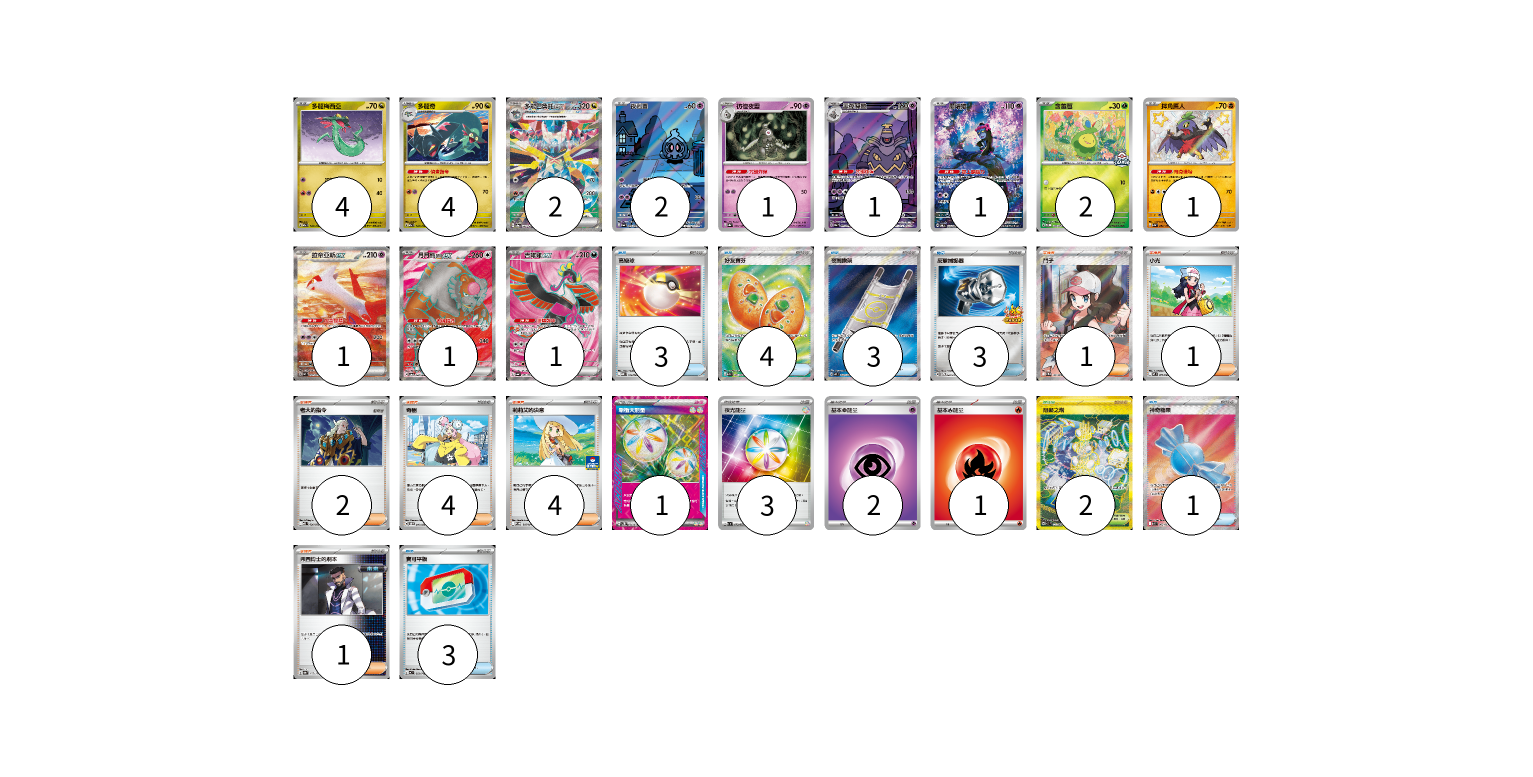 牌組構築方案 以此牌組為基礎新構築牌組 顯示卡面 顯示列表 寶可夢卡(21) 4 4 2 2 1 1 1 2 1 1 1 1 物品卡(17) 3 4 3 3 1 3 支援者卡(13) 1 1 2 4 4 1 競技場卡(2) 2 能量卡(7) 1 3 2 1 寶可夢卡(21) 卡牌名稱 張數 卡牌名稱 張數 多龍梅西亞 M2a 132/193 04 多龍奇 M2a 133/193 04 多龍巴魯托ex SV8a 221/187 02 夜巡靈 SV6a 068/064 02 彷徨夜靈 SV8a 065/187 01 黑夜魔靈 SV6a 070/064 01 願增猿 SV6 107/101 01 含羞苞 M-P 037/M-P 02 摔角鷹人 SV4a 282/190 01 拉帝亞斯ex SV7a 087/064 01 月月熊 赫月 ex SV5a 084/066 01 吉雉雞ex SV6a 081/064 01 物品卡(17) 卡牌名稱 張數 卡牌名稱 張數 高級球 MBD 014/022 03 好友寶芬 M1S 081/063 04 夜間擔架 M1L 083/063 03 反擊捕捉器 SV-P 083/SV-P 03 神奇糖果 M1S 082/063 01 寶可平板 MC 662/742 03 支援者卡(13) 卡牌名稱 張數 卡牌名稱 張數 鬥子 SV11W 166/086 01 小光 M2 077/080 01 老大的指令 MBD 020/022 02 奇樹 SVOD 016/020 04 莉莉艾的決意 M-P 018/M-P 04 弗圖博士的劇本 SV8a 175/187 01 競技場卡(2) 卡牌名稱 張數 卡牌名稱 張數 阻礙之塔 SV10 132/098 02 能量卡(7) 卡牌名稱 張數 卡牌名稱 張數 新衝天能量 SV5K 071/071 01 夜光能量 SV1a 073/073 03 基本超能量 sv-p PSY 02 基本火能量 sv-p FIR 01 以此牌組為基礎新構築牌組 牌組編碼 TbjwSY-EzsoUz-ipLMPg copy 列印牌組單 牌組編碼已複製 分享至SNS