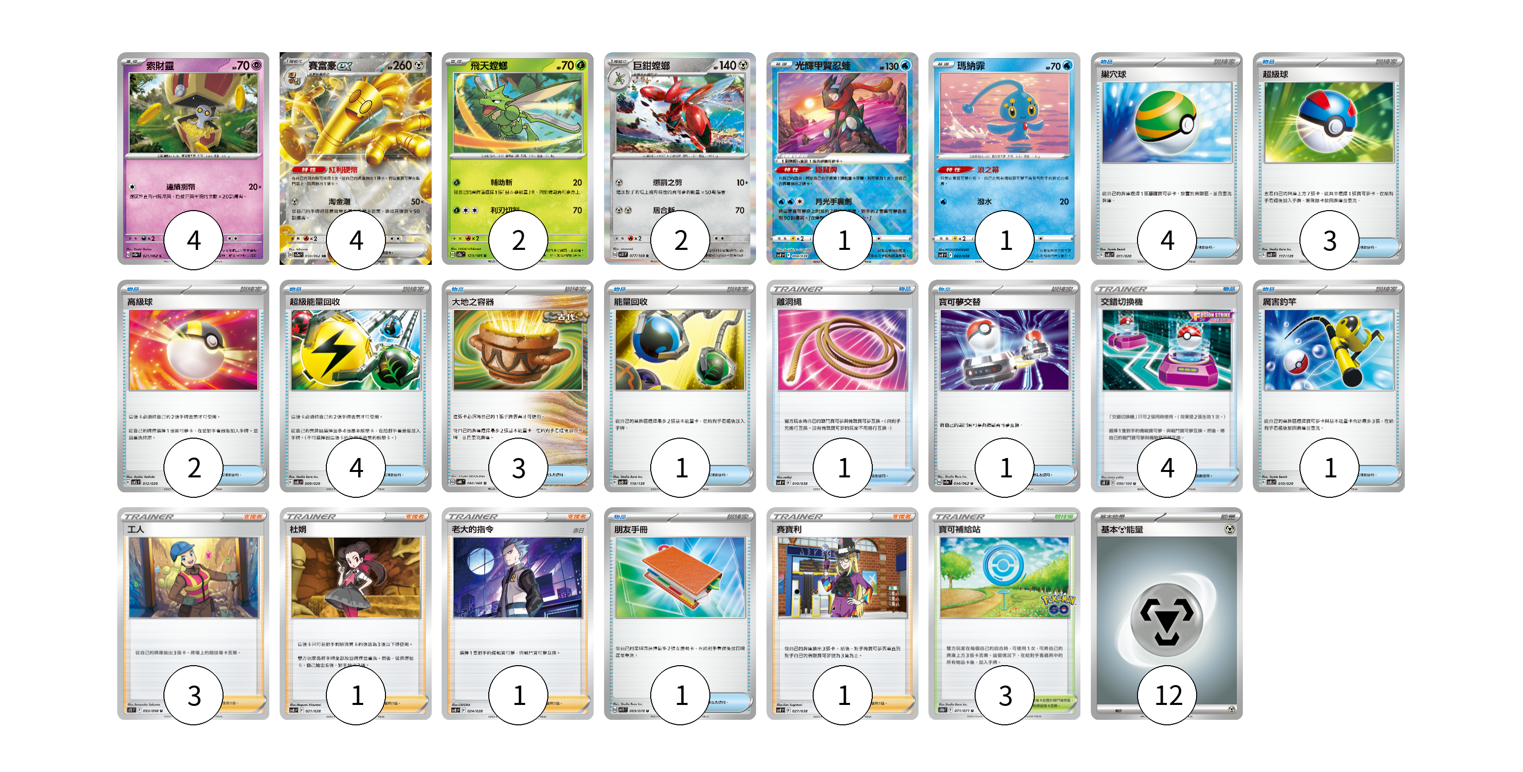 牌組構築方案 以此牌組為基礎新構築牌組 顯示卡面 顯示列表 寶可夢卡(15) 4 4 2 2 1 1 1 物品卡(24) 4 3 2 4 3 1 1 1 4 1 支援者卡(6) 3 1 1 1 競技場卡(3) 3 能量卡(12) 12 寶可夢卡(15) 卡牌名稱 張數 卡牌名稱 張數 索財靈 SV3a 021/062 04 賽富豪ex SV3a 050/062 04 飛天螳螂 SV2a 123/165 02 巨鉗螳螂 SV3 077/108 02 光輝甲賀忍蛙 SVF 004/038 01 瑪納霏 SVF 003/038 01 厲害釣竿 SVEL 010/020 01 物品卡(24) 卡牌名稱 張數 卡牌名稱 張數 巢穴球 SVEL 011/020 04 超級球 SVD 117/139 03 高級球 SVEL 012/020 02 超級能量回收 SVEL 009/020 04 大地之容器 SV4K 060/066 03 能量回收 SVD 110/139 01 離洞繩 SVF 010/038 01 寶可夢交替 SV3a 054/062 01 交錯切換機 S8 090/100 04 朋友手冊 SV1S 069/078 01 支援者卡(6) 卡牌名稱 張數 卡牌名稱 張數 工人 S12 093/098 03 杜娟 SVB 021/028 01 老大的指令(赤日) SVB 024/028 01 賽寶利 SVF 027/038 01 競技場卡(3) 卡牌名稱 張數 卡牌名稱 張數 寶可補給站 S10b 071/071 03 能量卡(12) 卡牌名稱 張數 卡牌名稱 張數 基本鋼能量 sv-p MET 12 以此牌組為基礎新構築牌組 牌組編碼 TcgoPc-pnLTXI-CVLzVV copy 列印牌組單 牌組編碼已複製 分享至SNS