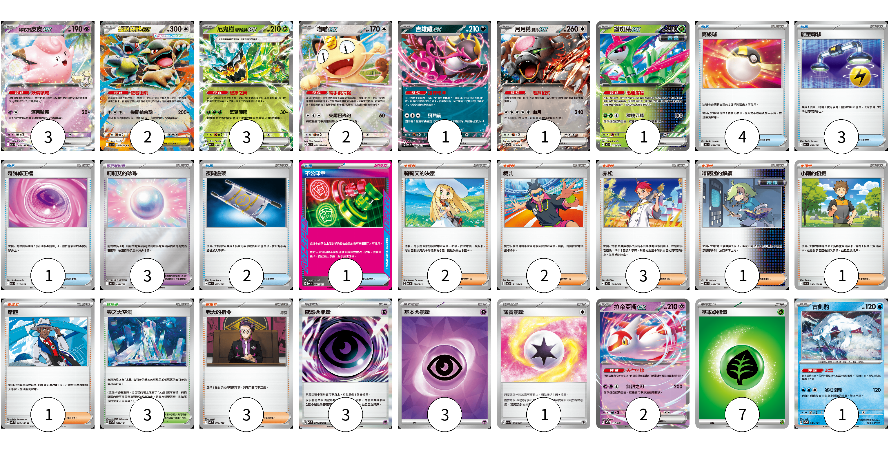 牌組構築方案 以此牌組為基礎新構築牌組 顯示卡面 顯示列表 寶可夢卡(16) 3 2 3 2 1 1 1 2 1 寶可夢道具(3) 3 物品卡(11) 4 3 1 2 1 支援者卡(13) 2 2 3 1 1 1 3 競技場卡(3) 3 能量卡(14) 3 3 1 7 寶可夢卡(16) 卡牌名稱 張數 卡牌名稱 張數 莉莉艾的皮皮ex M2a 060/193 03 超級袋獸ex M1S 051/063 02 厄鬼椪 碧草面具ex MC 082/742 03 喵喵ex M3 061/080 02 吉雉雞ex MC 489/742 01 月月熊 赫月 ex MC 625/742 01 鐵斑葉ex MC 077/742 01 拉帝亞斯ex MC 312/742 02 古劍豹 M2a 043/193 01 寶可夢道具(3) 卡牌名稱 張數 卡牌名稱 張數 莉莉艾的珍珠 MC 692/742 03 物品卡(11) 卡牌名稱 張數 卡牌名稱 張數 高級球 MC 651/742 04 能量轉移 MC 638/742 03 奇跡修正檔 MBD 017/022 01 夜間擔架 MC 670/742 02 不公印章 MC 633/742 01 支援者卡(13) 卡牌名稱 張數 卡牌名稱 張數 莉莉艾的決意 MC 729/742 02 裁判 MC 711/742 02 赤松 MC 696/742 03 暗碼迷的解讀 MC 698/742 01 小剛的發掘 SV9 096/100 01 席藍 SV8 102/106 01 老大的指令 MC 724/742 03 競技場卡(3) 卡牌名稱 張數 卡牌名稱 張數 零之大空洞 M2a 184/193 03 能量卡(14) 卡牌名稱 張數 卡牌名稱 張數 感應【超】能量 M3 079/080 03 基本【超】能量 SVOD PSY 03 薄霧能量 SV8a 186/187 01 基本【草】能量 MJ GRA 07 以此牌組為基礎新構築牌組 牌組編碼 TgVCQS-UdMTjU-KfUkKJ copy 列印牌組單 牌組編碼已複製 分享至SNS