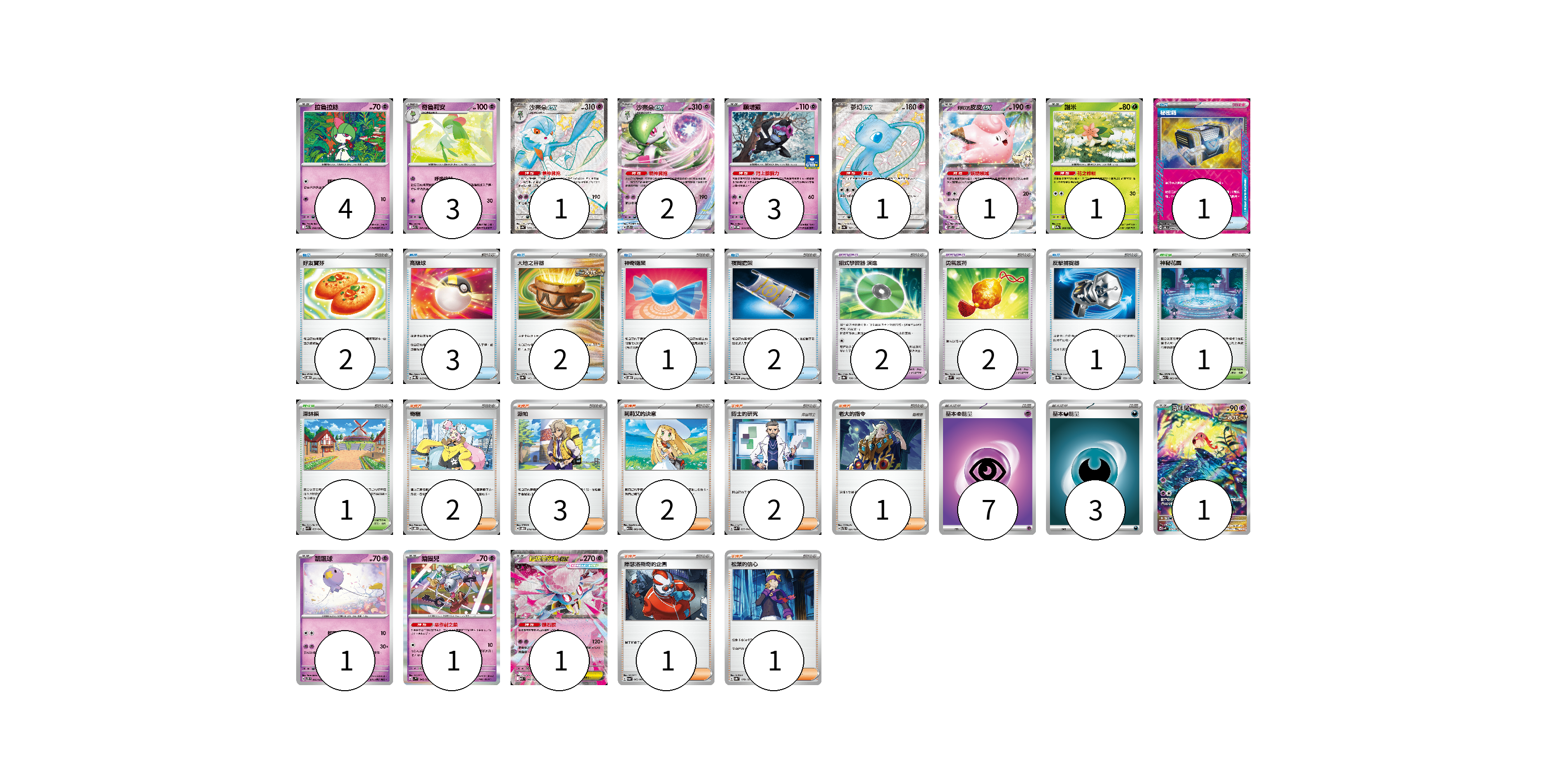 牌組構築方案 以此牌組為基礎新構築牌組 顯示卡面 顯示列表 寶可夢卡(20) 4 3 1 2 3 1 1 1 1 1 1 1 寶可夢道具(4) 2 2 物品卡(12) 1 2 3 2 1 2 1 支援者卡(12) 2 3 2 2 1 1 1 競技場卡(2) 1 1 能量卡(10) 7 3 寶可夢卡(20) 卡牌名稱 張數 卡牌名稱 張數 拉魯拉絲 M1S 040/063 04 奇魯莉安 M1S 041/063 03 沙奈朵ex SV4a 328/190 01 沙奈朵ex SVTS 004/022 02 願增猿 M-P 014/M-P 03 夢幻ex SV4a 327/190 01 莉莉艾的皮皮ex SV9 033/100 01 謝米 SV9a 006/063 01 吼叫尾 SV4K 071/066 01 飄飄球 SVTS 005/022 01 鑰圈兒 SV1V 045/078 01 超級蒂安希ex MBD 006/022 01 寶可夢道具(4) 卡牌名稱 張數 卡牌名稱 張數 招式學習器 演進 SV8a 160/187 02 勇氣護符 SVM 142/175 02 物品卡(12) 卡牌名稱 張數 卡牌名稱 張數 秘密箱 SV6 092/101 01 好友寶芬 SVOD 011/020 02 高級球 SVQL 015/022 03 大地之容器 SV8a 143/187 02 神奇糖果 SVOD 013/020 01 夜間擔架 SVOM 016/021 02 反擊捕捉器 SV8a 139/187 01 支援者卡(12) 卡牌名稱 張數 卡牌名稱 張數 奇樹 SVOD 016/020 02 派帕 SVOD 018/020 03 莉莉艾的決意 M1L 062/063 02 博士的研究 SVK 033/042 02 老大的指令 SVTL 021/021 01 庫瑟洛斯奇的企圖 SV6a 062/064 01 松葉的信心 SV8a 178/187 01 競技場卡(2) 卡牌名稱 張數 卡牌名稱 張數 神秘花園 M1S 063/063 01 深缽鎮 SVK 039/042 01 能量卡(10) 卡牌名稱 張數 卡牌名稱 張數 基本超能量 sv-p PSY 07 基本惡能量 sv-p DAR 03 以此牌組為基礎新構築牌組 牌組編碼 TgaywJ-ifecuM-RwOKfg copy 列印牌組單 牌組編碼已複製 分享至SNS