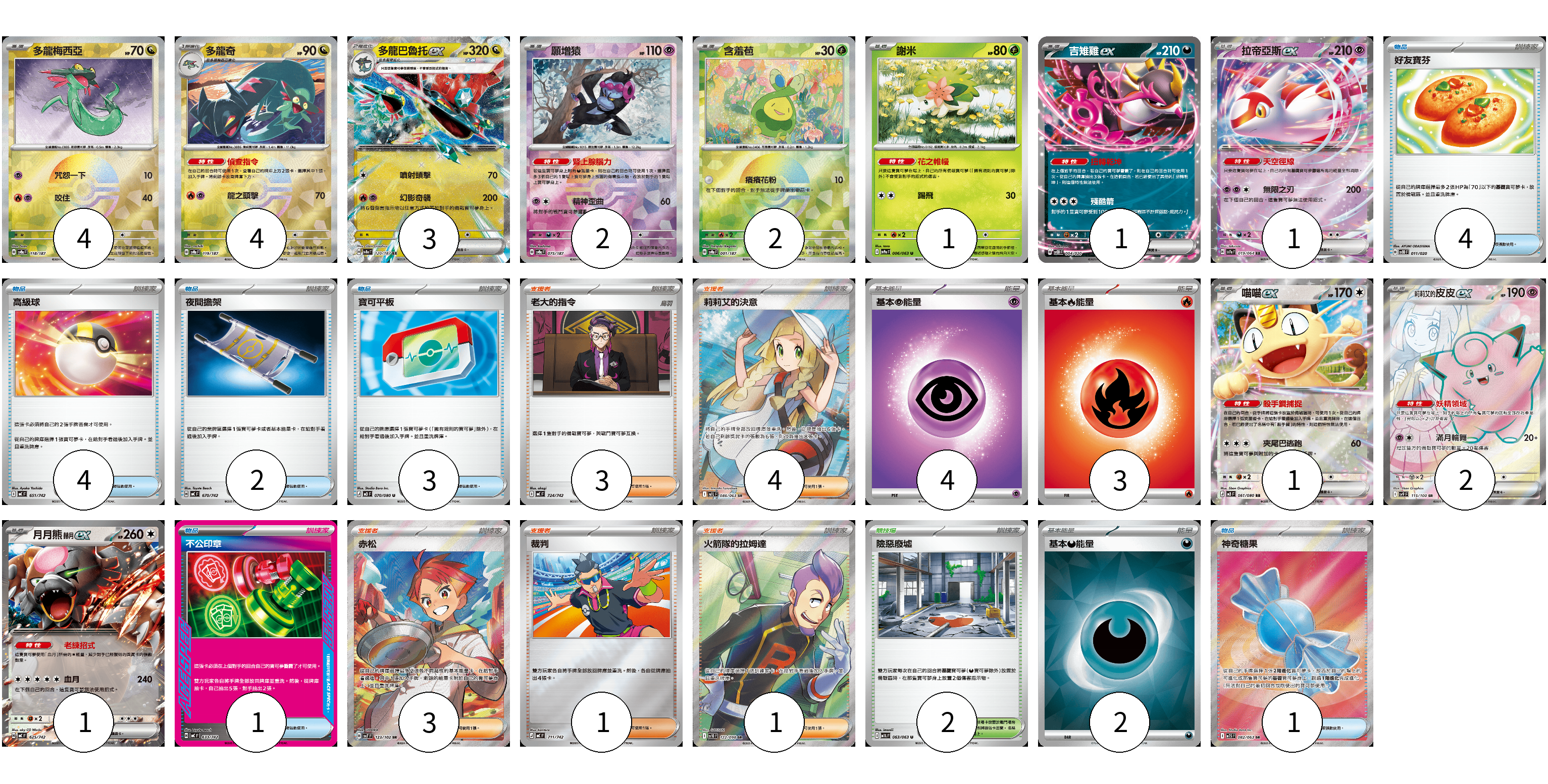 牌組構築方案 以此牌組為基礎新構築牌組 顯示卡面 顯示列表 寶可夢卡(22) 4 4 3 2 2 1 1 1 1 2 1 物品卡(15) 4 4 2 3 1 1 支援者卡(12) 3 4 3 1 1 競技場卡(2) 2 能量卡(9) 4 3 2 寶可夢卡(22) 卡牌名稱 張數 卡牌名稱 張數 多龍梅西亞 SV8a 118/187 04 多龍奇 SV8a 119/187 04 多龍巴魯托ex SV8a 120/187 03 願增猿 SV8a 075/187 02 含羞苞 SV8a 001/187 02 謝米 SV9a 006/063 01 吉雉雞ex SVOD 004/020 01 拉帝亞斯ex SV7a 019/064 01 喵喵ex M3 061/080 01 莉莉艾的皮皮ex SV9 115/100 02 月月熊 赫月 ex MC 625/742 01 物品卡(15) 卡牌名稱 張數 卡牌名稱 張數 好友寶芬 SVOD 011/020 04 高級球 MC 651/742 04 夜間擔架 MC 670/742 02 寶可平板 M3 070/080 03 不公印章 MC 633/742 01 神奇糖果 M1S 082/063 01 支援者卡(12) 卡牌名稱 張數 卡牌名稱 張數 老大的指令 MC 724/742 03 莉莉艾的決意 M1L 086/063 04 赤松 SV7 123/102 03 裁判 MC 711/742 01 火箭隊的拉姆達 SV10 122/098 01 競技場卡(2) 卡牌名稱 張數 卡牌名稱 張數 險惡廢墟 M1L 063/063 02 能量卡(9) 卡牌名稱 張數 卡牌名稱 張數 基本【超】能量 MC PSY 04 基本【火】能量 MC FIR 03 基本【惡】能量 SVOM DAR 02 以此牌組為基礎新構築牌組 牌組編碼 TgyiFD-KqxkXg-RwyaYk copy 列印牌組單 牌組編碼已複製 分享至SNS
