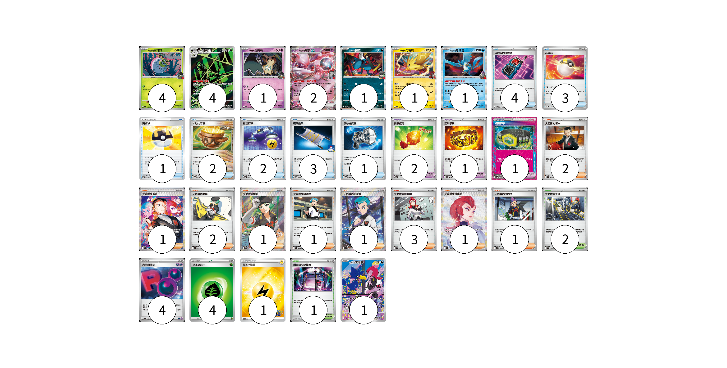 牌組構築方案 以此牌組為基礎新構築牌組 顯示卡面 顯示列表 寶可夢卡(15) 4 4 1 2 1 1 1 1 寶可夢道具(4) 2 1 1 物品卡(16) 4 3 1 2 2 3 1 支援者卡(13) 2 1 2 1 1 1 3 1 1 競技場卡(3) 2 1 能量卡(9) 4 4 1 寶可夢卡(15) 卡牌名稱 張數 卡牌名稱 張數 <火箭隊的>團珠蛛 SV10 008/098 04 <火箭隊的>操陷蛛 SV10 099/098 04 <火箭隊的>謎擬Q SV10 042/098 01 <火箭隊的>超夢ex SV10 039/098 02 <火箭隊的>狃拉 SV10 072/098 01 <火箭隊的>閃電鳥 SV10 033/098 01 <火箭隊的>急凍鳥 SV10 022/098 01 <火箭隊的>黑暗鴉 SV10 106/098 01 寶可夢道具(4) 卡牌名稱 張數 卡牌名稱 張數 勇氣護符 SVK 024/042 02 猛攻手鐲 SV11W 082/086 01 極限腰帶 SV5K 066/071 01 物品卡(16) 卡牌名稱 張數 卡牌名稱 張數 火箭隊的接收器 SV10 090/098 04 高級球 SVHK 013/022 03 高級球 S12a 138/172 01 大地之容器 SV8a 143/187 02 能量轉移 SVK 008/042 02 夜間擔架 SV-P 227/SV-P 03 反擊捕捉器 SV8a 139/187 01 支援者卡(13) 卡牌名稱 張數 卡牌名稱 張數 火箭隊的坂木 SV10 093/098 02 火箭隊的坂木 SV10 129/098 01 火箭隊的蘭斯 SV10 095/098 02 火箭隊的蘭斯 SV10 123/098 01 火箭隊的阿波羅 SV10 092/098 01 火箭隊的阿波羅 SV10 120/098 01 火箭隊的雅典娜 SV10 091/098 03 火箭隊的雅典娜 SV10 128/098 01 火箭隊的拉姆達 SV10 094/098 01 競技場卡(3) 卡牌名稱 張數 卡牌名稱 張數 火箭隊的工廠 SV10 097/098 02 對戰圓形競技場 M2 079/080 01 能量卡(9) 卡牌名稱 張數 卡牌名稱 張數 火箭隊能量 SV10 098/098 04 基本草能量 sv-p GRA 04 基本雷能量 S10b LIG 01 以此牌組為基礎新構築牌組 牌組編碼 ThNHKX-jWtMfh-KGnkIf copy 列印牌組單 牌組編碼已複製 分享至SNS