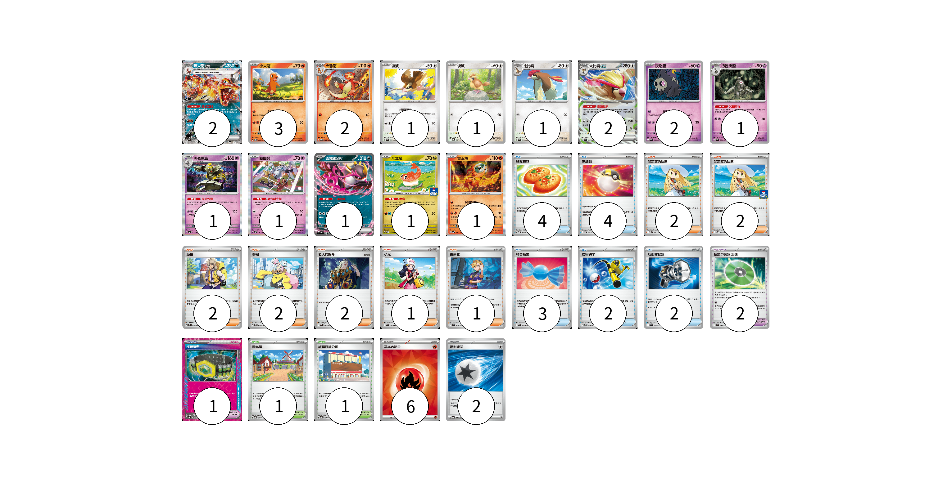 牌組構築方案 以此牌組為基礎新構築牌組 顯示卡面 顯示列表 寶可夢卡(20) 2 3 2 1 1 1 2 2 1 1 1 1 1 1 寶可夢道具(3) 2 1 物品卡(15) 4 4 3 2 2 支援者卡(12) 2 2 2 2 2 1 1 競技場卡(2) 1 1 能量卡(8) 6 2 寶可夢卡(20) 卡牌名稱 張數 卡牌名稱 張數 噴火龍ex SV4a 115/190 02 小火龍 SVTL 001/021 03 火恐龍 M2 012/080 02 波波 SVK 003/042 01 波波 SV3 087/108 01 比比鳥 SVK 004/042 01 大比鳥ex SVK 005/042 02 夜巡靈 SV8a 064/187 02 彷徨夜靈 SV8a 065/187 01 黑夜魔靈 SV6a 020/064 01 鑰圈兒 SV4a 087/190 01 吉雉雞ex SVOM 009/021 01 米立龍 SV-P 211/SV-P 01 古玉魚 SV8a 025/187 01 寶可夢道具(3) 卡牌名稱 張數 卡牌名稱 張數 招式學習器 演進 SV8a 160/187 02 極限腰帶 SV8a 159/187 01 物品卡(15) 卡牌名稱 張數 卡牌名稱 張數 好友寶芬 MBD 013/022 04 高級球 MBD 014/022 04 神奇糖果 MBG 013/022 03 厲害釣竿 SVOD 010/020 02 反擊捕捉器 SV8a 139/187 02 支援者卡(12) 卡牌名稱 張數 卡牌名稱 張數 莉莉艾的決意 MBD 021/022 02 莉莉艾的決意 M-P 018/M-P 02 派帕 SVOD 018/020 02 奇樹 SVOD 016/020 02 老大的指令 MBD 020/022 02 小光 M2 077/080 01 白蕾雅 SV8a 176/187 01 競技場卡(2) 卡牌名稱 張數 卡牌名稱 張數 深缽鎮 SVK 039/042 01 城鎮百貨公司 SVK 037/042 01 能量卡(8) 卡牌名稱 張數 卡牌名稱 張數 基本【火】能量 SVQL FIR 06 噴射能量 SV8a 185/187 02 以此牌組為基礎新構築牌組 牌組編碼 TjIVLh-hSsXnB-BUaOdn copy 列印牌組單 牌組編碼已複製 分享至SNS