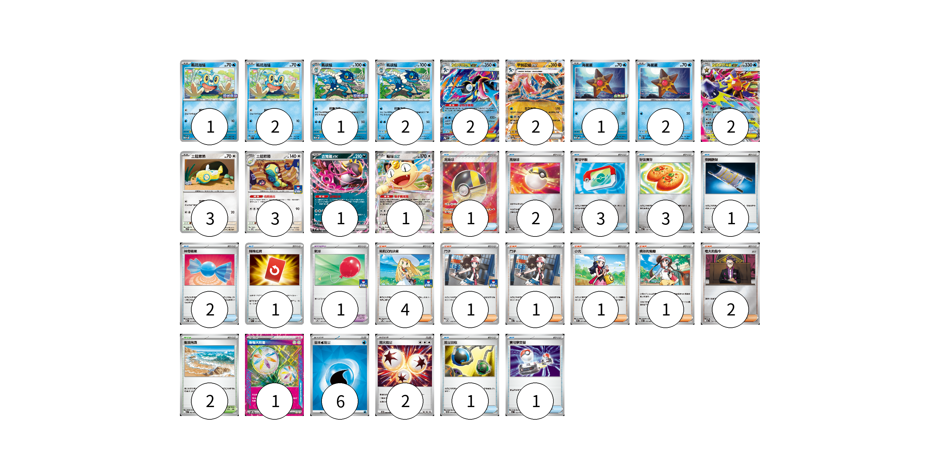 牌組構築方案 以此牌組為基礎新構築牌組 顯示卡面 顯示列表 寶可夢卡(23) 1 2 1 2 2 2 1 2 2 3 3 1 1 寶可夢道具(1) 1 物品卡(15) 1 2 3 3 1 2 1 1 1 支援者卡(10) 4 1 1 1 1 2 競技場卡(2) 2 能量卡(9) 1 6 2 寶可夢卡(23) 卡牌名稱 張數 卡牌名稱 張數 呱呱泡蛙 M-P 089/M-P 01 呱呱泡蛙 M4 020/083 02 呱頭蛙 M-P 090/M-P 01 呱頭蛙 M4 021/083 02 超級甲賀忍蛙ex M4 022/083 02 甲賀忍蛙ex SV5a 045/066 02 海星星 M-P 066/M-P 01 海星星 M3 020/080 02 超級寶石海星ex M3 021/080 02 土龍弟弟 SV9 078/100 03 土龍節節 M-P 045/M-P 03 吉雉雞ex SVOD 004/020 01 喵喵ex M3 061/080 01 寶可夢道具(1) 卡牌名稱 張數 卡牌名稱 張數 氣球 M-P 047/M-P 01 物品卡(15) 卡牌名稱 張數 卡牌名稱 張數 高級球 M2a 216/193 01 高級球 MC 651/742 02 寶可平板 MC 662/742 03 好友寶芬 MC 648/742 03 夜間擔架 MBG 017/022 01 神奇糖果 MBG 013/022 02 特殊紅牌 M4 072/083 01 能量回收 SV11W 079/086 01 寶可夢交替 MC 663/742 01 支援者卡(10) 卡牌名稱 張數 卡牌名稱 張數 莉莉艾的決意 M-P 018/M-P 04 鬥子 M-P 048/M-P 01 鬥子 M2a 172/193 01 小光 M2 077/080 01 鳴依的勉勵 M3 075/080 01 老大的指令 MC 724/742 02 競技場卡(2) 卡牌名稱 張數 卡牌名稱 張數 衝浪海灘 M1S 062/063 02 能量卡(9) 卡牌名稱 張數 卡牌名稱 張數 新衝天能量 SV5K 071/071 01 基本【水】能量 SVM WAT 06 燃火能量 SV11W 086/086 02 以此牌組為基礎新構築牌組 牌組編碼 TjUmJd-HqNjnR-rfKMUf copy 列印牌組單 牌組編碼已複製 分享至SNS