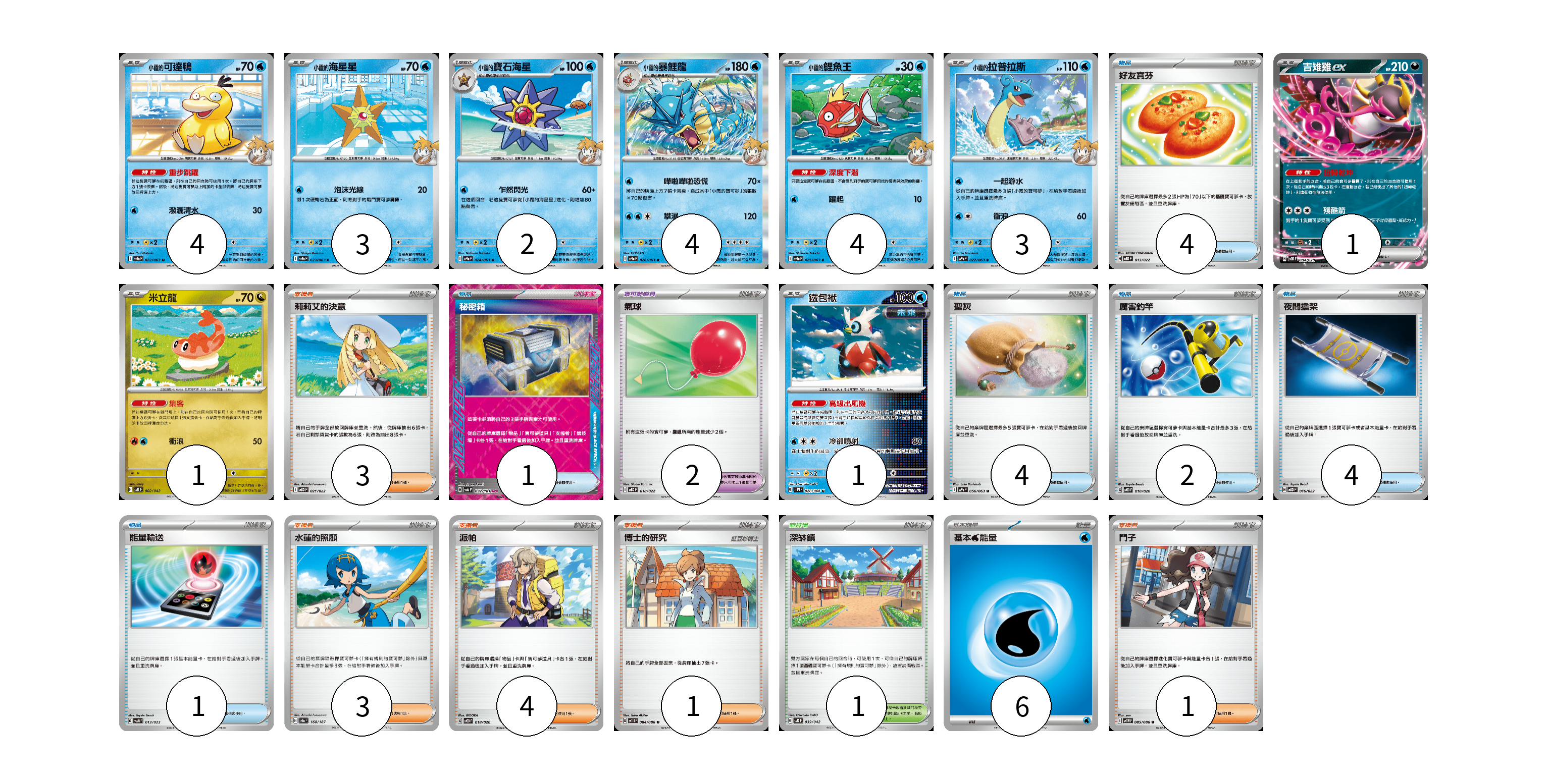牌組構築方案 以此牌組為基礎新構築牌組 顯示卡面 顯示列表 寶可夢卡(23) 4 3 2 4 4 3 1 1 1 寶可夢道具(2) 2 物品卡(16) 4 1 4 2 4 1 支援者卡(12) 3 3 4 1 1 競技場卡(1) 1 能量卡(6) 6 寶可夢卡(23) 卡牌名稱 張數 卡牌名稱 張數 <小霞的>可達鴨 SV9a 022/063 04 <小霞的>海星星 SV9a 023/063 03 <小霞的>寶石海星 SV9a 024/063 02 <小霞的>暴鯉龍 SV9a 026/063 04 <小霞的>鯉魚王 SV9a 025/063 04 <小霞的>拉普拉斯 SV9a 027/063 03 吉雉雞ex SVOD 004/020 01 米立龍 SVK 002/042 01 鐵包袱 SV4M 020/066 01 寶可夢道具(2) 卡牌名稱 張數 卡牌名稱 張數 氣球 MBD 018/022 02 物品卡(16) 卡牌名稱 張數 卡牌名稱 張數 好友寶芬 MBD 013/022 04 秘密箱 SV6 092/101 01 聖灰 SV9a 056/063 04 厲害釣竿 SVOD 010/020 02 夜間擔架 MBD 016/022 04 能量輸送 SVAM 013/023 01 支援者卡(12) 卡牌名稱 張數 卡牌名稱 張數 莉莉艾的決意 MBD 021/022 03 水蓮的照顧 SV8a 168/187 03 派帕 SVOD 018/020 04 博士的研究 SV11B 084/086 01 鬥子 SV11W 085/086 01 競技場卡(1) 卡牌名稱 張數 卡牌名稱 張數 深缽鎮 SVK 039/042 01 能量卡(6) 卡牌名稱 張數 卡牌名稱 張數 基本水能量 sv-p WAT 06 以此牌組為基礎新構築牌組 牌組編碼 TjsrPC-gUqXTF-WDFiXT copy 列印牌組單 牌組編碼已複製 分享至SNS