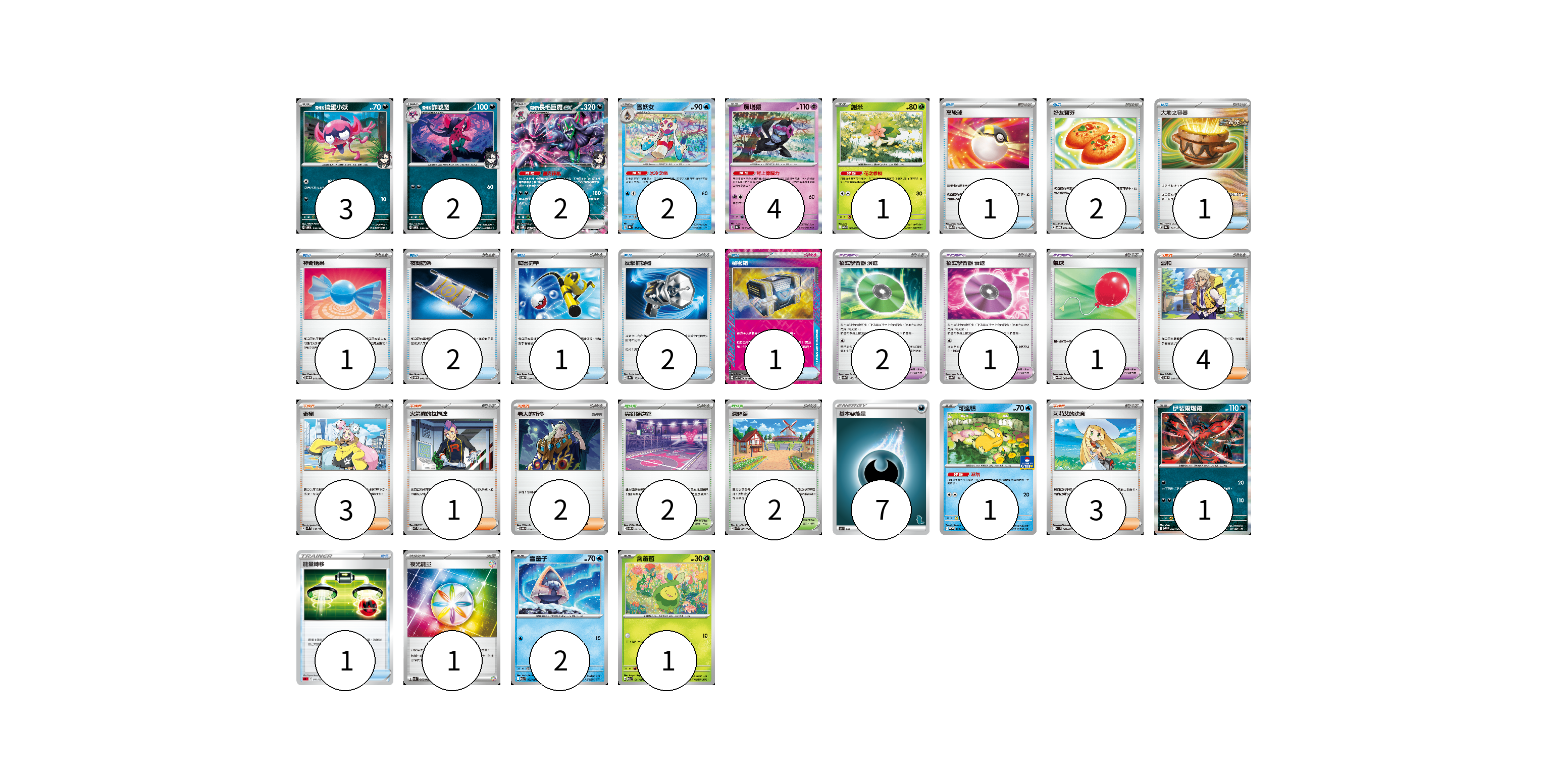 牌組構築方案 以此牌組為基礎新構築牌組 顯示卡面 顯示列表 寶可夢卡(19) 3 2 2 2 4 1 1 1 2 1 寶可夢道具(4) 2 1 1 物品卡(12) 1 2 1 1 2 1 2 1 1 支援者卡(13) 4 3 1 2 3 競技場卡(4) 2 2 能量卡(8) 7 1 寶可夢卡(19) 卡牌名稱 張數 卡牌名稱 張數 <瑪俐的>搗蛋小妖 SVOM 005/021 03 <瑪俐的>詐唬魔 SVOM 006/021 02 <瑪俐的>長毛巨魔ex SVOM 007/021 02 雪妖女 SV8a 038/187 02 願增猿 SV8a 075/187 04 謝米 SV9a 006/063 01 可達鴨 SV-P 220/SV-P 01 伊裴爾塔爾 M1L 040/063 01 雪童子 M2a 035/193 02 含羞苞 M2a 011/193 01 寶可夢道具(4) 卡牌名稱 張數 卡牌名稱 張數 招式學習器 演進 SV8a 160/187 02 招式學習器 衰退 SV8a 161/187 01 氣球 SV11B 082/086 01 物品卡(12) 卡牌名稱 張數 卡牌名稱 張數 高級球 SVQL 015/022 01 好友寶芬 SVOD 011/020 02 大地之容器 SV8a 143/187 01 神奇糖果 SVOD 013/020 01 夜間擔架 SVOM 016/021 02 厲害釣竿 SVOD 010/020 01 反擊捕捉器 SV8a 139/187 02 秘密箱 SV6 092/101 01 能量轉移 SDL 011/021 01 支援者卡(13) 卡牌名稱 張數 卡牌名稱 張數 派帕 SVOD 018/020 04 奇樹 SVM 160/175 03 火箭隊的拉姆達 SV10 094/098 01 老大的指令 SVOD 019/020 02 莉莉艾的決意 M1L 062/063 03 競技場卡(4) 卡牌名稱 張數 卡牌名稱 張數 尖釘鎮道館 SVOM 021/021 02 深缽鎮 SVK 039/042 02 能量卡(8) 卡牌名稱 張數 卡牌名稱 張數 基本惡能量 SH DAR 07 夜光能量 SVK 042/042 01 以此牌組為基礎新構築牌組 牌組編碼 TkHpef-WEpuYv-AeJWHg copy 列印牌組單 牌組編碼已複製 分享至SNS