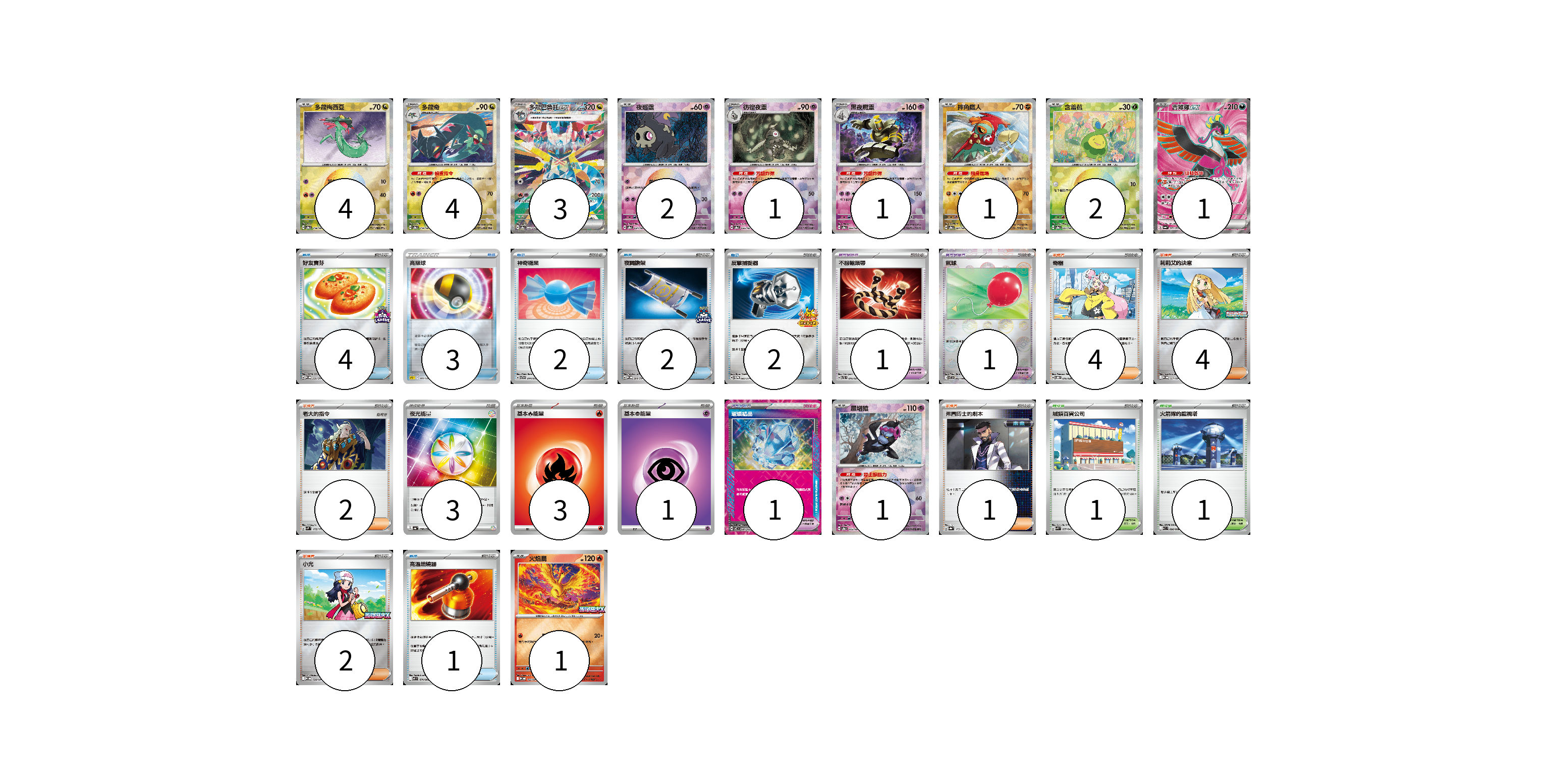 牌組構築方案 以此牌組為基礎新構築牌組 顯示卡面 顯示列表 寶可夢卡(21) 4 4 3 2 1 1 1 2 1 1 1 寶可夢道具(3) 1 1 1 物品卡(14) 4 3 2 2 2 1 支援者卡(13) 4 4 2 1 2 競技場卡(2) 1 1 能量卡(7) 3 3 1 寶可夢卡(21) 卡牌名稱 張數 卡牌名稱 張數 多龍梅西亞 SV8a 118/187 04 多龍奇 SV8a 119/187 04 多龍巴魯托ex SV8a 221/187 03 夜巡靈 SV8a 064/187 02 彷徨夜靈 SV8a 065/187 01 黑夜魔靈 SV8a 066/187 01 摔角鷹人 SV8a 084/187 01 含羞苞 SV8a 001/187 02 吉雉雞ex SV6a 081/064 01 願增猿 SV8a 075/187 01 火焰鳥 M-P 022/M-P 01 寶可夢道具(3) 卡牌名稱 張數 卡牌名稱 張數 不服輸頭帶 SVTL 016/021 01 氣球 SV11B 082/086 01 璀璨結晶 SV7 094/102 01 物品卡(14) 卡牌名稱 張數 卡牌名稱 張數 好友寶芬 SV-P 230/SV-P 04 高級球 SPZ 009/020 03 神奇糖果 SVTG 014/019 02 夜間擔架 SV-P 204/SV-P 02 反擊捕捉器 SV-P 083/SV-P 02 高溫燃燒器 M2 074/080 01 支援者卡(13) 卡牌名稱 張數 卡牌名稱 張數 奇樹 SVOD 016/020 04 莉莉艾的決意 M-P 011/M-P 04 老大的指令 SVM 172/175 02 弗圖博士的劇本 SV8a 175/187 01 小光 M-P 028/M-P 02 競技場卡(2) 卡牌名稱 張數 卡牌名稱 張數 城鎮百貨公司 SVK 037/042 01 火箭隊的監視塔 SV10 096/098 01 能量卡(7) 卡牌名稱 張數 卡牌名稱 張數 夜光能量 SV4a 190/190 03 基本【火】能量 SVEL FIR 03 基本【超】能量 SVEM PSY 01 以此牌組為基礎新構築牌組 牌組編碼 TkxJXJ-HBYAID-rVakxY copy 列印牌組單 牌組編碼已複製 分享至SNS