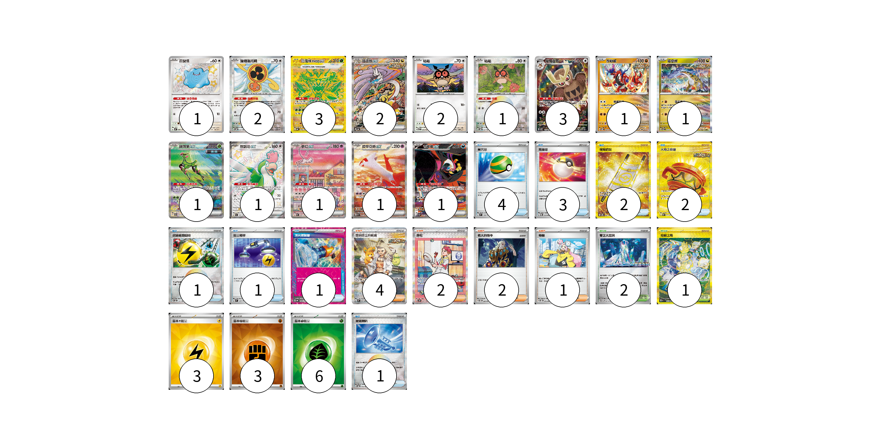 牌組構築方案 以此牌組為基礎新構築牌組 顯示卡面 顯示列表 寶可夢卡(21) 1 2 3 2 2 1 3 1 1 1 1 1 1 1 物品卡(15) 4 3 2 2 1 1 1 1 支援者卡(9) 4 2 2 1 競技場卡(3) 2 1 能量卡(12) 3 3 6 寶可夢卡(21) 卡牌名稱 張數 卡牌名稱 張數 百變怪 SV4a 309/190 01 旋轉洛托姆 SV8a 131/187 02 厄鬼椪 碧草面具ex SV8a 234/187 03 猛雷鼓ex SV8a 222/187 02 咕咕 SV7 076/102 02 咕咕 SV8a 127/187 01 貓頭夜鷹 SV7 114/102 03 故勒頓 SV8 069/106 01 猛雷鼓 SV7 075/102 01 鐵斑葉ex SV5M 093/071 01 怒鸚哥ex SV4a 337/190 01 夢幻ex SV2a 205/165 01 拉帝亞斯ex SV7a 087/064 01 吉雉雞ex SV6a 089/064 01 物品卡(15) 卡牌名稱 張數 卡牌名稱 張數 巢穴球 SVM 133/175 04 高級球 SVQL 015/022 03 夜間擔架 SV8 137/106 02 大地之容器 SV6a 093/064 02 超級能量回收 SV8a 141/187 01 能量轉移 SVM 127/175 01 頂尖捕捉器 SV8a 148/187 01 玻璃喇叭 SV8a 140/187 01 支援者卡(9) 卡牌名稱 張數 卡牌名稱 張數 奧琳博士的氣魄 SV4K 091/066 04 赤松 SV8a 227/187 02 老大的指令 SVOM 020/021 02 奇樹 SVOD 016/020 01 競技場卡(3) 卡牌名稱 張數 卡牌名稱 張數 零之大空洞 SV-P 151/SV-P 02 阻礙之塔 SV10 132/098 01 能量卡(12) 卡牌名稱 張數 卡牌名稱 張數 基本【雷】能量 SVQP LIG 03 基本【鬥】能量 SVM FIG 03 基本【草】能量 SVM GRA 06 以此牌組為基礎新構築牌組 牌組編碼 TlcWcy-otEegU-zgfnhA copy 列印牌組單 牌組編碼已複製 分享至SNS