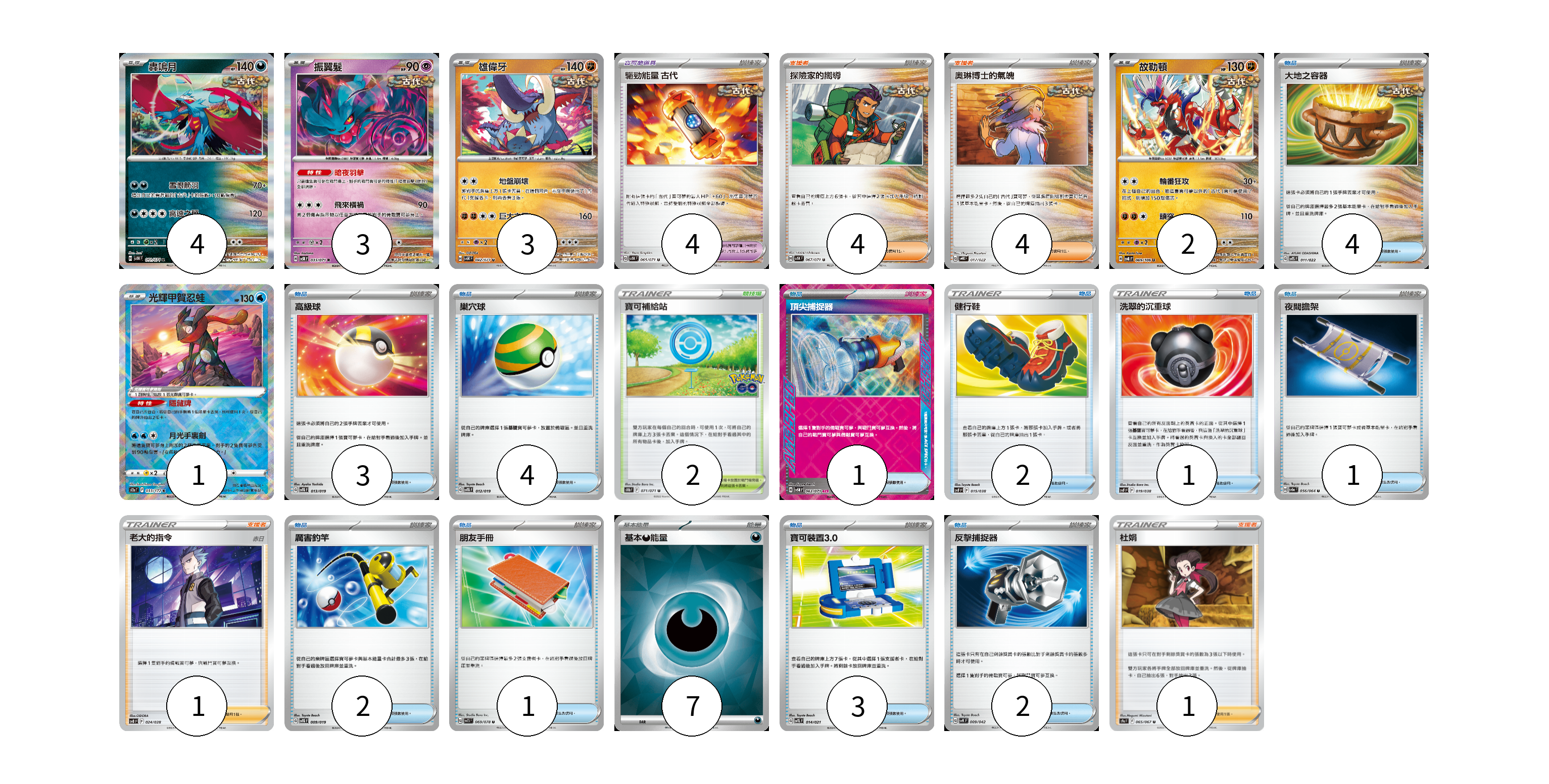 牌組構築方案 以此牌組為基礎新構築牌組 顯示卡面 顯示列表 寶可夢卡(13) 4 3 3 2 1 寶可夢道具(4) 4 物品卡(24) 4 3 4 1 2 1 1 2 1 3 2 支援者卡(10) 4 4 1 1 競技場卡(2) 2 能量卡(7) 7 寶可夢卡(13) 卡牌名稱 張數 卡牌名稱 張數 轟鳴月 SV5K 051/071 04 振翼髮 SV5K 033/071 03 雄偉牙 SV5K 042/071 03 故勒頓 SV8 069/106 02 光輝甲賀忍蛙 S12a 033/172 01 寶可夢道具(4) 卡牌名稱 張數 卡牌名稱 張數 驅勁能量 古代 SV5K 065/071 04 物品卡(24) 卡牌名稱 張數 卡牌名稱 張數 大地之容器 SVTS 011/022 04 高級球 SVTG 013/019 03 巢穴球 SVTG 012/019 04 頂尖捕捉器 SV5M 062/071 01 健行鞋 SVF 015/038 02 洗翠的沉重球 SVF 019/038 01 夜間擔架 SV6a 056/064 01 厲害釣竿 SVTG 009/019 02 朋友手冊 SV1S 069/078 01 寶可裝置3.0 SVTL 014/021 03 反擊捕捉器 SVK 009/042 02 支援者卡(10) 卡牌名稱 張數 卡牌名稱 張數 探險家的嚮導 SV5K 067/071 04 奧琳博士的氣魄 SVHK 017/022 04 老大的指令(赤日) SVB 024/028 01 杜娟 S9a 065/067 01 競技場卡(2) 卡牌名稱 張數 卡牌名稱 張數 寶可補給站 S10b 071/071 02 能量卡(7) 卡牌名稱 張數 卡牌名稱 張數 基本【惡】能量 SVK DAR 07 以此牌組為基礎新構築牌組 牌組編碼 TnRJDz-pVajbs-fzlNxS copy 列印牌組單 牌組編碼已複製 分享至SNS
