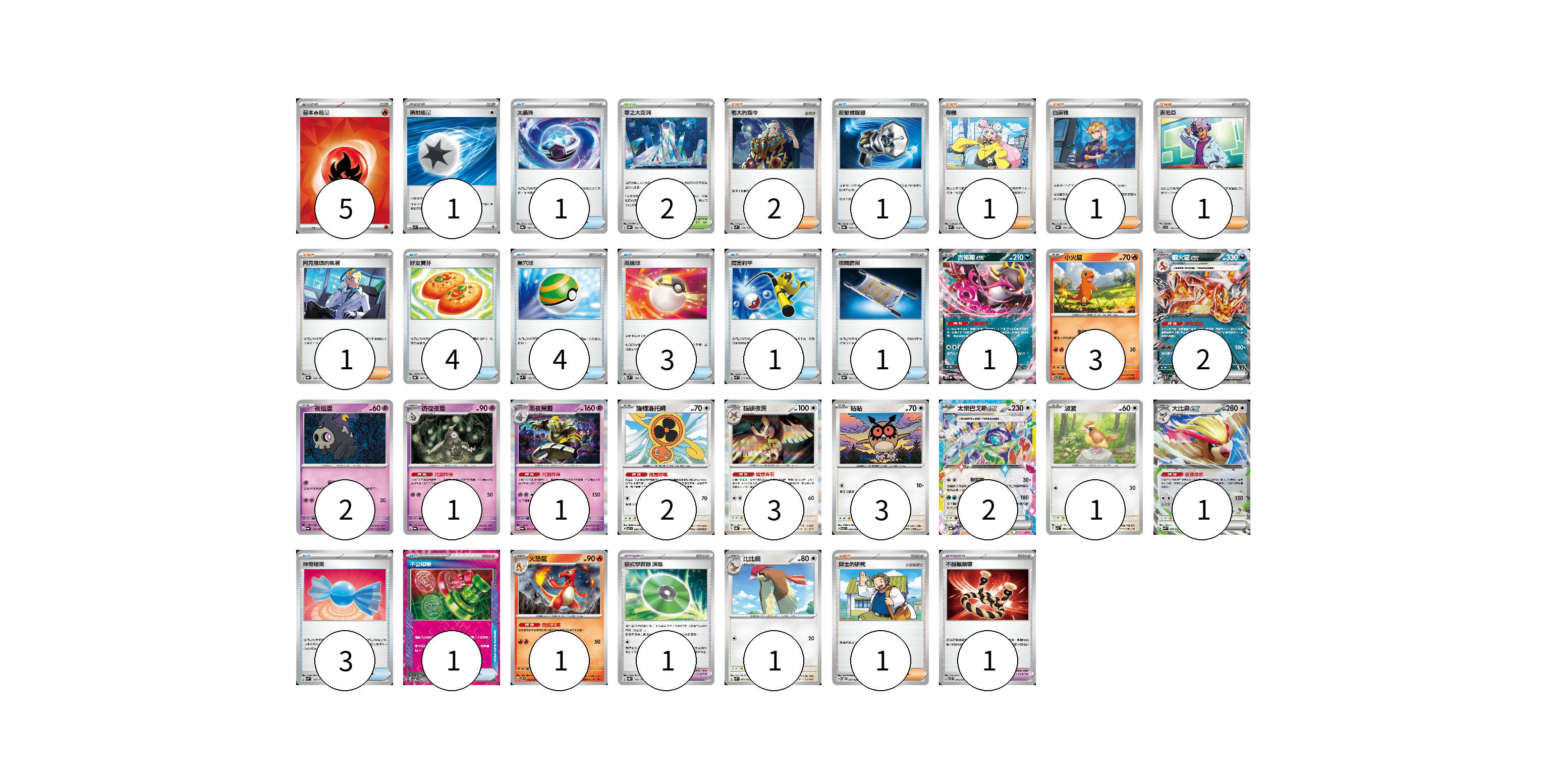 牌組構築方案 以此牌組為基礎新構築牌組 顯示卡面 顯示列表 寶可夢卡(24) 1 3 2 2 1 1 2 3 3 2 1 1 1 1 寶可夢道具(2) 1 1 物品卡(19) 1 1 4 4 3 1 1 3 1 支援者卡(7) 2 1 1 1 1 1 競技場卡(2) 2 能量卡(6) 5 1 寶可夢卡(24) 卡牌名稱 張數 卡牌名稱 張數 吉雉雞ex SV8a 104/187 01 小火龍 SVTL 001/021 03 噴火龍ex SVTL 006/021 02 夜巡靈 SV6a 018/064 02 彷徨夜靈 SV6a 019/064 01 黑夜魔靈 SV6a 020/064 01 旋轉洛托姆 SV7 080/102 02 貓頭夜鷹 SV8a 128/187 03 咕咕 SV7 076/102 03 太樂巴戈斯ex SV8a 136/187 02 波波 SV3 087/108 01 大比鳥ex SVK 005/042 01 火恐龍 SVTL 002/021 01 比比鳥 SVK 004/042 01 寶可夢道具(2) 卡牌名稱 張數 卡牌名稱 張數 招式學習器 演進 SV8a 160/187 01 不服輸頭帶 SVTL 016/021 01 物品卡(19) 卡牌名稱 張數 卡牌名稱 張數 太晶珠 SV8a 145/187 01 反擊捕捉器 SV8a 139/187 01 好友寶芬 SV8a 147/187 04 巢穴球 SVM 133/175 04 高級球 SVM 134/175 03 厲害釣竿 SVK 011/042 01 夜間擔架 SV8a 151/187 01 神奇糖果 SVM 135/175 03 不公印章 SV5a 053/066 01 支援者卡(7) 卡牌名稱 張數 卡牌名稱 張數 老大的指令 SVM 172/175 02 奇樹 SVM 160/175 01 白蕾雅 SV8a 176/187 01 吉尼亞 SVD 129/139 01 阿克羅瑪的執著 SV8a 164/187 01 博士的研究 SVOD 017/020 01 競技場卡(2) 卡牌名稱 張數 卡牌名稱 張數 零之大空洞 SV8a 182/187 02 能量卡(6) 卡牌名稱 張數 卡牌名稱 張數 基本【火】能量 SVK FIR 05 噴射能量 SVK 040/042 01 以此牌組為基礎新構築牌組 牌組編碼 TpbOKS-BLHaGc-XlyJVs copy 列印牌組單 牌組編碼已複製 分享至SNS