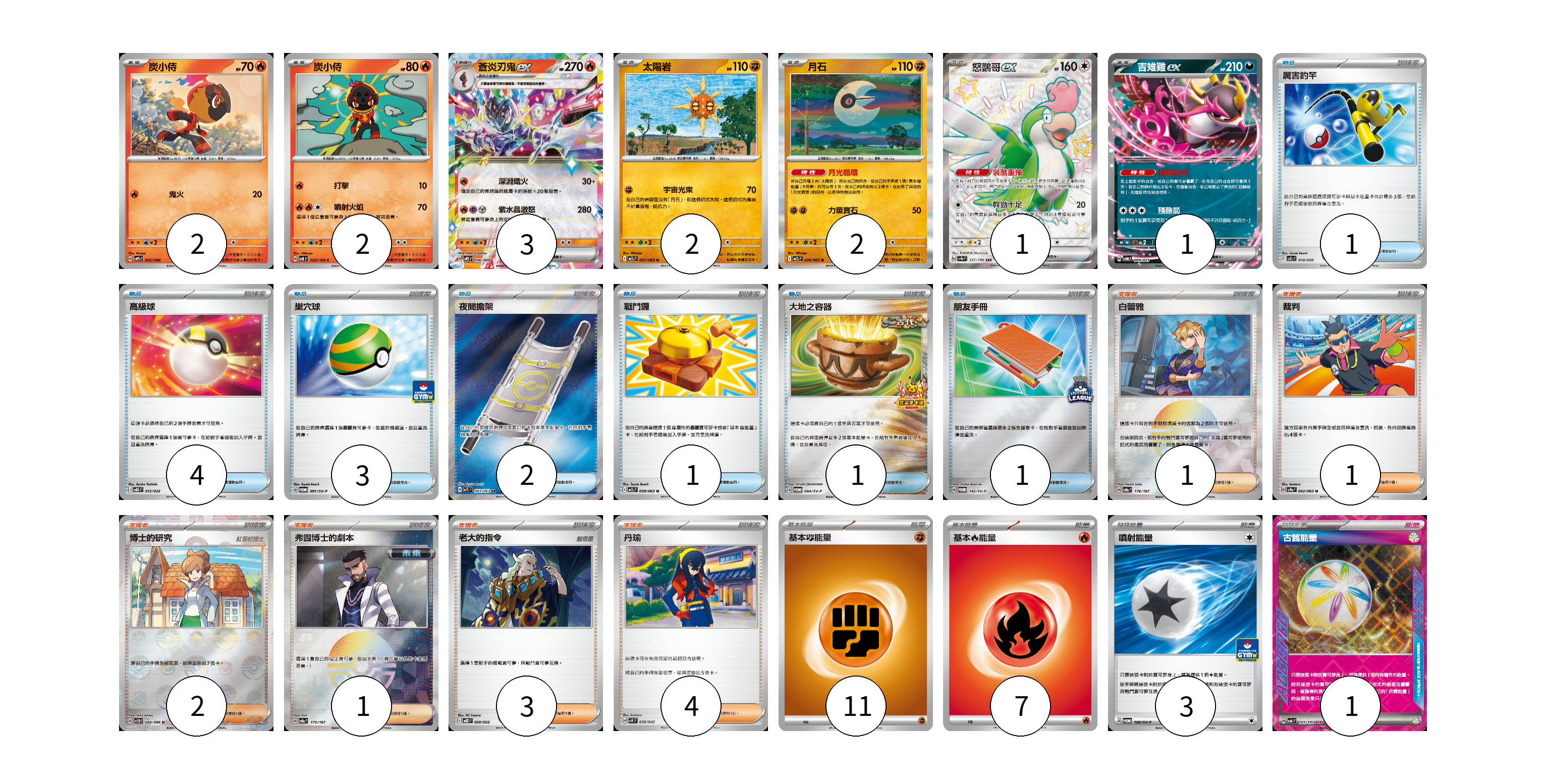 牌組構築方案 以此牌組為基礎新構築牌組 顯示卡面 顯示列表 寶可夢卡(14) 2 2 3 2 2 1 1 1 物品卡(12) 4 3 2 1 1 1 支援者卡(12) 1 1 2 1 3 4 能量卡(22) 11 7 3 1 寶可夢卡(14) 卡牌名稱 張數 卡牌名稱 張數 炭小侍 SVPS 005/008 02 炭小侍 SV8 020/106 02 蒼炎刃鬼ex SVPS 006/008 03 太陽岩 M1L 027/063 02 月石 M1L 026/063 02 怒鸚哥ex SV4a 337/190 01 吉雉雞ex SVOM 009/021 01 厲害釣竿 SVEL 010/020 01 物品卡(12) 卡牌名稱 張數 卡牌名稱 張數 高級球 MBG 012/022 04 巢穴球 SV-P 091/SV-P 03 夜間擔架 M1L 083/063 02 戰鬥鑼 M1L 059/063 01 大地之容器 SV-P 084/SV-P 01 朋友手冊 SV-P 182/SV-P 01 支援者卡(12) 卡牌名稱 張數 卡牌名稱 張數 白蕾雅 SV8a 176/187 01 裁判 SV9a 062/063 01 博士的研究 SV11B 084/086 02 弗圖博士的劇本 SV8a 175/187 01 老大的指令 MBD 020/022 03 丹瑜 SVK 030/042 04 能量卡(22) 卡牌名稱 張數 卡牌名稱 張數 基本【鬥】能量 SVAM FIG 11 基本火能量 sv-p FIR 07 噴射能量 SV-P 180/SV-P 03 古舊能量 SV6 101/101 01 以此牌組為基礎新構築牌組 牌組編碼 TqQPWj-rphZgY-NUIoqh copy 列印牌組單 牌組編碼已複製 分享至SNS