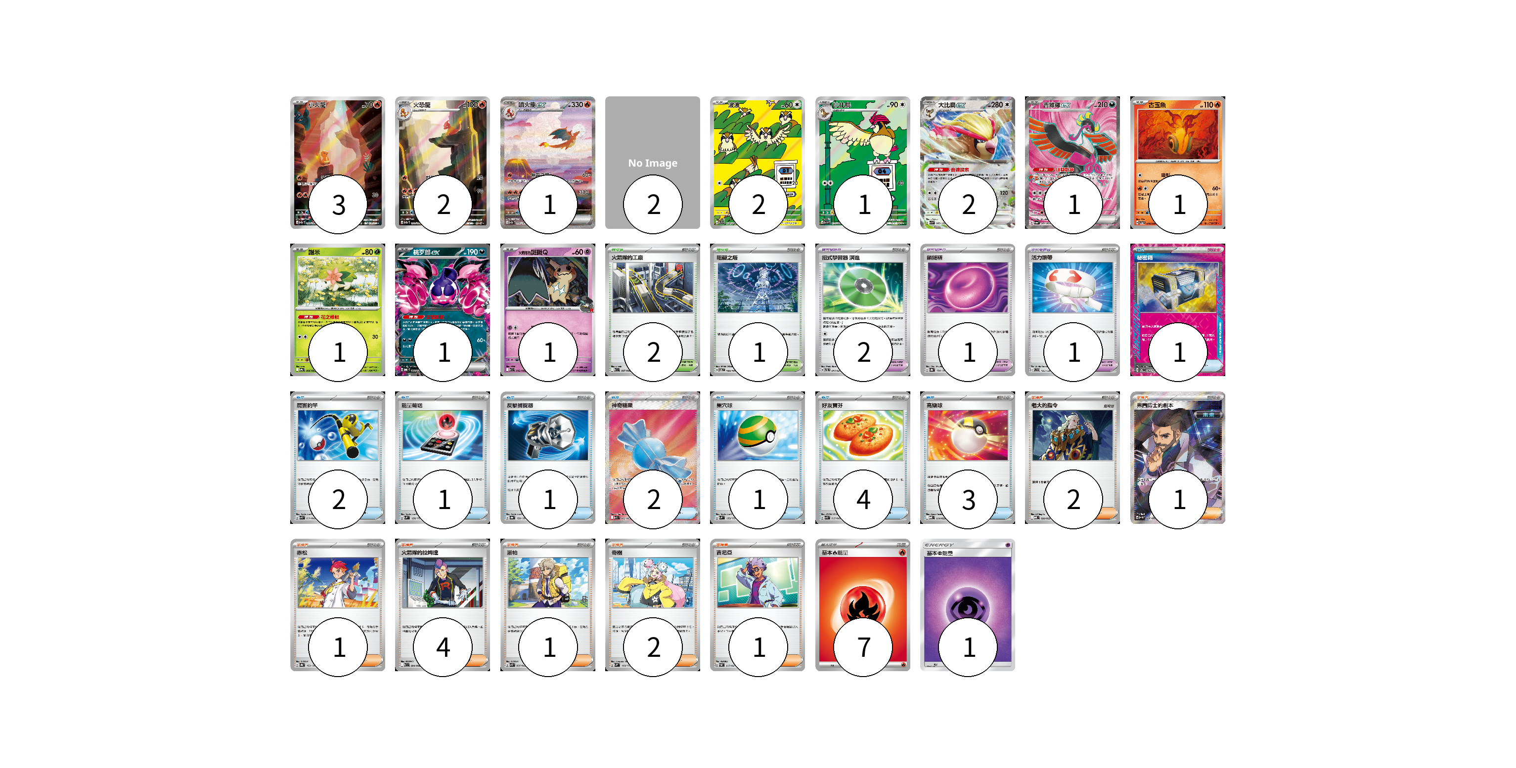 牌組構築方案 以此牌組為基礎新構築牌組 顯示卡面 顯示列表 寶可夢卡(16) 3 2 1 2 1 2 1 1 1 1 1 寶可夢道具(4) 2 1 1 物品卡(15) 1 2 1 1 2 1 4 3 支援者卡(12) 2 1 1 4 1 2 1 競技場卡(3) 2 1 能量卡(8) 7 1 寶可夢卡(16) 卡牌名稱 張數 卡牌名稱 張數 小火龍 SV2a 168/165 03 火恐龍 SV2a 169/165 02 噴火龍ex SV2a 201/165 01 波波 SV3 118/108 02 比比鳥 SV3 119/108 01 大比鳥ex SV3 089/108 02 吉雉雞ex SV6a 081/064 01 古玉魚 SV5a 018/066 01 謝米 SV9a 006/063 01 桃歹郎ex MBG 009/022 01 <火箭隊的>謎擬Q SV10 042/098 01 寶可夢道具(4) 卡牌名稱 張數 卡牌名稱 張數 招式學習器 演進 SVTL 017/021 02 鎖鏈糬 SV8a 154/187 01 活力頭帶 SVD 125/139 01 物品卡(15) 卡牌名稱 張數 卡牌名稱 張數 秘密箱 SV6 092/101 01 厲害釣竿 SVK 011/042 02 能量輸送 SVM 128/175 01 反擊捕捉器 SV8a 139/187 01 神奇糖果 M1S 082/063 02 巢穴球 SVM 133/175 01 好友寶芬 SVK 015/042 04 高級球 MBD 014/022 03 支援者卡(12) 卡牌名稱 張數 卡牌名稱 張數 老大的指令 MBD 020/022 02 弗圖博士的劇本 SV4M 086/066 01 赤松 SV8a 163/187 01 火箭隊的拉姆達 SV10 094/098 04 派帕 SVK 035/042 01 奇樹 SVM 160/175 02 吉尼亞 SVAL 017/021 01 競技場卡(3) 卡牌名稱 張數 卡牌名稱 張數 火箭隊的工廠 SV10 097/098 02 阻礙之塔 SV6 100/101 01 能量卡(8) 卡牌名稱 張數 卡牌名稱 張數 基本火能量 sv-p FIR 07 基本超能量 AS6D PSY 01 以此牌組為基礎新構築牌組 牌組編碼 TqUTId-CHJgJy-UwXzuk copy 列印牌組單 牌組編碼已複製 分享至SNS