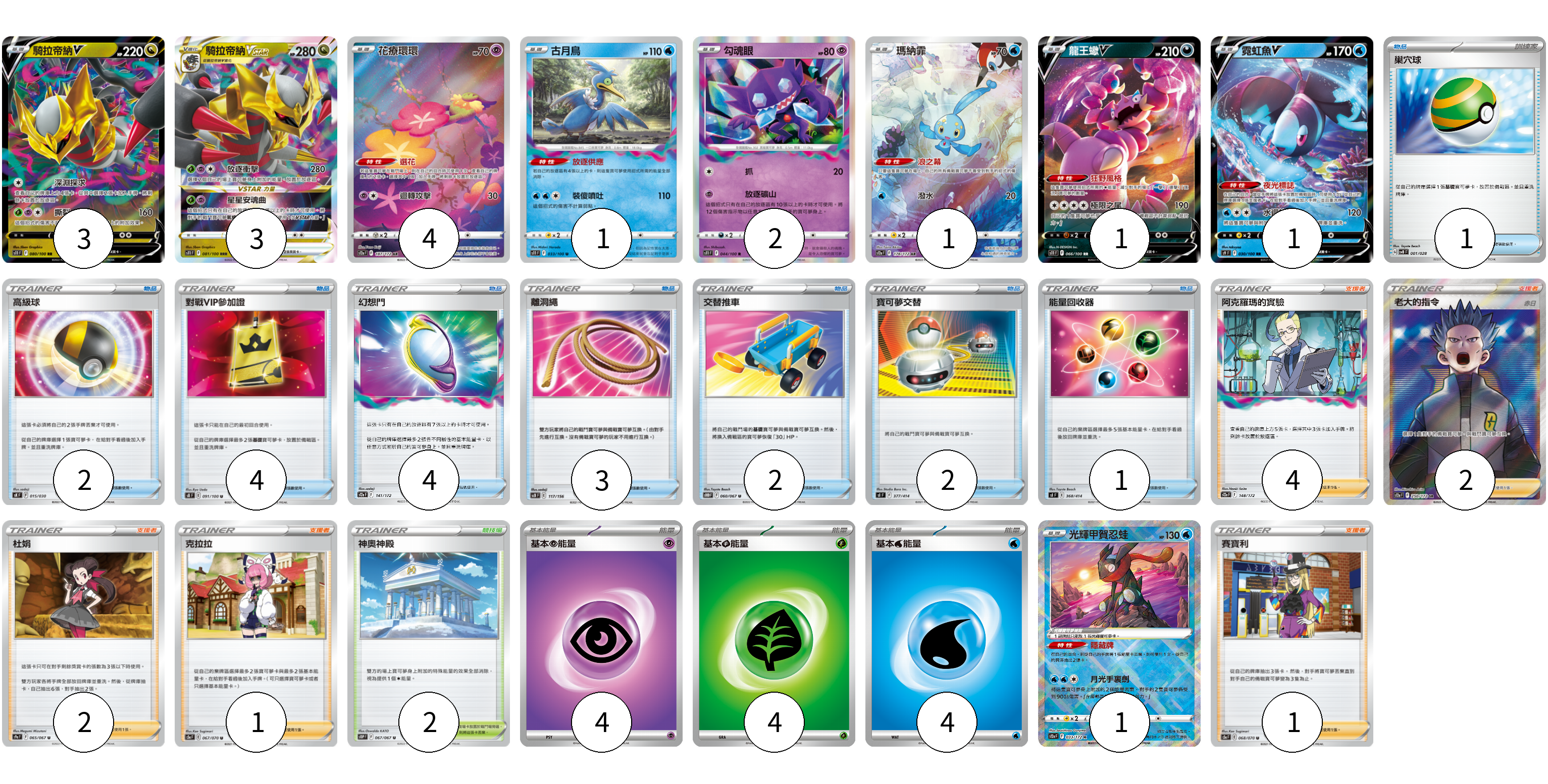 牌組構築方案 以此牌組為基礎新構築牌組 顯示卡面 顯示列表 寶可夢卡(17) 3 3 4 1 2 1 1 1 1 物品卡(19) 1 2 4 4 3 2 2 1 支援者卡(10) 4 2 2 1 1 競技場卡(2) 2 能量卡(12) 4 4 4 寶可夢卡(17) 卡牌名稱 張數 卡牌名稱 張數 騎拉帝納V S11 080/100 03 騎拉帝納VSTAR S11 081/100 03 花療環環 S12a 187/172 04 古月鳥 S11 033/100 01 勾魂眼 S11 044/100 02 瑪納霏 S12a 178/172 01 龍王蠍V S11 066/100 01 霓虹魚V S9 030/100 01 光輝甲賀忍蛙 S12a 033/172 01 物品卡(19) 卡牌名稱 張數 卡牌名稱 張數 巢穴球 SVB 001/028 01 高級球 SK 015/030 02 對戰VIP參加證 S8 091/100 04 幻想門 S12a 141/172 04 離洞繩 SCB 117/156 03 交替推車 S10D 060/067 02 寶可夢交替 SI 377/414 02 能量回收器 SI 368/414 01 支援者卡(10) 卡牌名稱 張數 卡牌名稱 張數 阿克羅瑪的實驗 S12a 148/172 04 老大的指令(赤日) S12a 250/172 02 杜娟 S9a 065/067 02 克拉拉 S5a 067/070 01 賽寶利 S5a 068/070 01 競技場卡(2) 卡牌名稱 張數 卡牌名稱 張數 神奧神殿 S10P 067/067 02 能量卡(12) 卡牌名稱 張數 卡牌名稱 張數 基本【超】能量 SVAW PSY 04 基本【草】能量 SVAM GRA 04 基本【水】能量 SVAW WAT 04 以此牌組為基礎新構築牌組 牌組編碼 TqbwcY-qgaszJ-tqaOyM copy 列印牌組單 牌組編碼已複製 分享至SNS
