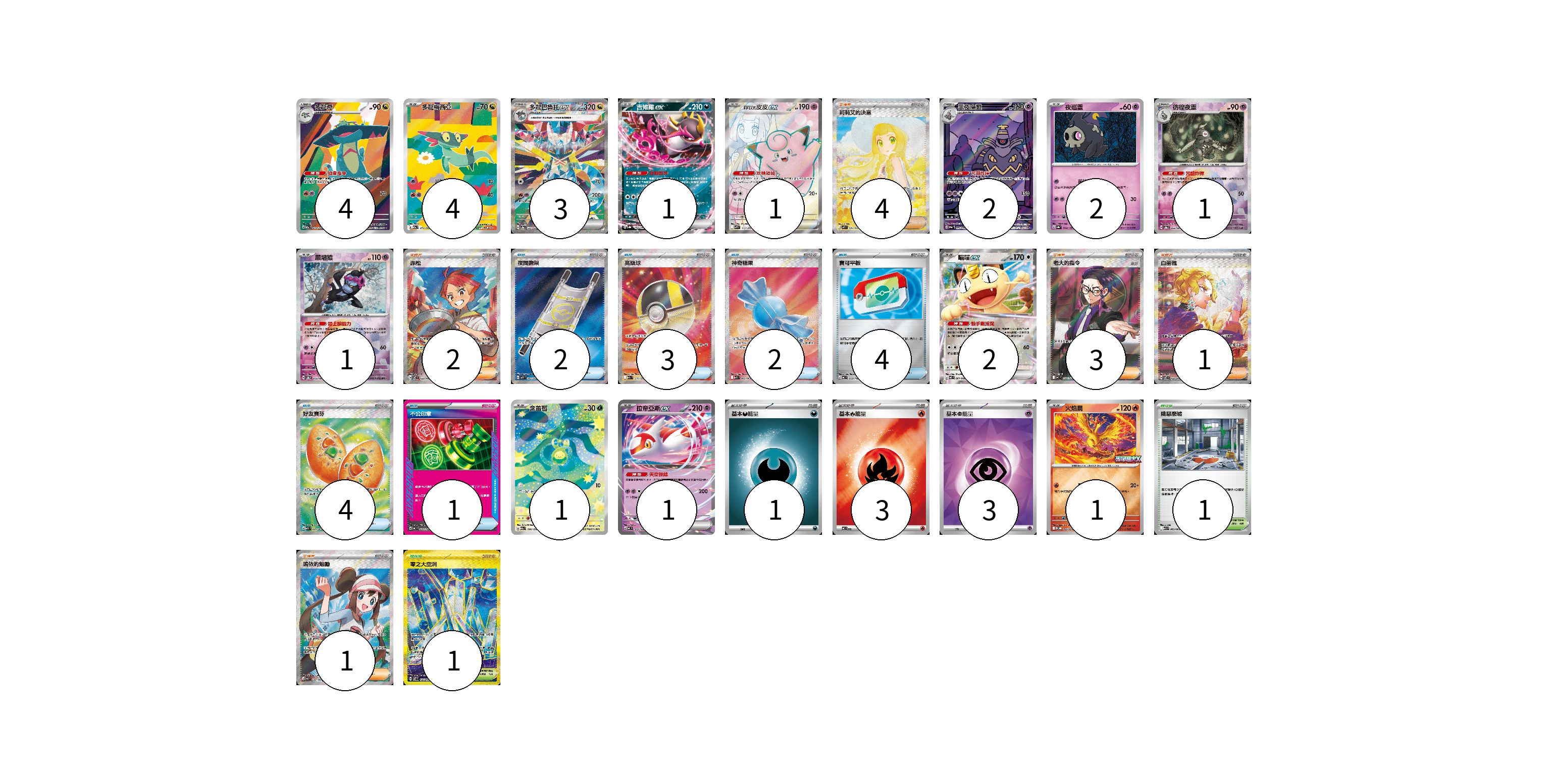 牌組構築方案 以此牌組為基礎新構築牌組 顯示卡面 顯示列表 寶可夢卡(24) 4 4 3 1 1 2 2 1 1 2 1 1 1 物品卡(16) 2 3 2 4 4 1 支援者卡(11) 4 2 3 1 1 競技場卡(2) 1 1 能量卡(7) 1 3 3 寶可夢卡(24) 卡牌名稱 張數 卡牌名稱 張數 多龍奇 M2a 212/193 04 多龍梅西亞 M2a 211/193 04 多龍巴魯托ex SV8a 221/187 03 吉雉雞ex SV8a 104/187 01 莉莉艾的皮皮ex SV9 115/100 01 黑夜魔靈 SV6a 070/064 02 夜巡靈 SV8a 064/187 02 彷徨夜靈 SV8a 065/187 01 願增猿 SV8a 075/187 01 喵喵ex M3 061/080 02 含羞苞 M2a 196/193 01 拉帝亞斯ex MC 312/742 01 火焰鳥 M-P 022/M-P 01 物品卡(16) 卡牌名稱 張數 卡牌名稱 張數 夜間擔架 M1L 083/063 02 高級球 M2a 216/193 03 神奇糖果 M1S 082/063 02 寶可平板 MC 662/742 04 好友寶芬 M1S 081/063 04 不公印章 MC 633/742 01 支援者卡(11) 卡牌名稱 張數 卡牌名稱 張數 莉莉艾的決意 M1L 091/063 04 赤松 SV7 123/102 02 老大的指令(烏羽) MC 760/742 03 白蕾雅 SV7 132/102 01 鳴依的勉勵 M3 107/080 01 競技場卡(2) 卡牌名稱 張數 卡牌名稱 張數 險惡廢墟 M1L 063/063 01 零之大空洞 SV7 135/102 01 能量卡(7) 卡牌名稱 張數 卡牌名稱 張數 基本【惡】能量 MC DAR 01 基本【火】能量 MC FIR 03 基本【超】能量 SVOD PSY 03 以此牌組為基礎新構築牌組 牌組編碼 TqqGOL-SiguzL-hpZrzC copy 列印牌組單 牌組編碼已複製 分享至SNS