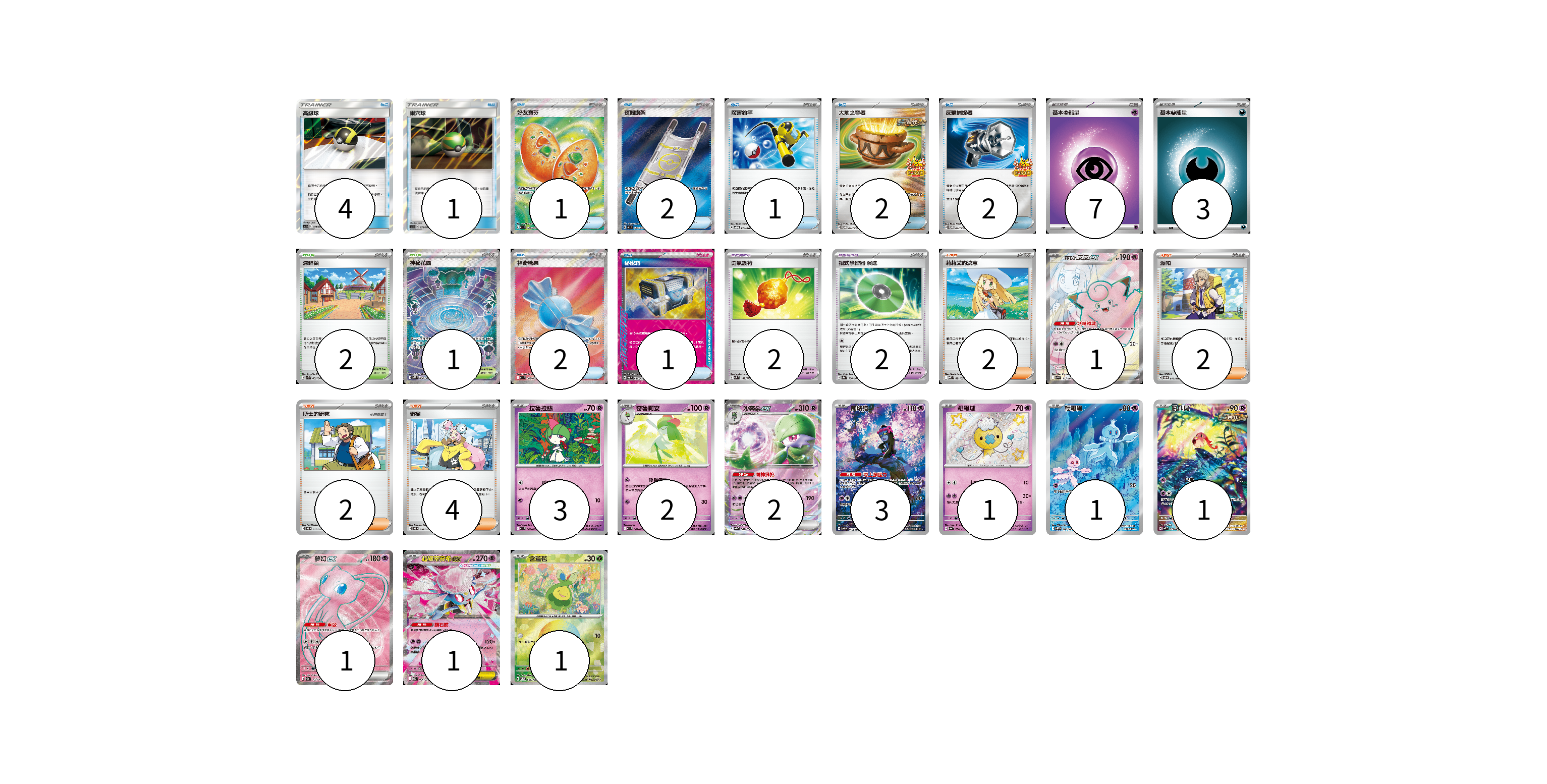 牌組構築方案 以此牌組為基礎新構築牌組 顯示卡面 顯示列表 寶可夢卡(17) 1 3 2 2 3 1 1 1 1 1 1 寶可夢道具(4) 2 2 物品卡(16) 4 1 1 2 1 2 2 2 1 支援者卡(10) 2 2 2 4 競技場卡(3) 2 1 能量卡(10) 7 3 寶可夢卡(17) 卡牌名稱 張數 卡牌名稱 張數 莉莉艾的皮皮ex SV9 115/100 01 拉魯拉絲 M1S 040/063 03 奇魯莉安 M1S 041/063 02 沙奈朵ex SV4a 082/190 02 願增猿 SV6 107/101 03 飄飄球 SV4a 260/190 01 輕飄飄 SV11W 124/086 01 吼叫尾 SV4K 071/066 01 夢幻ex SV2a 195/165 01 超級蒂安希ex MBD 006/022 01 含羞苞 SV8a 001/187 01 寶可夢道具(4) 卡牌名稱 張數 卡牌名稱 張數 勇氣護符 SVM 142/175 02 招式學習器 演進 SV8a 160/187 02 物品卡(16) 卡牌名稱 張數 卡牌名稱 張數 高級球 AS5b 178/186 04 巢穴球 AS5a 178/184 01 好友寶芬 M1S 081/063 01 夜間擔架 M1L 083/063 02 厲害釣竿 SVOD 010/020 01 大地之容器 SV-P 084/SV-P 02 反擊捕捉器 SV-P 083/SV-P 02 神奇糖果 M1S 082/063 02 秘密箱 SV6 092/101 01 支援者卡(10) 卡牌名稱 張數 卡牌名稱 張數 莉莉艾的決意 MBD 021/022 02 派帕 SVOD 018/020 02 博士的研究 SVOD 017/020 02 奇樹 SVOD 016/020 04 競技場卡(3) 卡牌名稱 張數 卡牌名稱 張數 深缽鎮 SVK 039/042 02 神秘花園 M1S 086/063 01 能量卡(10) 卡牌名稱 張數 卡牌名稱 張數 基本【超】能量 MBD PSY 07 基本【惡】能量 MBG DAR 03 以此牌組為基礎新構築牌組 牌組編碼 TsEnwa-GywWtO-qGaPBn copy 列印牌組單 牌組編碼已複製 分享至SNS