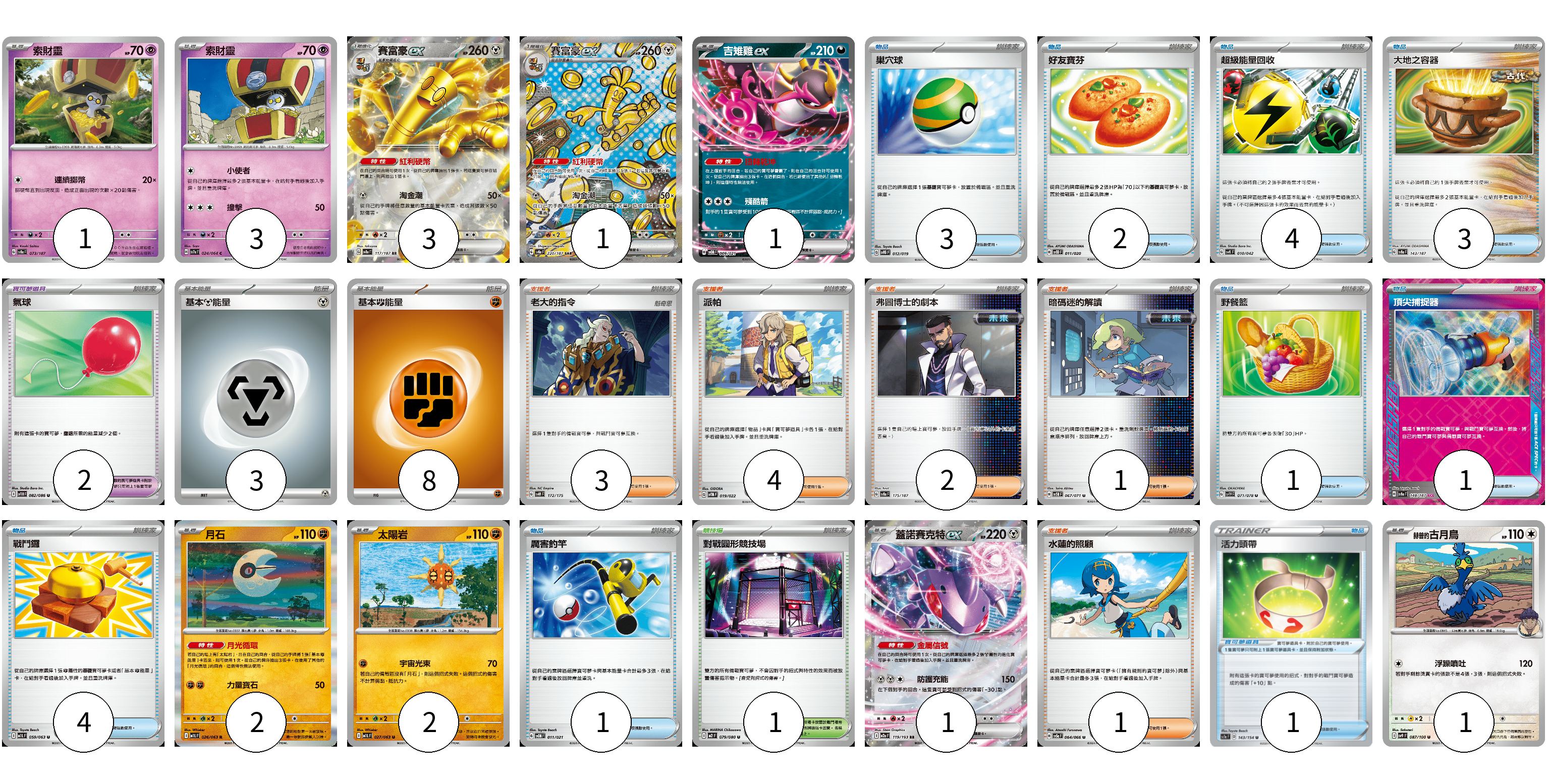 牌組構築方案 以此牌組為基礎新構築牌組 顯示卡面 顯示列表 寶可夢卡(15) 1 3 3 1 1 2 2 1 1 寶可夢道具(3) 2 1 物品卡(19) 3 2 4 3 1 1 4 1 支援者卡(11) 3 4 2 1 1 競技場卡(1) 1 能量卡(11) 3 8 寶可夢卡(15) 卡牌名稱 張數 卡牌名稱 張數 索財靈 SV8a 073/187 01 索財靈 SV7a 024/064 03 賽富豪ex SV8a 117/187 03 賽富豪ex SV8a 220/187 01 吉雉雞ex SVOM 009/021 01 月石 M1L 026/063 02 太陽岩 M1L 027/063 02 蓋諾賽克特ex M2a 119/193 01 赫普的古月鳥 SV9 087/100 01 寶可夢道具(3) 卡牌名稱 張數 卡牌名稱 張數 氣球 SV11B 082/086 02 活力頭帶 SC1a 143/154 01 物品卡(19) 卡牌名稱 張數 卡牌名稱 張數 巢穴球 SVTG 012/019 03 好友寶芬 SVOD 011/020 02 超級能量回收 SVK 010/042 04 大地之容器 SV8a 143/187 03 野餐籃 SV1V 071/078 01 頂尖捕捉器 SV8a 148/187 01 戰鬥鑼 M1L 059/063 04 厲害釣竿 SVOM 011/021 01 支援者卡(11) 卡牌名稱 張數 卡牌名稱 張數 老大的指令 SVM 172/175 03 派帕 SVTM 019/022 04 弗圖博士的劇本 SV8a 175/187 02 暗碼迷的解讀 SV5M 067/071 01 水蓮的照顧 SV5a 064/066 01 競技場卡(1) 卡牌名稱 張數 卡牌名稱 張數 對戰圓形競技場 M2 079/080 01 能量卡(11) 卡牌名稱 張數 卡牌名稱 張數 基本鋼能量 sv-p MET 03 基本【鬥】能量 SVHK FIG 08 以此牌組為基礎新構築牌組 牌組編碼 TuqOrf-QMNPmI-uGGeaC copy 列印牌組單 牌組編碼已複製 分享至SNS