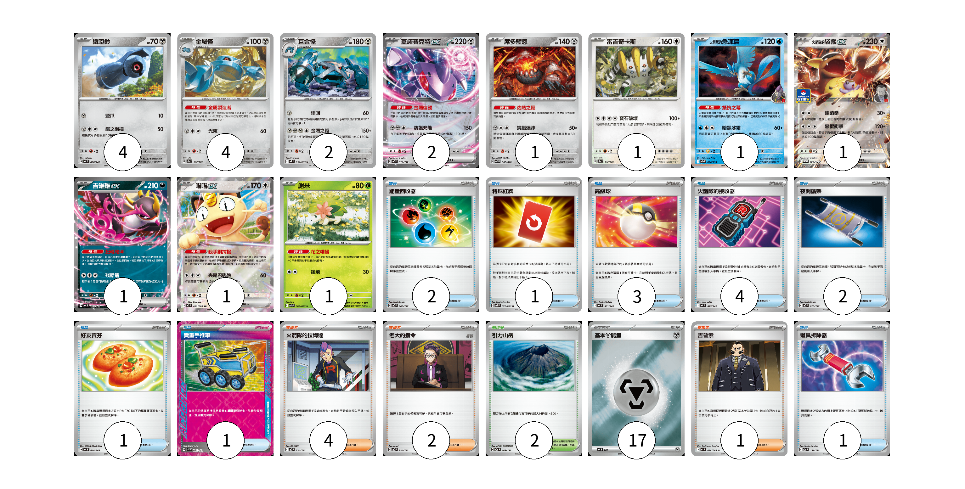 牌組構築方案 以此牌組為基礎新構築牌組 顯示卡面 顯示列表 寶可夢卡(19) 4 4 2 2 1 1 1 1 1 1 1 物品卡(15) 2 1 3 4 2 1 1 1 支援者卡(7) 4 2 1 競技場卡(2) 2 能量卡(17) 17 寶可夢卡(19) 卡牌名稱 張數 卡牌名稱 張數 鐵啞鈴 MC 496/742 04 金屬怪 SV8a 107/187 04 巨金怪 M4 059/083 02 蓋諾賽克特ex MC 512/742 02 席多藍恩 SVTH 005/018 01 雷吉奇卡斯 SV8a 132/187 01 <火箭隊的>急凍鳥 M2a 034/193 01 <火箭隊的>袋獸ex SV-P 226/SV-P 01 吉雉雞ex MC 489/742 01 喵喵ex M3 061/080 01 謝米 SV9a 006/063 01 物品卡(15) 卡牌名稱 張數 卡牌名稱 張數 能量回收器 MC 640/742 02 特殊紅牌 M4 072/083 01 高級球 MC 651/742 03 火箭隊的接收器 MC 675/742 04 夜間擔架 MC 670/742 02 好友寶芬 MC 648/742 01 貴重手推車 SVK 020/042 01 道具拆除器 M2a 151/193 01 支援者卡(7) 卡牌名稱 張數 卡牌名稱 張數 火箭隊的拉姆達 MC 734/742 04 老大的指令 MC 724/742 02 吉普索 M4 076/083 01 競技場卡(2) 卡牌名稱 張數 卡牌名稱 張數 引力山岳 M2a 183/193 02 能量卡(17) 卡牌名稱 張數 卡牌名稱 張數 基本【鋼】能量 MC MET 17 以此牌組為基礎新構築牌組 牌組編碼 TvAcqR-HjOLQO-BYfjdq copy 列印牌組單 牌組編碼已複製 分享至SNS