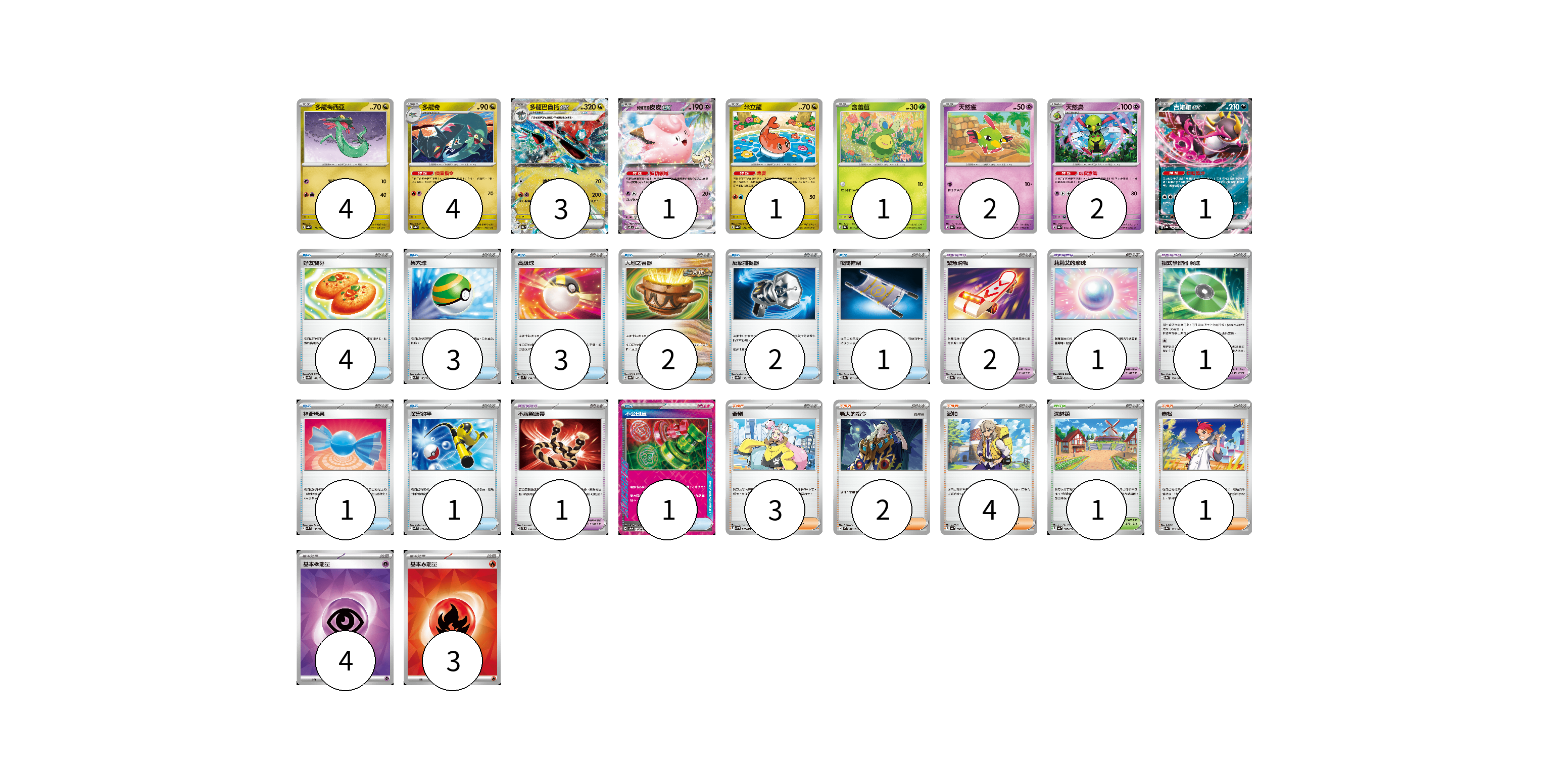 牌組構築方案 以此牌組為基礎新構築牌組 顯示卡面 顯示列表 寶可夢卡(19) 4 4 3 1 1 1 2 2 1 寶可夢道具(5) 2 1 1 1 物品卡(18) 4 3 3 2 2 1 1 1 1 支援者卡(10) 3 2 4 1 競技場卡(1) 1 能量卡(7) 4 3 寶可夢卡(19) 卡牌名稱 張數 卡牌名稱 張數 多龍梅西亞 SV8a 118/187 04 多龍奇 SV8a 119/187 04 多龍巴魯托ex SV8a 120/187 03 莉莉艾的皮皮ex SV9 033/100 01 米立龍 SV8a 121/187 01 含羞苞 SV8a 001/187 01 天然雀 SV8a 060/187 02 天然鳥 SV8a 061/187 02 吉雉雞ex SV8a 104/187 01 寶可夢道具(5) 卡牌名稱 張數 卡牌名稱 張數 緊急滑板 SV8a 153/187 02 莉莉艾的珍珠 SV9 093/100 01 招式學習器 演進 SV8a 160/187 01 不服輸頭帶 SVTL 016/021 01 物品卡(18) 卡牌名稱 張數 卡牌名稱 張數 好友寶芬 SV8a 147/187 04 巢穴球 SVM 133/175 03 高級球 SVM 134/175 03 大地之容器 SV8a 143/187 02 反擊捕捉器 SV8a 139/187 02 夜間擔架 SV8a 151/187 01 神奇糖果 SVM 135/175 01 厲害釣竿 SVK 011/042 01 不公印章 SV5a 053/066 01 支援者卡(10) 卡牌名稱 張數 卡牌名稱 張數 奇樹 SVHM 018/022 03 老大的指令 SVHM 022/022 02 派帕 SV4a 180/190 04 赤松 SV8a 163/187 01 競技場卡(1) 卡牌名稱 張數 卡牌名稱 張數 深缽鎮 SV4a 185/190 01 能量卡(7) 卡牌名稱 張數 卡牌名稱 張數 基本【超】能量 SVK PSY 04 基本【火】能量 SVK FIR 03 以此牌組為基礎新構築牌組 牌組編碼 TxzCag-CycfFw-XwmLdg copy 列印牌組單 牌組編碼已複製 分享至SNS