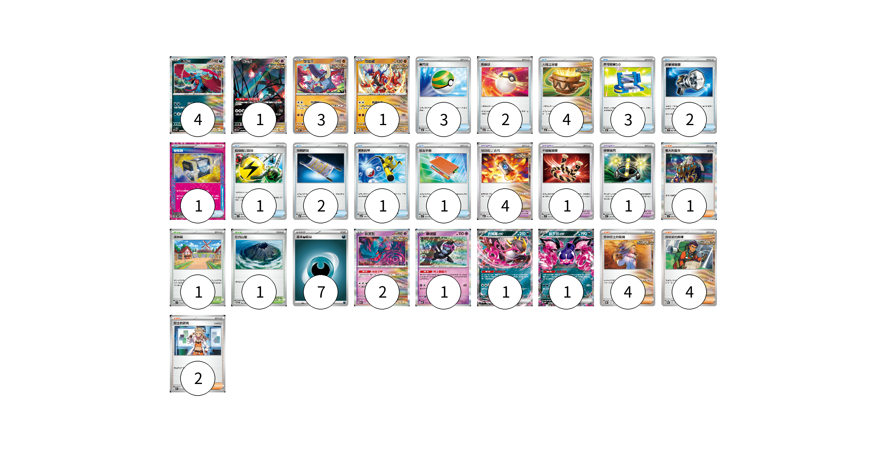 牌組構築方案 以此牌組為基礎新構築牌組 顯示卡面 顯示列表 寶可夢卡(14) 4 1 3 1 2 1 1 1 寶可夢道具(6) 4 1 1 物品卡(20) 3 2 4 3 2 1 1 2 1 1 支援者卡(11) 1 4 4 2 競技場卡(2) 1 1 能量卡(7) 7 寶可夢卡(14) 卡牌名稱 張數 卡牌名稱 張數 轟鳴月 SV5K 051/071 04 振翼髮 SV5K 076/071 01 雄偉牙 SV5K 042/071 03 故勒頓 SV8 069/106 01 振翼髮 SV8a 072/187 02 願增猿 SV8a 075/187 01 吉雉雞ex SV8a 104/187 01 桃歹郎ex SV8a 105/187 01 寶可夢道具(6) 卡牌名稱 張數 卡牌名稱 張數 驅勁能量 古代 SV4K 061/066 04 不服輸頭帶 SV1S 073/078 01 學習裝置 SV1S 072/078 01 物品卡(20) 卡牌名稱 張數 卡牌名稱 張數 巢穴球 SV4a 159/190 03 高級球 SV4a 161/190 02 大地之容器 SV4K 060/066 04 寶可裝置3.0 SVAL 015/021 03 反擊捕捉器 SV4M 059/066 02 秘密箱 SV6 092/101 01 超級能量回收 SV1a 064/073 01 夜間擔架 SV6a 056/064 02 厲害釣竿 SV4a 158/190 01 朋友手冊 SV1S 069/078 01 支援者卡(11) 卡牌名稱 張數 卡牌名稱 張數 老大的指令 SV1a 069/073 01 奧琳博士的氣魄 SV8a 167/187 04 探險家的嚮導 SV8a 172/187 04 博士的研究 SVK 032/042 02 競技場卡(2) 卡牌名稱 張數 卡牌名稱 張數 深缽鎮 SV1a 070/073 01 引力山岳 SV8 106/106 01 能量卡(7) 卡牌名稱 張數 卡牌名稱 張數 基本【惡】能量 SVF DAR 07 以此牌組為基礎新構築牌組 牌組編碼 TypDuW-WnkJMb-ZoQDqW copy 列印牌組單 牌組編碼已複製 分享至SNS