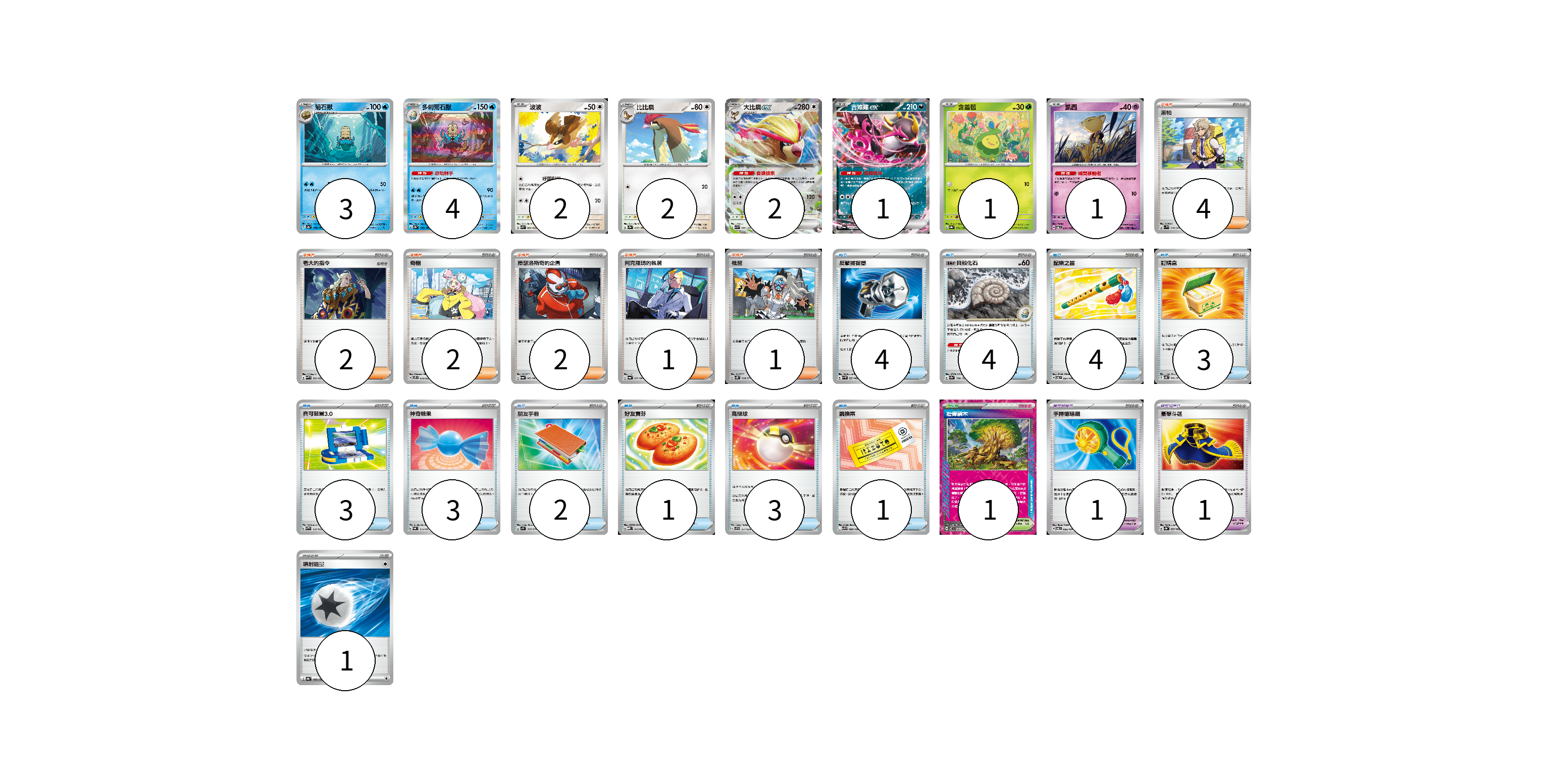 牌組構築方案 以此牌組為基礎新構築牌組 顯示卡面 顯示列表 寶可夢卡(16) 3 4 2 2 2 1 1 1 寶可夢道具(2) 1 1 物品卡(28) 4 4 4 3 3 3 2 1 3 1 支援者卡(12) 4 2 2 2 1 1 競技場卡(1) 1 能量卡(1) 1 寶可夢卡(16) 卡牌名稱 張數 卡牌名稱 張數 菊石獸 SV2a 138/165 03 多刺菊石獸 SV2a 139/165 04 波波 SVK 003/042 02 比比鳥 SV2a 017/165 02 大比鳥ex SV3 089/108 02 吉雉雞ex SV6a 038/064 01 含羞苞 SV8a 001/187 01 凱西 SV6 047/101 01 寶可夢道具(2) 卡牌名稱 張數 卡牌名稱 張數 手持循環扇 SV6 095/101 01 豪華斗篷 SV3a 055/062 01 物品卡(28) 卡牌名稱 張數 卡牌名稱 張數 反擊捕捉器 SV4M 059/066 04 陳舊的貝殼化石 SV2a 154/165 04 配樂之笛 SV6 091/101 04 訂購盒 SV5K 061/071 03 寶可裝置3.0 SVAW 016/023 03 神奇糖果 SVAL 014/021 03 朋友手冊 SV1S 069/078 02 好友寶芬 MBD 013/022 01 高級球 SVF 017/038 03 調換票 SV9 090/100 01 支援者卡(12) 卡牌名稱 張數 卡牌名稱 張數 派帕 SV1V 076/078 04 老大的指令 SVHM 022/022 02 奇樹 SVTS 018/022 02 庫瑟洛斯奇的企圖 SV6a 062/064 02 阿克羅瑪的執著 SV6a 059/064 01 枇琶 SV5K 068/071 01 競技場卡(1) 卡牌名稱 張數 卡牌名稱 張數 壯偉碩木 SV7 101/102 01 能量卡(1) 卡牌名稱 張數 卡牌名稱 張數 噴射能量 SV8a 185/187 01 以此牌組為基礎新構築牌組 牌組編碼 TyqLsD-USXBxA-UnWyoS copy 列印牌組單 牌組編碼已複製 分享至SNS