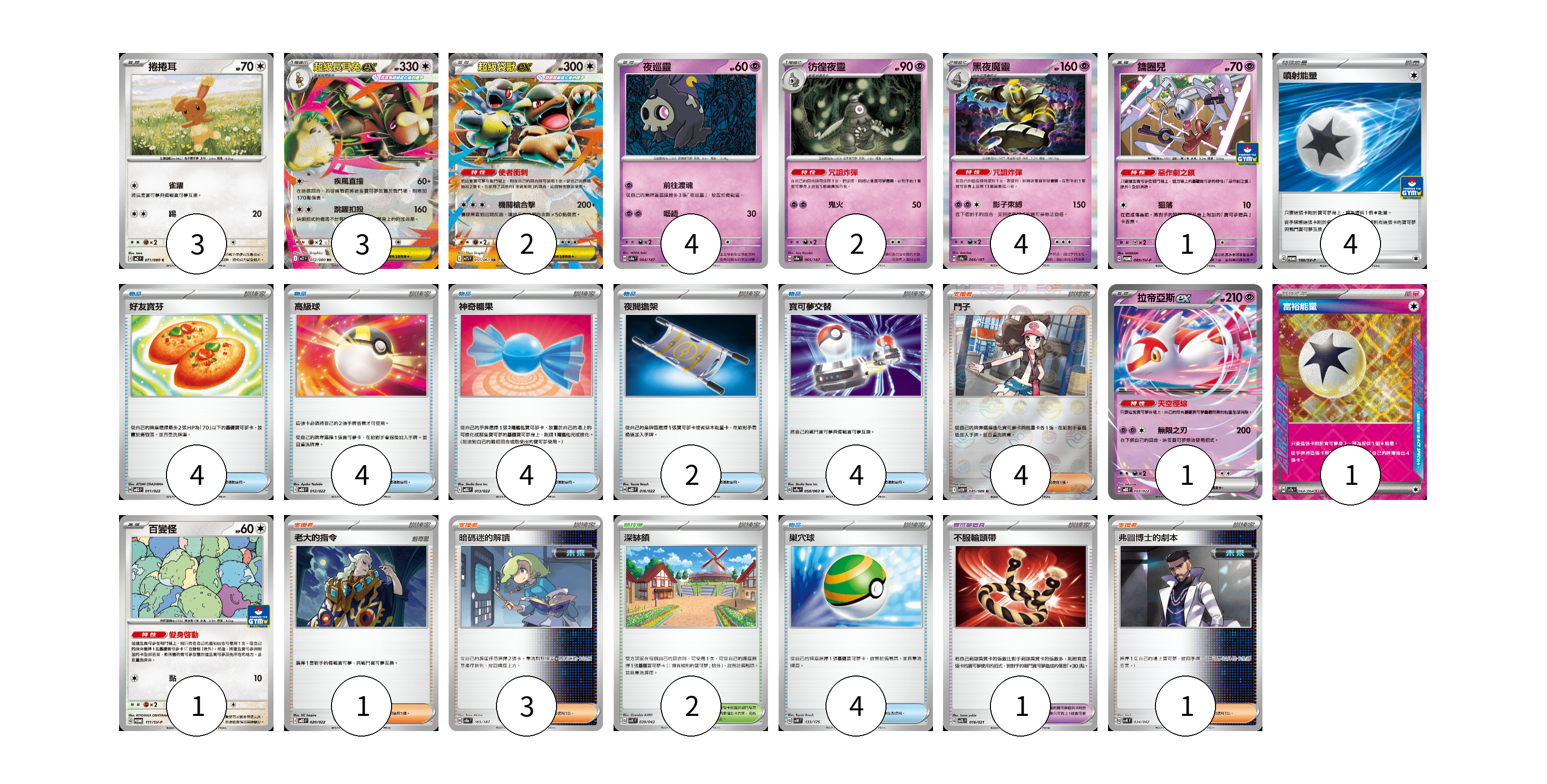 牌組構築方案 以此牌組為基礎新構築牌組 顯示卡面 顯示列表 寶可夢卡(21) 3 3 2 4 2 4 1 1 1 寶可夢道具(1) 1 物品卡(22) 4 4 4 2 4 4 支援者卡(9) 4 1 3 1 競技場卡(2) 2 能量卡(5) 4 1 寶可夢卡(21) 卡牌名稱 張數 卡牌名稱 張數 捲捲耳 M2 071/080 03 超級長耳兔ex M2 072/080 03 超級袋獸ex M1S 051/063 02 夜巡靈 SV8a 064/187 04 彷徨夜靈 SV8a 065/187 02 黑夜魔靈 SV8a 066/187 04 鑰圈兒 SV-P 089/SV-P 01 拉帝亞斯ex MBD 003/022 01 百變怪 SV-P 111/SV-P 01 寶可夢道具(1) 卡牌名稱 張數 卡牌名稱 張數 不服輸頭帶 SVTL 016/021 01 物品卡(22) 卡牌名稱 張數 卡牌名稱 張數 好友寶芬 MBG 011/022 04 高級球 MBG 012/022 04 神奇糖果 MBG 013/022 04 夜間擔架 MBD 016/022 02 寶可夢交替 SV9a 058/063 04 巢穴球 SVM 133/175 04 支援者卡(9) 卡牌名稱 張數 卡牌名稱 張數 鬥子 SV11W 085/086 04 老大的指令 MBD 020/022 01 暗碼迷的解讀 SV8a 165/187 03 弗圖博士的劇本 SVK 034/042 01 競技場卡(2) 卡牌名稱 張數 卡牌名稱 張數 深缽鎮 SVK 039/042 02 能量卡(5) 卡牌名稱 張數 卡牌名稱 張數 噴射能量 SV-P 180/SV-P 04 富裕能量 SV7a 064/064 01 以此牌組為基礎新構築牌組 牌組編碼 TzuPmx-vvOCLH-TLPzUI copy 列印牌組單 牌組編碼已複製 分享至SNS