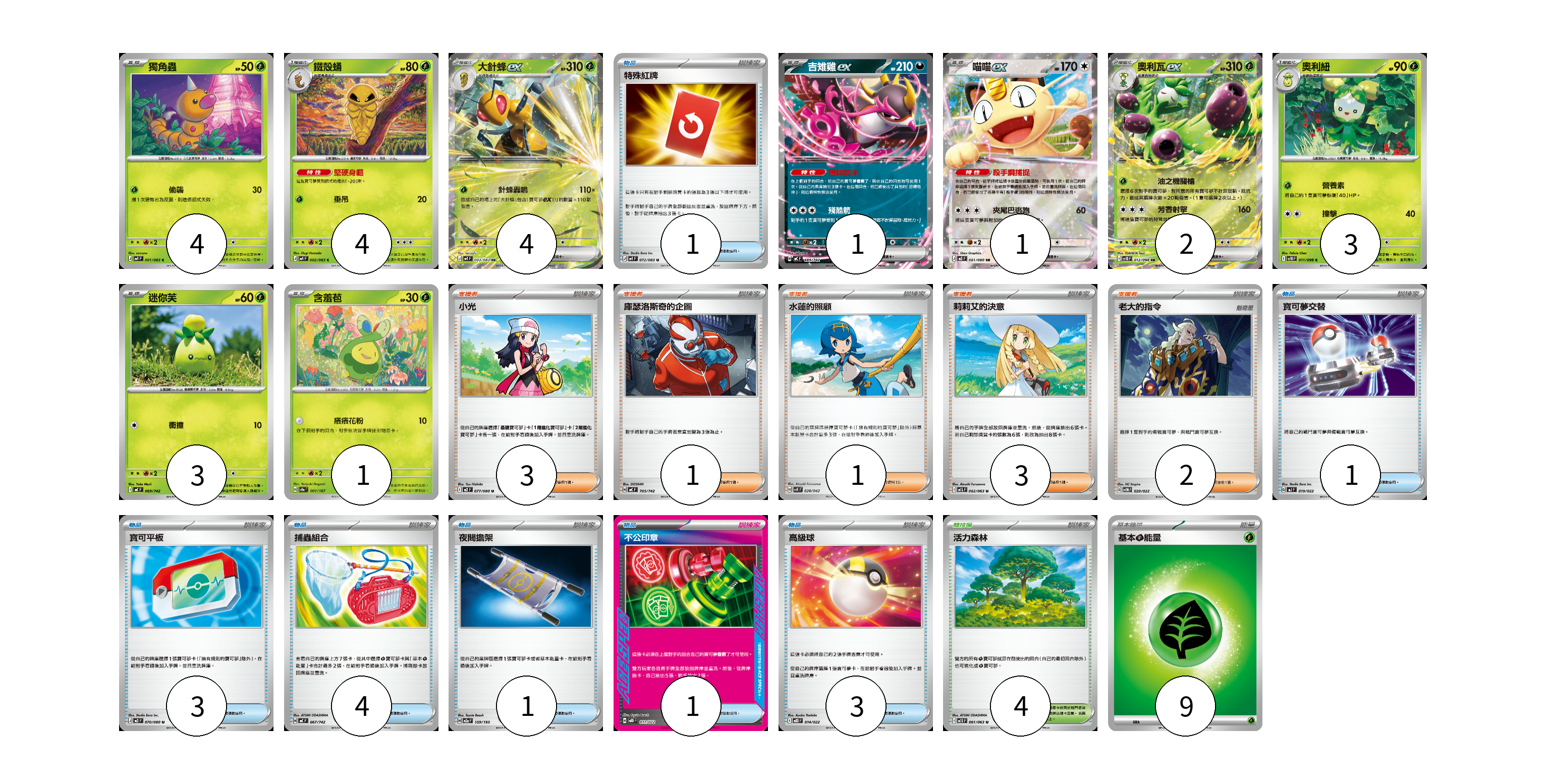 牌組構築方案 以此牌組為基礎新構築牌組 顯示卡面 顯示列表 寶可夢卡(23) 4 4 4 1 1 2 3 3 1 物品卡(14) 1 1 3 4 1 1 3 支援者卡(10) 3 1 1 3 2 競技場卡(4) 4 能量卡(9) 9 寶可夢卡(23) 卡牌名稱 張數 卡牌名稱 張數 獨角蟲 M4 001/083 04 鐵殼蛹 M4 002/083 04 大針蜂ex M4 003/083 04 吉雉雞ex MC 489/742 01 喵喵ex M3 061/080 01 奧利瓦ex SV10 012/098 02 奧利紐 SV10 011/098 03 迷你芙 MC 069/742 03 含羞苞 SV8a 001/187 01 物品卡(14) 卡牌名稱 張數 卡牌名稱 張數 特殊紅牌 M4 072/083 01 寶可夢交替 MJ 019/022 01 寶可平板 M3 070/080 03 捕蟲組合 MC 667/742 04 夜間擔架 M2a 159/193 01 不公印章 MBD 011/022 01 高級球 MBD 014/022 03 支援者卡(10) 卡牌名稱 張數 卡牌名稱 張數 小光 M2 077/080 03 庫瑟洛斯奇的企圖 MC 705/742 01 水蓮的照顧 SVK 028/042 01 莉莉艾的決意 M1L 062/063 03 老大的指令 SVTM 020/022 02 競技場卡(4) 卡牌名稱 張數 卡牌名稱 張數 活力森林 M1S 061/063 04 能量卡(9) 卡牌名稱 張數 卡牌名稱 張數 基本【草】能量 MJ GRA 09 以此牌組為基礎新構築牌組 牌組編碼 UAKgWJ-dHubZc-KawYNi copy 列印牌組單 牌組編碼已複製 分享至SNS