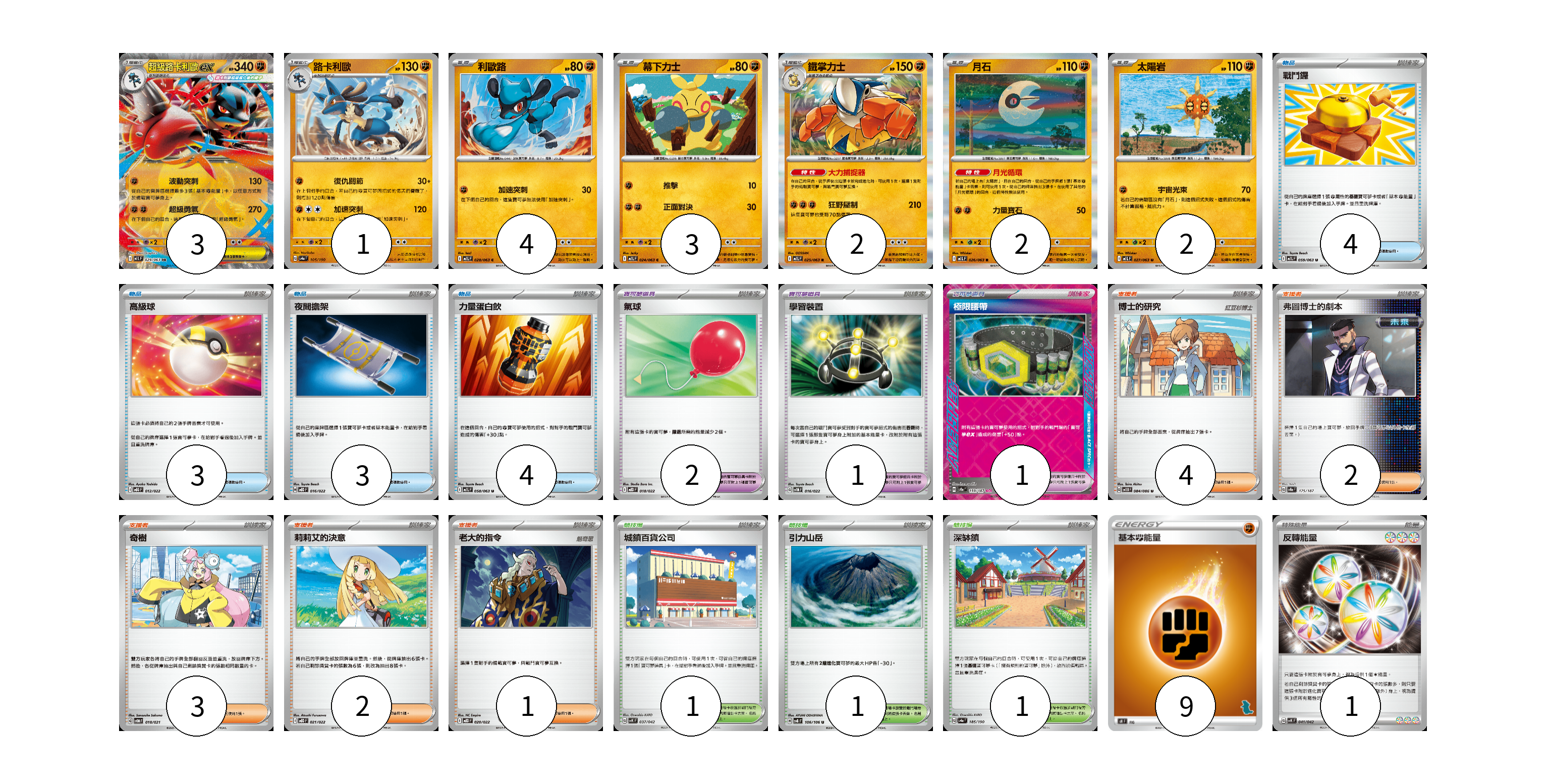牌組構築方案 以此牌組為基礎新構築牌組 顯示卡面 顯示列表 寶可夢卡(17) 3 1 4 3 2 2 2 寶可夢道具(4) 2 1 1 物品卡(14) 4 3 3 4 支援者卡(12) 4 2 3 2 1 競技場卡(3) 1 1 1 能量卡(10) 9 1 寶可夢卡(17) 卡牌名稱 張數 卡牌名稱 張數 超級路卡利歐ex M1L 029/063 03 路卡利歐 SV4a 105/190 01 利歐路 M1L 028/063 04 幕下力士 M1L 024/063 03 鐵掌力士 M1L 025/063 02 月石 M1L 026/063 02 太陽岩 M1L 027/063 02 寶可夢道具(4) 卡牌名稱 張數 卡牌名稱 張數 氣球 MBD 018/022 02 學習裝置 SVTM 016/022 01 極限腰帶 SV8a 159/187 01 物品卡(14) 卡牌名稱 張數 卡牌名稱 張數 戰鬥鑼 M1L 059/063 04 高級球 MBG 012/022 03 夜間擔架 MBD 016/022 03 力量蛋白飲 M1L 058/063 04 支援者卡(12) 卡牌名稱 張數 卡牌名稱 張數 博士的研究 SV11B 084/086 04 弗圖博士的劇本 SV8a 175/187 02 奇樹 SVOM 018/021 03 莉莉艾的決意 MBD 021/022 02 老大的指令 MBD 020/022 01 競技場卡(3) 卡牌名稱 張數 卡牌名稱 張數 城鎮百貨公司 SVK 037/042 01 引力山岳 SV8 106/106 01 深缽鎮 SV4a 185/190 01 能量卡(10) 卡牌名稱 張數 卡牌名稱 張數 基本鬥能量 SH FIG 09 反轉能量 SVK 041/042 01 以此牌組為基礎新構築牌組 牌組編碼 UBIPJD-uQLaNX-pdJKfA copy 列印牌組單 牌組編碼已複製 分享至SNS