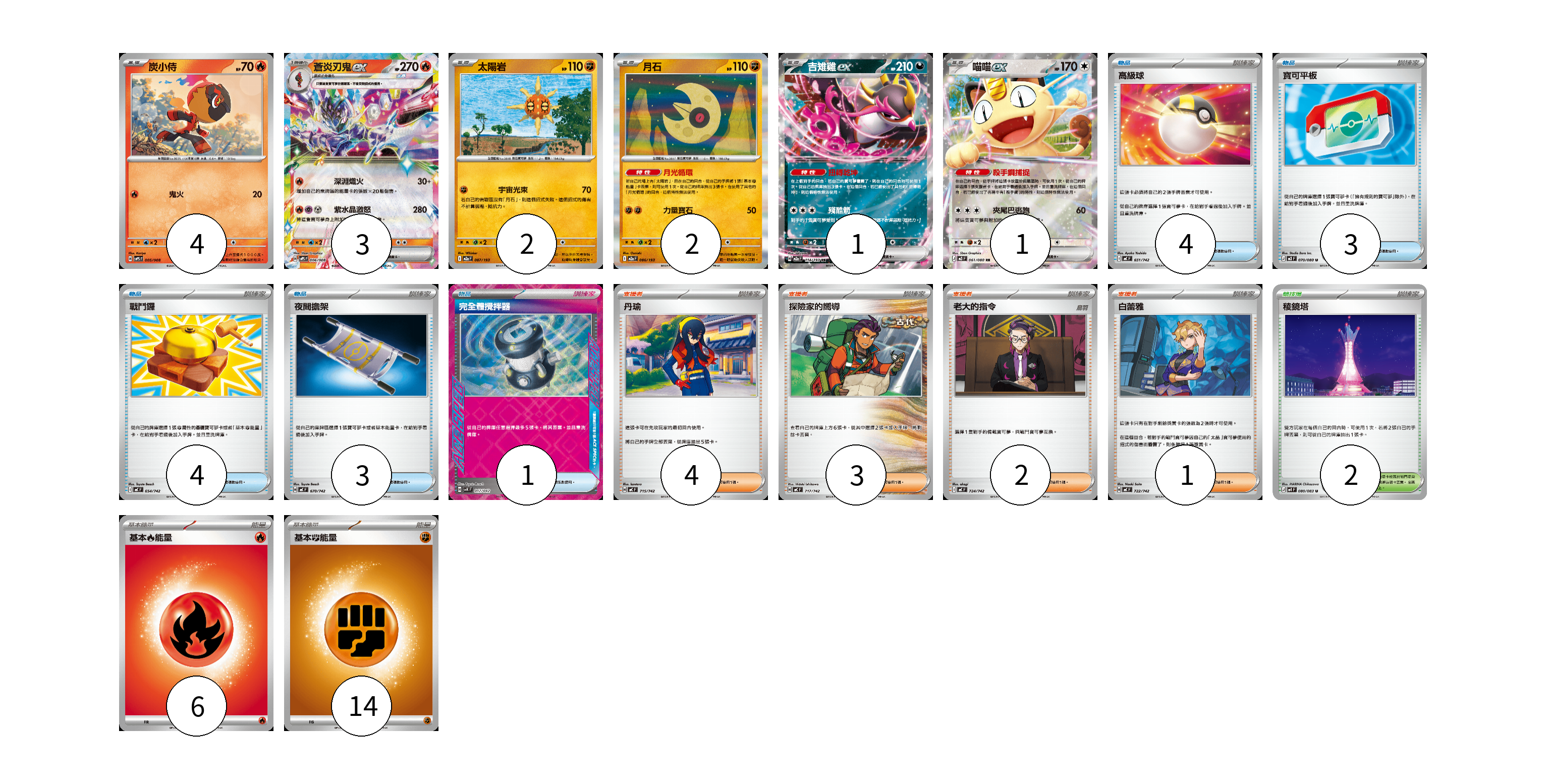 牌組構築方案 以此牌組為基礎新構築牌組 顯示卡面 顯示列表 寶可夢卡(13) 4 3 2 2 1 1 物品卡(15) 4 3 4 3 1 支援者卡(10) 4 3 2 1 競技場卡(2) 2 能量卡(20) 6 14 寶可夢卡(13) 卡牌名稱 張數 卡牌名稱 張數 炭小侍 SVPS 005/008 04 蒼炎刃鬼ex SVPS 006/008 03 太陽岩 M2a 087/193 02 月石 M2a 086/193 02 吉雉雞ex M2a 114/193 01 喵喵ex M3 061/080 01 物品卡(15) 卡牌名稱 張數 卡牌名稱 張數 高級球 MC 651/742 04 寶可平板 M3 070/080 03 戰鬥鑼 MC 654/742 04 夜間擔架 MC 670/742 03 完全體攪拌器 SVK 017/042 01 支援者卡(10) 卡牌名稱 張數 卡牌名稱 張數 丹瑜 MC 715/742 04 探險家的嚮導 MC 717/742 03 老大的指令 MC 724/742 02 白蕾雅 MC 722/742 01 競技場卡(2) 卡牌名稱 張數 卡牌名稱 張數 稜鏡塔 M4 080/083 02 能量卡(20) 卡牌名稱 張數 卡牌名稱 張數 基本【火】能量 MC FIR 06 基本【鬥】能量 MC FIG 14 以此牌組為基礎新構築牌組 牌組編碼 UBpBBu-VoSBJP-SAuWZY copy 列印牌組單 牌組編碼已複製 分享至SNS